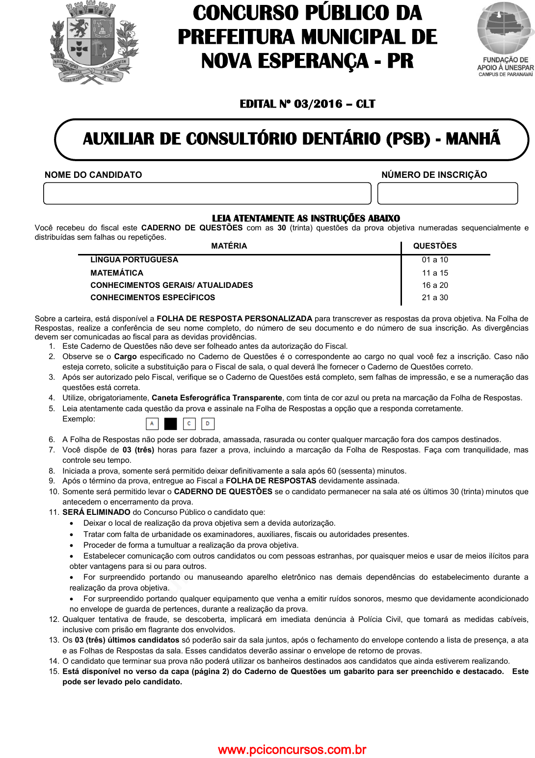 pcimarkpci MDAwMDowMDAwOjAwMDA6MDAwMDowMDAwOmZmZmY6MzZlOTpjMjU5:U2F0LCAxOCBTZXAgMjAyMSAwOToxNToxMCAtMDMwMA== CONCURSO PÚBLICO DA PREFEITURA MUNICIPAL DE NOVA ESPERANÇA - PR EDITAL Nº 03/2016 – CLT NOME DO CANDIDATO NÚMERO DE INSCRIÇÃO LEIA ATENTAMENTE AS INSTRUÇÕES ABAIXO Você recebeu do fiscal este CADERNO DE QUESTÕES com as 30 (trinta) questões da prova objetiva numeradas sequencialmente e distribuídas sem falhas ou repetições. MATÉRIA QUESTÕES LÍNGUA PORTUGUESA 01 a 10 MATEMÁTICA 11 a 15 CONHECIMENTOS GERAIS/ ATUALIDADES 16 a 20 CONHECIMENTOS ESPECÍFICOS 21 a 30 Sobre a carteira, está disponível a FOLHA DE RESPOSTA PERSONALIZADA para transcrever as respostas da prova objetiva. Na Folha de Respostas, realize a conferência de seu nome completo, do número de seu documento e do número de sua inscrição. As divergências devem ser comunicadas ao fiscal para as devidas providências. 1. Este Caderno de Questões não deve ser folheado antes da autorização do Fiscal. 2. Observe se o Cargo especificado no Caderno de Questões é o correspondente ao cargo no qual você fez a inscrição. Caso não esteja correto, solicite a substituição para o Fiscal de sala, o qual deverá lhe fornecer o Caderno de Questões correto. 3. Após ser autorizado pelo Fiscal, verifique se o Caderno de Questões está completo, sem falhas de impressão, e se a numeração das questões está correta. 4. Utilize, obrigatoriamente, Caneta Esferográfica Transparente, com tinta de cor azul ou preta na marcação da Folha de Respostas. 5. Leia atentamente cada questão da prova e assinale na Folha de Respostas a opção que a responda corretamente. Exemplo: 6. A Folha de Respostas não pode ser dobrada, amassada, rasurada ou conter qualquer marcação fora dos campos destinados. 7. Você dispõe de 03 (três) horas para fazer a prova, incluindo a marcação da Folha de Respostas. Faça com tranquilidade, mas controle seu tempo. 8. Iniciada a prova, somente será permitido deixar definitivamente a sala após 60 (sessenta) minutos. 9. Após o término da prova, entregue ao Fiscal a FOLHA DE RESPOSTAS devidamente assinada. 10. Somente será permitido levar o CADERNO DE QUESTÕES se o candidato permanecer na sala até os últimos 30 (trinta) minutos que antecedem o encerramento da prova. 11. SERÁ ELIMINADO do Concurso Público o candidato que: Deixar o local de realização da prova objetiva sem a devida autorização. Tratar com falta de urbanidade os examinadores, auxiliares, fiscais ou autoridades presentes. Proceder de forma a tumultuar a realização da prova objetiva. Estabelecer comunicação com outros candidatos ou com pessoas estranhas, por quaisquer meios e usar de meios ilícitos para obter vantagens para si ou para outros. For surpreendido portando ou manuseando aparelho eletrônico nas demais dependências do estabelecimento durante a realização da prova objetiva. For surpreendido portando qualquer equipamento que venha a emitir ruídos sonoros, mesmo que devidamente acondicionado no envelope de guarda de pertences, durante a realização da prova. 12. Qualquer tentativa de fraude, se descoberta, implicará em imediata denúncia à Polícia Civil, que tomará as medidas cabíveis, inclusive com prisão em flagrante dos envolvidos. 13. Os 03 (três) últimos candidatos só poderão sair da sala juntos, após o fechamento do envelope contendo a lista de presença, a ata e as Folhas de Respostas da sala. Esses candidatos deverão assinar o envelope de retorno de provas. 14. O candidato que terminar sua prova não poderá utilizar os banheiros destinados aos candidatos que ainda estiverem realizando. 15. Está disponível no verso da capa (página 2) do Caderno de Questões um gabarito para ser preenchido e destacado. Este pode ser levado pelo candidato. AUXILIAR DE CONSULTÓRIO DENTÁRIO (PSB) - MANHÃ www.pciconcursos.com.br pcimarkpci MDAwMDowMDAwOjAwMDA6MDAwMDowMDAwOmZmZmY6MzZlOTpjMjU5:U2F0LCAxOCBTZXAgMjAyMSAwOToxNToxMCAtMDMwMA== RASCUNHO DESTAQUE AQUI ……………………………………………………………………………………………………………………………………………………. GABARITO Concurso Público da Prefeitura Municipal de Nova Esperança - PR http://www.fundacaofafipa.org.br/concurso 1 2 3 4 5 6 7 8 9 10 11 12 13 14 15 16 17 18 19 20 21 22 23 24 25 26 27 28 29 30 www.pciconcursos.com.br pcimarkpci MDAwMDowMDAwOjAwMDA6MDAwMDowMDAwOmZmZmY6MzZlOTpjMjU5:U2F0LCAxOCBTZXAgMjAyMSAwOToxNToxMCAtMDMwMA== Cargo: AUXILIAR DE CONSULTÓRIO DENTÁRIO (PSB) Página - 3 - LÍNGUA PORTUGUESA Dado o texto para as questões 1 a 6. O marido do dr. Pompeu Ninguém estranhou quando, depois de vinte e cinco anos de casamento, filhos criados, a mulher do dr. Pompeu pediu divórcio. As razões dela eram normais para a época: não queria mais ser apenas uma dona de casa. Queria viver sua própria vida, estudar psicologia, ter sua própria carreira. Tudo bem. O escândalo, para mostrar como ainda existem preconceitos, foi quando souberam que o dr. Pompeu, em vez de outra mulher, arranjara um marido. – Quem diria, hein? O Pompeu. A própria mulher foi pedir satisfações. – Pompeu, você enlouqueceu? – Por quê? – Todos estes anos, eu nunca desconfiei que você fosse... desses. – Desses o quê? – Você sabe muito bem. Um ... A mulher se calou porque nesse exato momento chegou em casa o marido do dr. Pompeu. Um homem apenas um pouco mais velho do que ele, grisalho, ar respeitável. Um empresário de muito conceito. – Alô... – disse o marido do dr. Pompeu, um pouco constrangido. – Oi! – disse o dr. Pompeu, alegremente. – Boa tarde – disse a mulher, seca. O marido do dr. Pompeu foi tomar seu banho, ouvindo a promessa do dr. Pompeu que o jantar estaria na mesa num instantinho. Quando a mulher ia recomeçar a falar, o dr. Pompeu a deteve com um gesto. – Não é nada do que você está pensando – disse. – Que eu estou pensando, n