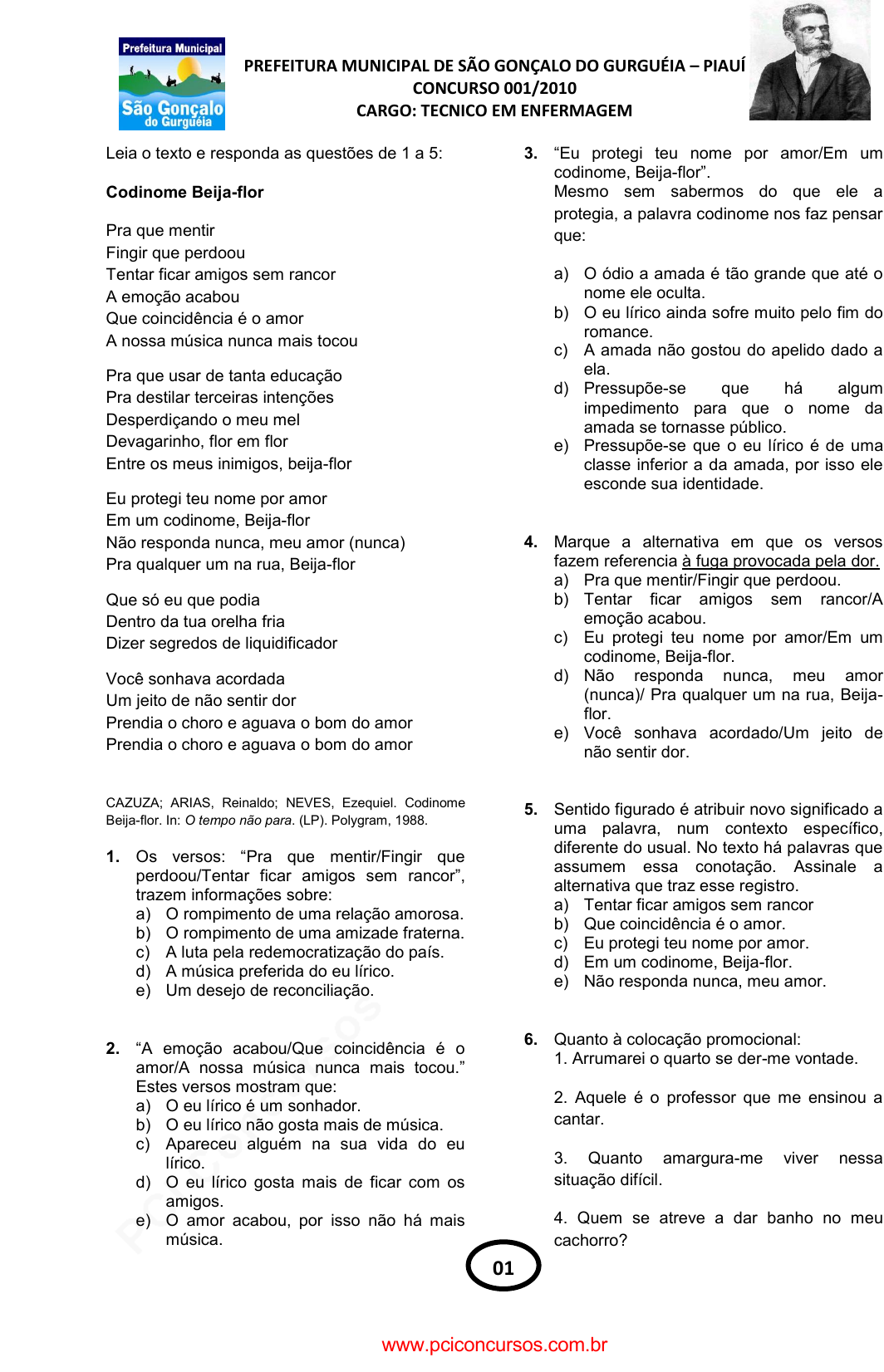 pcimarkpci MDAwMDowMDAwOjAwMDA6MDAwMDowMDAwOmZmZmY6MzZlOTpjMjU5:U2F0LCAxMSBTZXAgMjAyMSAxMjoyMDo1NiAtMDMwMA== PREFEITURA MUNICIPAL DE SÃO GONÇALO DO GURGUÉIA – PIAUÍ CONCURSO 001/2010 CARGO: TECNICO EM ENFERMAGEM Leia o texto e responda as questões de 1 a 5: Codinome Beija-flor Pra que mentir Fingir que perdoou Tentar ficar amigos sem rancor A emoção acabou Que coincidência é o amor A nossa música nunca mais tocou Pra que usar de tanta educação Pra destilar terceiras intenções Desperdiçando o meu mel Devagarinho, flor em flor Entre os meus inimigos, beija-flor Eu protegi teu nome por amor Em um codinome, Beija-flor Não responda nunca, meu amor (nunca) Pra qualquer um na rua, Beija-flor Que só eu que podia Dentro da tua orelha fria Dizer segredos de liquidificador Você sonhava acordada Um jeito de não sentir dor Prendia o choro e aguava o bom do amor Prendia o choro e aguava o bom do amor CAZUZA; ARIAS, Reinaldo; NEVES, Ezequiel. Codinome Beija-flor. In: O tempo não para. (LP). Polygram, 1988. 1. Os versos: ―Pra que mentir/Fingir que perdoou/Tentar ficar amigos sem rancor‖, trazem informações sobre: a) O rompimento de uma relação amorosa. b) O rompimento de uma amizade fraterna. c) A luta pela redemocratização do país. d) A música preferida do eu lírico. e) Um desejo de reconciliação. 2. ―A emoção acabou/Que coincidência é o amor/A nossa música nunca mais tocou.‖ Estes versos mostram que: a) O eu lírico é um sonhador. b) O eu lírico não gosta mais de música. c) Apareceu alguém na sua vida do eu lírico. d) O eu lírico gosta mais de ficar com os amigos. e) O amor acabou, por isso não há mais música. 3. ―Eu protegi teu nome por amor/Em um codinome, Beija-flor‖. Mesmo sem sabermos do que ele a protegia, a palavra codinome nos faz pensar que: a) O ódio a amada é tão grande que até o nome ele oculta. b) O eu lírico ainda sofre muito pelo fim do romance. c) A amada não gostou do apelido dado a ela. d) Pressupõe-se que há algum impedimento para que o nome da amada se tornasse público. e) Pressupõe-se que o eu lírico é de uma classe inferior a da amada, por isso ele esconde sua identidade. 4. Marque a alternativa em que os versos fazem referencia à fuga provocada pela dor. a) Pra que mentir/Fingir que perdoou. b) Tentar ficar amigos sem rancor/A emoção acabou. c) Eu protegi teu nome por amor/Em um codinome, Beija-flor. d) Não responda nunca, meu amor (nunca)/ Pra qualquer um na rua, Beija- flor. e) Você sonhava acordado/Um jeito de não sentir dor. 5. Sentido figurado é atribuir novo significado a uma palavra, num contexto específico, diferente do usual. No texto há palavras que assumem essa conotação. Assinale a alternativa que traz esse registro. a) Tentar ficar amigos sem rancor b) Que coincidência é o amor. c) Eu protegi teu nome por amor. d) Em um codinome, Beija-flor. e) Não responda nunca, meu amor. 6. Quanto à colocação promocional: 1. Arrumarei o quarto se der-me vontade. 2. Aquele é o professor que me ensinou a cantar. 3. Quanto amargura-me viver nessa situação difícil. 4. Quem se atreve a dar banho no meu cachorro? 01 www.pciconcursos.com.br pcimarkpci MDAwMDowMDAwOjAwMDA6MDAwMDowMDAwOmZmZmY6MzZlOTpjMjU5:U2F0LCAxMSBTZXAgMjAyMSAxMjoyMDo1NiAtMDMwMA== PREFEITURA MUNICIPAL DE SÃO GONÇALO DO GURGUÉIA – PIAUÍ CONCURSO 001/2010 CARGO: TECNICO EM ENFERMAGEM As alternativas corretas são: a) 1 e 2 b) 2 e 3 c) 3 e 4 d) 1 e 3 e) 2 e 4 7. Leia a frase abaixo e marque a alternativa que a completa corretamente: A biblioteca já informou ____ vezes que, para a retirada de livros e revistas ____ de seu acervo, é _____ a apresentação do documento de identidade e de comprovante de endereço. a) bastante – raras – obrigatório b) bastantes – raras – obrigatório c) bastante – raros – obrigatória d) bastantes – raros – obrigatório e) bastantes – raros – obrigatória 8. Complete as orações com o verbo SER no presente do indicativo. I- Os Estados Unidos ____ uma nação poderosa. II- Isso ____ verdadeiras maravilhas da natureza. III- Minas Gerais ____ um estado que mexe com a imaginação. IV- Dois quilos _____ muito pouco. A alternativa que completa corretamente as frases são: a) são – são – é – é b) são – é – são – é c) são – são – são – são d) é – é – é – é e) é – são – é – são 9. Marque a alternativa que a classificação dos verbos esteja correta: VTD – Verbo transitivo direto. VTI – Verbo transitivo indireto. a) Todos assistimos ao espetáculo. (VTD) b) Você ainda aspira a uma viagem ao exterior. (VTD) c) Por que o funcionário não visou aqueles documentos? (VTD) d) Os alunos atenderam a solicitação do diretor. (VTI) e) O médico assiste aquele menino ferido. (VTI) 10. Classifique os numerais destacados nas orações. I – Cardinal ( ) Derrubei um quarto do leite do vidro. II – Ordinal ( ) Tenho pelo menos o dobro de sua idade. III – Multiplicativo ( ) Comprei trezentos gramas de cogumelo. IV – Fracionário ( ) Ele é o quadragésimo menino de rua que já acudi. Os itens que classificam corretamente é: a) d – c – a – b b) c – d – a – b c) a – b – c – d d) b – a – c – d e) a – d – c - b 02 www.pciconcursos.com.br pcimarkpci MDAwMDowMDAwOjAwMDA6MDAwMDowMDAwOmZmZmY6MzZlOTpjMjU5:U2F0LCAxMSBTZXAgMjAyMSAxMjoyMDo1NiAtMDMwMA== PREFEITURA MUNICIPAL DE SÃO GONÇALO DO GURGUÉIA – PIAUÍ CONCURSO 001/2010 CARGO: TECNICO EM ENFERMAGEM CONHECIMENTOS GERAIS E ATUALIDADES 11 - Marque a alternativa correta. I - Em dezembro de 2008, a imagem do jornalista iraquiano atirando um sapato em um presidente ganhou as páginas de jornais e revistas do mundo todo. O jornalista, mesmo respondendo a processo, virou herói para a comunidade árabe. O texto se refere ao incidente com o presidente norte-americano George W. Bush. II - Em dezembro de 2008, o Supremo Tribunal Federal decidiu por 8 votos favoráveis, 
