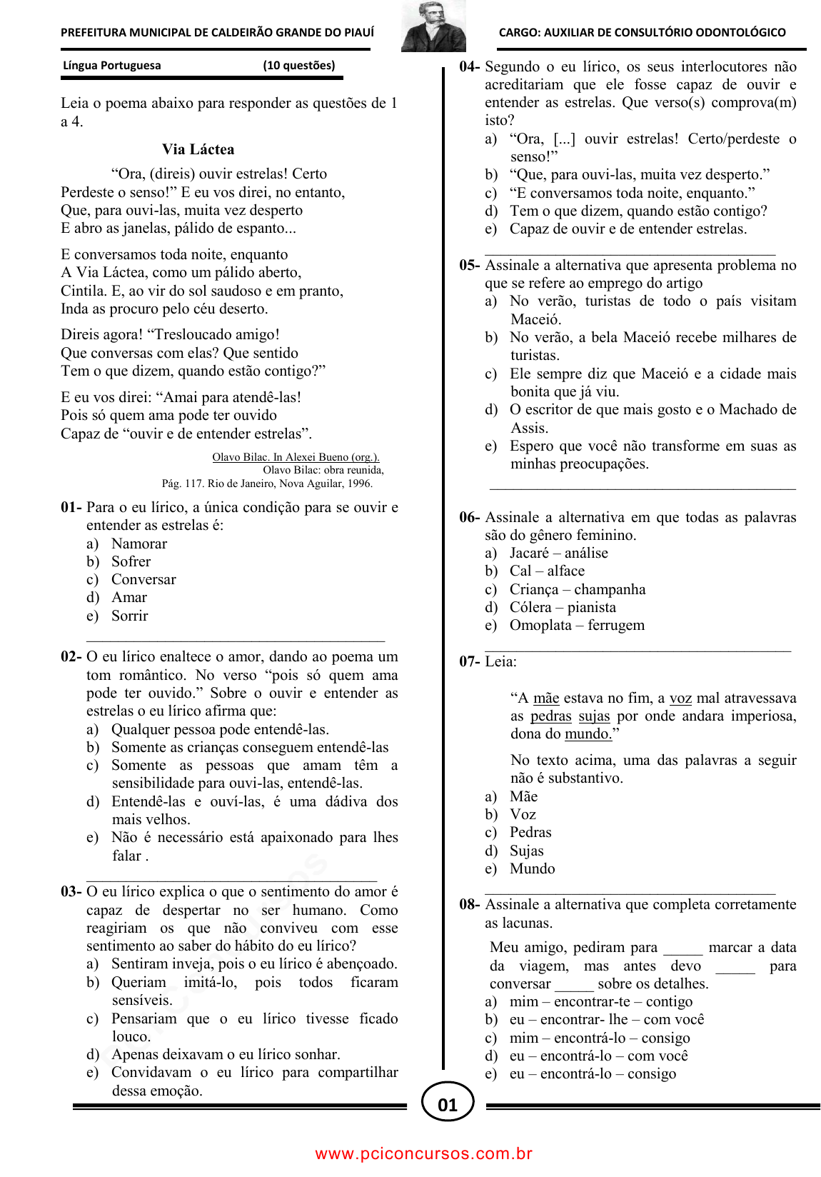 pcimarkpci MDAwMDowMDAwOjAwMDA6MDAwMDowMDAwOmZmZmY6MzZlOTpjMjU5:U2F0LCAxOCBTZXAgMjAyMSAwOTo0MDoxNSAtMDMwMA== PREFEITURA MUNICIPAL DE CALDEIRÃO GRANDE DO PIAUÍ CARGO: AUXILIAR DE CONSULTÓRIO ODONTOLÓGICO Língua Portuguesa (10 questões) Leia o poema abaixo para responder as questões de 1 a 4. Via Láctea “Ora, (direis) ouvir estrelas! Certo Perdeste o senso!” E eu vos direi, no entanto, Que, para ouvi-las, muita vez desperto E abro as janelas, pálido de espanto... E conversamos toda noite, enquanto A Via Láctea, como um pálido aberto, Cintila. E, ao vir do sol saudoso e em pranto, Inda as procuro pelo céu deserto. Direis agora! “Tresloucado amigo! Que conversas com elas? Que sentido Tem o que dizem, quando estão contigo?” E eu vos direi: “Amai para atendê-las! Pois só quem ama pode ter ouvido Capaz de “ouvir e de entender estrelas”. Olavo Bilac. In Alexei Bueno (org.). Olavo Bilac: obra reunida, Pág. 117. Rio de Janeiro, Nova Aguilar, 1996. 01- Para o eu lírico, a única condição para se ouvir e entender as estrelas é: a) Namorar b) Sofrer c) Conversar d) Amar e) Sorrir ______________________________________ 02- O eu lírico enaltece o amor, dando ao poema um tom romântico. No verso “pois só quem ama pode ter ouvido.” Sobre o ouvir e entender as estrelas o eu lírico afirma que: a) Qualquer pessoa pode entendê-las. b) Somente as crianças conseguem entendê-las c) Somente as pessoas que amam têm a sensibilidade para ouvi-las, entendê-las. d) Entendê-las e ouví-las, é uma dádiva dos mais velhos. e) Não é necessário está apaixonado para lhes falar . _____________________________________ 03- O eu lírico explica o que o sentimento do amor é capaz de despertar no ser humano. Como reagiriam os que não conviveu com esse sentimento ao saber do hábito do eu lírico? a) Sentiram inveja, pois o eu lírico é abençoado. b) Queriam imitá-lo, pois todos ficaram sensíveis. c) Pensariam que o eu lírico tivesse ficado louco. d) Apenas deixavam o eu lírico sonhar. e) Convidavam o eu lírico para compartilhar dessa emoção. 04- Segundo o eu lírico, os seus interlocutores não acreditariam que ele fosse capaz de ouvir e entender as estrelas. Que verso(s) comprova(m) isto? a) “Ora, [...] ouvir estrelas! Certo/perdeste o senso!” b) “Que, para ouvi-las, muita vez desperto.” c) “E conversamos toda noite, enquanto.” d) Tem o que dizem, quando estão contigo? e) Capaz de ouvir e de entender estrelas. _____________________________________ 05- Assinale a alternativa que apresenta problema no que se refere ao emprego do artigo a) No verão, turistas de todo o país visitam Maceió. b) No verão, a bela Maceió recebe milhares de turistas. c) Ele sempre diz que Maceió e a cidade mais bonita que já viu. d) O escritor de que mais gosto e o Machado de Assis. e) Espero que você não transforme em suas as minhas preocupações. _______________________________________ 06- Assinale a alternativa em que todas as palavras são do gênero feminino. a) Jacaré – análise b) Cal – alface c) Criança – champanha d) Cólera – pianista e) Omoplata – ferrugem _______________________________________ 07- Leia: “A mãe estava no fim, a voz mal atravessava as pedras sujas por onde andara imperiosa, dona do mundo.” No texto acima, uma das palavras a seguir não é substantivo. a) Mãe b) Voz c) Pedras d) Sujas e) Mundo _____________________________________ 08- Assinale a alternativa que completa corretamente as lacunas. Meu amigo, pediram para _____ marcar a data da viagem, mas antes devo _____ para conversar _____ sobre os detalhes. a) mim – encontrar-te – contigo b) eu – encontrar- lhe – com você c) mim – encontrá-lo – consigo d) eu – encontrá-lo – com você e) eu – encontrá-lo – consigo 01 www.pciconcursos.com.br pcimarkpci MDAwMDowMDAwOjAwMDA6MDAwMDowMDAwOmZmZmY6MzZlOTpjMjU5:U2F0LCAxOCBTZXAgMjAyMSAwOTo0MDoxNSAtMDMwMA== PREFEITURA MUNICIPAL DE CALDEIRÃO GRANDE DO PIAUÍ CARGO: AUXILIAR DE CONSULTÓRIO ODONTOLÓGICO 09- Se ele _____ a velha casa de janelas brancas e nos _____ uma proposta, nós a ____ com atenção. a) quiser – fizesse – examinaríamos b) quisesse – faça – examinaríamos c) queria – faça – examinaremos d) quiser – fizesse – examinaremos e) quisesse – fizesse – examinaríamos _______________________________________ 10- Considere estas frases: I – Desde que ele era criança, sempre quis ter um sítio cheio de bichos. II – Ele conseguirá superar os problemas, desde que lute com disposição. III – Como havia chovido na véspera, os caminhões não conseguiram chegar à fazenda. IV – Tudo aconteceu como os cientistas haviam previsto. As conjunções em destaque exprimem, respectivamente, relação de: a) Condição – condição – causa – causa b) Tempo – condição – comparação – causa c) Condição – tempo – conformidade – comparação d) Tempo – condição – causa – conformidade e) Tempo – tempo – comparação – conformidade Conhecimentos Gerais/ Atualidades (05 questões) 11- No dia 3 de outubro participamos de mais uma etapa do processo político brasileiro a qual muitos a chamam de verdadeira aula de democracia, onde tivemos a oportunidade de escolher nossos representantes, através do voto para presidente da República, governadores, senadores e deputados. A mesma etapa se dará no dia 31 de outubro quando voltaremos às urnas para votar no segundo turno. Os candidatos eleitos no dia (3) e os que virão a ser no dia (31) farão parte dos seguintes níveis de poder: a) Federal e municipal b) Municipal e estadual c) Somente federal d) Somente estadual e) Estadual e federal 12- Nesse ano de eleições muitos candidatos em todo o país, foram pegos de surpresa e tiveram ou terão suas candidaturas impugnadas, ou seja, não poderão disputar uma vaga seja para o Executivo ou Legislativo. A lei que tem como um de seus objetivos afastar políticos de 