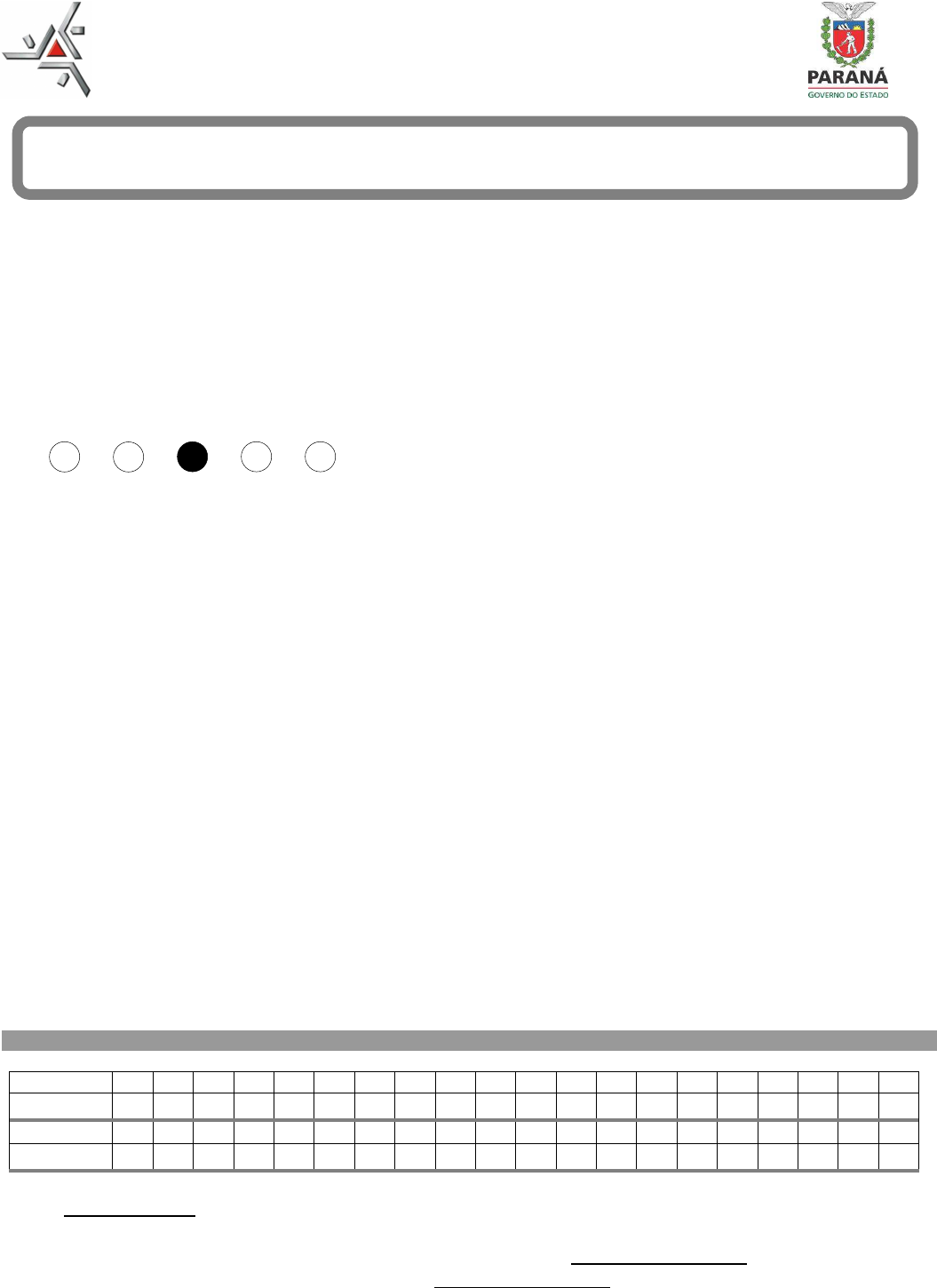Universidade Estadual de Maringá Pró-reitoria de Recursos Humanos e Assuntos Comunitários INSTRUÇÕES PARA A REALIZAÇÃO DA PROVA E PREENCHIMEN TO DA FOLHA DE RESPOSTAS � Verifique se este caderno contém 40 questões e assine-o no local apropriado. � Confira os dados da folha de respostas e assine-a no local apropriado. � A folha de respostas é o único documento hábil para a correção da prova objetiva e deverá ser preenchida com caneta esferográfica de tinta azul ou preta. � A marcação das letras na folha de respostas deve ser feita cobrindo a letra e preenchendo todo o espaço compreendido pelos círculos, com caneta esferográfica de cor azul ou preta , conforme o exemplo: A B C D E � Na folha de respostas, não poderá haver rasuras e não poderá haver mais de uma alternativa assinalada para cada questão; caso isso ocorra, a questão será anulada. � Não haverá substituição da folha de respostas. � A prova terá duração de 03 (três) horas, incluindo o preenchimento da folha de respostas. � O candidato só poderá retirar-se definitivamente da sala após uma hora e trinta minutos do início da prova. � O candidato que necessitar utilizar o sanitário deverá solicitar isso ao aplicador de prova. � Este caderno de prova não poderá ser levado. O candidato poderá transcrever as respostas no rascunho abaixo e levá-lo consigo ao término da prova. NOME DO CANDIDATO: _________________________________________________________________ ASSINATURA DO CANDIDATO: ___________________________________________________________ Umuarama, 07 de maio de 2017. � .......................................................................................................................................... ........................Corte na linha pontilhada UEM – Edital N.º 43/2017-PRH – Teste Seletivo para a função de Auxiliar Operacional (Agropecuária) RASCUNHO – ANOTE AQUI AS SUAS RESPOSTAS Questões 01 02 03 04 05 06 07 08 09 10 11 12 13 14 15 16 17 18 19 20 Respostas Questões 21 22 23 24 25 26 27 28 29 30 31 32 33 34 35 36 37 38 39 40 Respostas CRONOGRAMA: � Divulgação do gabarito e do caderno de prova: 09-05-2017, às 17h. � Divulgação do resultado final: 06-06-2017, às 17h, no endereço www.uem.br/concurso. � O caderno de prova ficará disponível em www.uem.br/concurso até a divulgação do resultado final. TESTE SELETIVO – EDITAL N.º 43/2017-PRH AUXILIAR OPERACIONAL (AGROPECUÁRIA ) www.pciconcursos.com.br Universidade Estadual de Maringá – TESTE SELETIVO – Edital N.º 43/2017-PRH AUXILIAR OPERACIONAL (AGROPECUÁRIA) 2 CONHECIMENTO ESPECÍFICO Questão 01 O trator identificado como um modelo 4x4, significa A) que ele tem 4 marchas simples e 4 reduzidas. B) que ele tem 4 rodas e 4 marchas. C) que ele tem tração nas 4 rodas. D) que ele tem 4 braços hidráulicos e 4 mecânicos. E) que ele tem tração em dois pneus. Questão 02 A implantação de um pomar de goiabeira exige espaçamento de 5m x 4m. Considerando essa informação, quantas plantas devem ser plantadas em um hectare da cultura? A) 5.000 plantas. B) 500 plantas. C) 3.000 plantas. D) 20.000 plantas. E) 10.000 plantas. Questão 03 Para pintar as paredes de um laboratório, uma pessoa considerou que 5 latas de 18 litros eram suficientes para realizar o trabalho. Considerando que 1m2 (um metro quadrado) de parede pode ser pintado com 180 ml (cento e oitenta mililitros) de tinta, quantos metros de parede pode ser pintado no laboratório usando as 5 latas? A) 500 m2. B) 220 m2. C) 300 m2. D) 330 m2. E) 430 m2. Questão 04 Qual a parte do trator é acoplada a uma roçadeira? A) Sistema hidráulico. B) Tomada de potência. C) Tomada elétrica. D) Redutor final. E) Volante. Questão 05 O peso de 12 cabeças de novilhos da raça nelore foi de 180 arrobas. Transformado em quilogramas o peso foi de A) 2.700 kg. B) 3.300 kg. C) 2.400 kg. D) 3.100 kg. E) 6.300 kg. Questão 06 Qual o papel que mais representa o do “rufião” no rebanho? A) Ser reprodutor. B) Ser líder. C) Ser guia. D) Ser identificador de fêmeas no cio. E) Ser indicador de peso. Questão 07 Um determinado rebanho é formado por 1.200 cabeças de gado. 60% (sessenta por cento) do rebanho é constituído de machos e 40% (quarenta por cento) de fêmeas. Na vacinação contra aftosa, um levantamento mostrou que 90% das fêmeas e 45% dos machos tinham sido vacinados. A quantidade de animais vacinados no total foi de A) 216 animais. B) 832 animais. C) 756 animais. D) 876 animais. E) 1.001 animais. Questão 08 Uma regra simples é admitir que uma vaca necessita de cerca de 4 litros de água para cada litro de leite produzido. Considerando um rebanho de 50 vacas em lactação, com média de 30 litros de leite por dia por vaca, a quantidade de água consumida é de A) 1.200 litros. B) 12.000 litros. C) 6.000 litros. D) 30.000 litros. E) 8.100 litros. www.pciconcursos.com.br Universidade Estadual de Maringá – TESTE SELETIVO – Edital N.º 43/2017-PRH AUXILIAR OPERACIONAL (AGROPECUÁRIA) 3 Questão 09 Mastite é um processo inflamatório inerente A) à retirada dos cornos. B) à castração dos machos. C) às glândulas mamárias. D) aos cascos dos animais. E) aos dentes dos animais. Questão 10 As letras da sigla S.I.F. comum em embalagens de carnes e outros produtos de origem animal, significam A) Saúde, Idônea e Fresca. B) Serviço de Inspeção Federal. C) Sigla Interna Fechada. D) Serviço de Inovação Fabricada. E) Serviço Individual do Fabricante. Questão 11 O alqueire de terra no Estado do Paraná mede quantos metros quadrados? A) Vinte e quatro mil e duzentos metros quadrados. B) Vinte e seis mil e duzentos metros quadrados. C) Quarenta e oito mil e quatrocentos metros quadrados. D) Quarenta e seis mil e duzentos metros quadrados. E) Quarenta e sete mil metros quadrados. Questão 12 O processo biológico em que os microrganismos transformam a matéria orgânica, como estrume, folhas, papel e restos de c