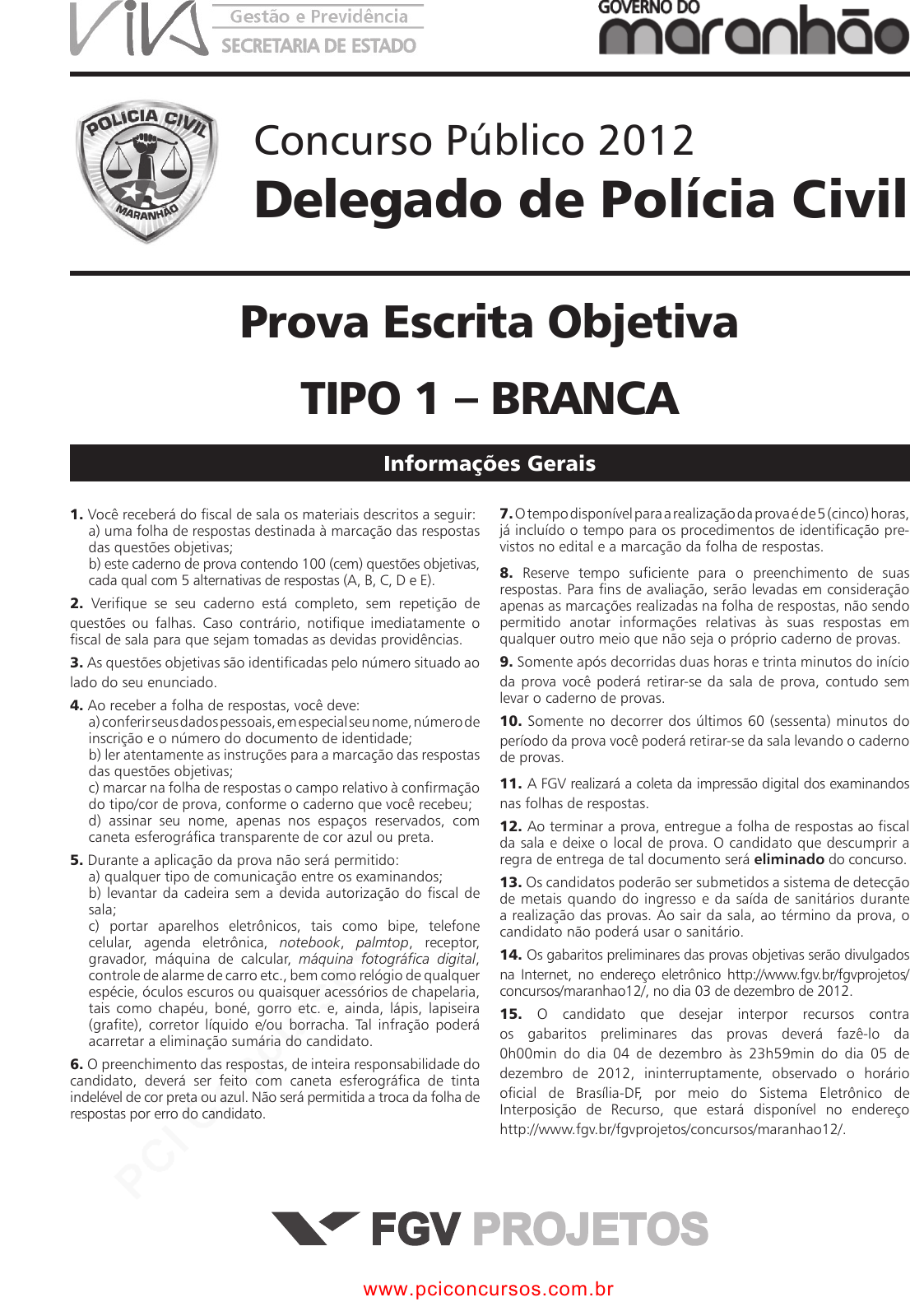 pcimarkpci MDAwMDowMDAwOjAwMDA6MDAwMDowMDAwOmZmZmY6MzZlOTpjMjU5:VGh1LCAxNiBTZXAgMjAyMSAxNzozOToxMSAtMDMwMA== Concurso Público 2012 Delegado de Polícia Civil Prova Escrita Objetiva TIPO 1 – BRANCA Informações Gerais 1. Você receberá do fiscal de sala os materiais descritos a seguir: a) uma folha de respostas destinada à marcação das respostas das questões objetivas; b) este caderno de prova contendo 100 (cem) questões objetivas, cada qual com 5 alternativas de respostas (A, B, C, D e E). 2. Verifique se seu caderno está completo, sem repetição de questões ou falhas. Caso contrário, notifique imediatamente o fiscal de sala para que sejam tomadas as devidas providências. 3. As questões objetivas são identificadas pelo número situado ao lado do seu enunciado. 4. Ao receber a folha de respostas, você deve: a) conferir seus dados pessoais, em especial seu nome, número de inscrição e o número do documento de identidade; b) ler atentamente as instruções para a marcação das respostas das questões objetivas; c) marcar na folha de respostas o campo relativo à confirmação do tipo/cor de prova, conforme o caderno que você recebeu; d) assinar seu nome, apenas nos espaços reservados, com caneta esferográfica transparente de cor azul ou preta. 5. Durante a aplicação da prova não será permitido: a) qualquer tipo de comunicação entre os examinandos; b) levantar da cadeira sem a devida autorização do fiscal de sala; c) portar aparelhos eletrônicos, tais como bipe, telefone celular, agenda eletrônica, notebook, palmtop, receptor, gravador, máquina de calcular, máquina fotográfica digital, controle de alarme de carro etc., bem como relógio de qualquer espécie, óculos escuros ou quaisquer acessórios de chapelaria, tais como chapéu, boné, gorro etc. e, ainda, lápis, lapiseira (grafite), corretor líquido e/ou borracha. Tal infração poderá acarretar a eliminação sumária do candidato. 6. O preenchimento das respostas, de inteira responsabilidade do candidato, deverá ser feito com caneta esferográfica de tinta indelével de cor preta ou azul. Não será permitida a troca da folha de respostas por erro do candidato. 7. O tempo disponível para a realização da prova é de 5 (cinco) horas, já incluído o tempo para os procedimentos de identificação pre- vistos no edital e a marcação da folha de respostas. 8. Reserve tempo suficiente para o preenchimento de suas respostas. Para fins de avaliação, serão levadas em consideração apenas as marcações realizadas na folha de respostas, não sendo permitido anotar informações relativas às suas respostas em qualquer outro meio que não seja o próprio caderno de provas. 9. Somente após decorridas duas horas e trinta minutos do início da prova você poderá retirar-se da sala de prova, contudo sem levar o caderno de provas. 10. Somente no decorrer dos últimos 60 (sessenta) minutos do período da prova você poderá retirar-se da sala levando o caderno de provas. 11. A FGV realizará a coleta da impressão digital dos examinandos nas folhas de respostas. 12. Ao terminar a prova, entregue a folha de respostas ao fiscal da sala e deixe o local de prova. O candidato que descumprir a regra de entrega de tal documento será eliminado do concurso. 13. Os candidatos poderão ser submetidos a sistema de detecção de metais quando do ingresso e da saída de sanitários durante a realização das provas. Ao sair da sala, ao término da prova, o candidato não poderá usar o sanitário. 14. Os gabaritos preliminares das provas objetivas serão divulgados na Internet, no endereço eletrônico http://www.fgv.br/fgvprojetos/ concursos/maranhao12/, no dia 03 de dezembro de 2012. 15. O candidato que desejar interpor recursos contra os gabaritos preliminares das provas deverá fazê-lo da 0h00min do dia 04 de dezembro às 23h59min do dia 05 de dezembro de 2012, ininterruptamente, observado o horário oficial de Brasília-DF, por meio do Sistema Eletrônico de Interposição de Recurso, que estará disponível no endereço http://www.fgv.br/fgvprojetos/concursos/maranhao12/. www.pciconcursos.com.br pcimarkpci MDAwMDowMDAwOjAwMDA6MDAwMDowMDAwOmZmZmY6MzZlOTpjMjU5:VGh1LCAxNiBTZXAgMjAyMSAxNzozOToxMSAtMDMwMA== www.pciconcursos.com.br pcimarkpci MDAwMDowMDAwOjAwMDA6MDAwMDowMDAwOmZmZmY6MzZlOTpjMjU5:VGh1LCAxNiBTZXAgMjAyMSAxNzozOToxMSAtMDMwMA== CONCURSO PÚBLICO PARA O CARGO DE DELEGADO DE POLÍCIA CIVIL PROVA TIPO 1 – BRANCA – 3 Língua Portuguesa 01. Observe a charge a seguir. Assinale a alternativa inadequada em relação aos elementos da charge acima. (A) A noção de insegurança é dada, entre outras coisas, pelo arame farpado sobre os muros. (B) A fala do personagem indica, também, a falta de coleta normal de lixo. (C) O tamanho das casas indica local de poucas possibilidades econômicas. (D) As reticências após “segurança pública” indicam reflexão sobre o tema. (E) Os termos do personagem indicam vocabulário militar. 02. Observe o gráfico a seguir. Depreende-se da observação do gráfico acima que (A) ocorre uma tendência de aumento tanto em furto quanto em roubo de veículos. (B) fazem-se muito mais roubos que furtos em 2012, segundo a medição. (C) acontecem, no segundo semestre de cada ano, mais roubos e furtos do que no primeiro. (D) realizam-se mais roubos e furtos em São Paulo do que nos demais estados. (E) vem ocorrendo uma redução do número total de veículos roubados e furtados em São Paulo. 03. Observe o cartaz a seguir. O elemento visual do cartaz acima visto de forma inadequada é: (A) A frase “quebrando o silêncio” visa a denunciarem-se casos de bullying. (B) A letra inicial de “silêncio”, por estar diferente em tamanho e em posição, representa a “quebra” que a frase pretende incentivar. (C) A mão espalmada do lado direito inferior do cartaz significa um gesto de rendição diante da violência do bullying. (D) O rosto da menina em primeiro plano mostra seu 