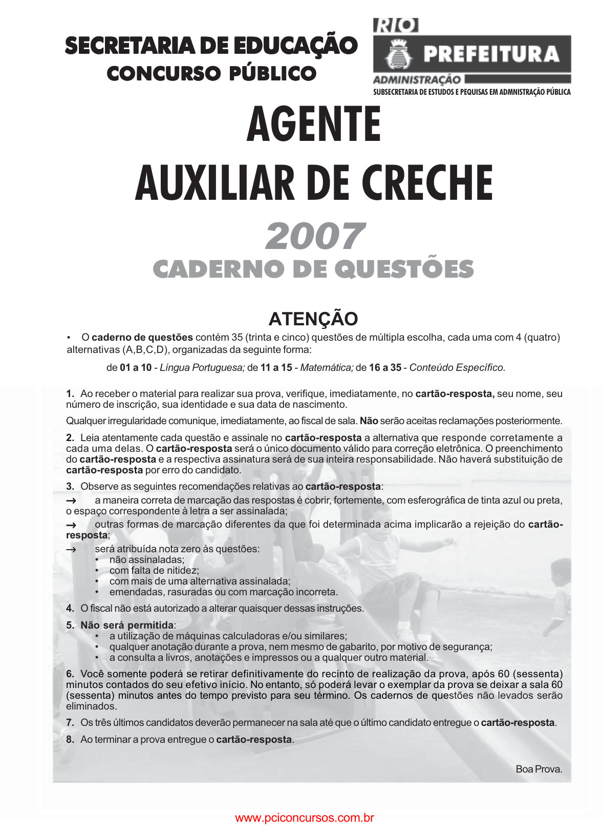 pcimarkpci MDAwMDowMDAwOjAwMDA6MDAwMDowMDAwOmZmZmY6MzZlOTpjMjU5:VGh1LCAxNiBTZXAgMjAyMSAyMzo1MDowNSAtMDMwMA== 1. Ao receber o material para realizar sua prova, verifique, imediatamente, no cartão-resposta, seu nome, seu número de inscrição, sua identidade e sua data de nascimento. Qualquer irregularidade comunique, imediatamente, ao fiscal de sala. Não serão aceitas reclamações posteriormente. 2. Leia atentamente cada questão e assinale no cartão-resposta a alternativa que responde corretamente a cada uma delas. O cartão-resposta será o único documento válido para correção eletrônica. O preenchimento do cartão-resposta e a respectiva assinatura será de sua inteira responsabilidade. Não haverá substituição de cartão-resposta por erro do candidato. 3. Observe as seguintes recomendações relativas ao cartão-resposta: →→→→→ a maneira correta de marcação das respostas é cobrir, fortemente, com esferográfica de tinta azul ou preta, o espaço correspondente à letra a ser assinalada; →→→→→ outras formas de marcação diferentes da que foi determinada acima implicarão a rejeição do cartão- resposta; →→→→→ será atribuída nota zero às questões: • não assinaladas; • com falta de nitidez; • com mais de uma alternativa assinalada; • emendadas, rasuradas ou com marcação incorreta. 4. O fiscal não está autorizado a alterar quaisquer dessas instruções. 5. Não será permitida: • a utilização de máquinas calculadoras e/ou similares; • qualquer anotação durante a prova, nem mesmo de gabarito, por motivo de segurança; • a consulta a livros, anotações e impressos ou a qualquer outro material. 6. Você somente poderá se retirar definitivamente do recinto de realização da prova, após 60 (sessenta) minutos contados do seu efetivo início. No entanto, só poderá levar o exemplar da prova se deixar a sala 60 (sessenta) minutos antes do tempo previsto para seu término. Os cadernos de questões não levados serão eliminados. 7. Os três últimos candidatos deverão permanecer na sala até que o último candidato entregue o cartão-resposta. 8. Ao terminar a prova entregue o cartão-resposta. Boa Prova. ATENÇÃO • O caderno de questões contém 35 (trinta e cinco) questões de múltipla escolha, cada uma com 4 (quatro) alternativas (A,B,C,D), organizadas da seguinte forma: de 01 a 10 - Língua Portuguesa; de 11 a 15 - Matemática; de 16 a 35 - Conteúdo Específico. 2007 CADERNO DE QUESTÕES AGENTE AUXILIAR DE CRECHE SECRETSECRETSECRETSECRETSECRETARIA DE EDUCAÇÃOARIA DE EDUCAÇÃOARIA DE EDUCAÇÃOARIA DE EDUCAÇÃOARIA DE EDUCAÇÃO CONCURSO PÚBLICOCONCURSO PÚBLICOCONCURSO PÚBLICOCONCURSO PÚBLICOCONCURSO PÚBLICO SUBSECRETARIA DE ESTUDOS E PEQUISAS EM ADMNISTRAÇÃO PÚBLICA www.pciconcursos.com.br pcimarkpci MDAwMDowMDAwOjAwMDA6MDAwMDowMDAwOmZmZmY6MzZlOTpjMjU5:VGh1LCAxNiBTZXAgMjAyMSAyMzo1MDowNSAtMDMwMA== CONCURSO PÚBLICO / SECRETARIA DE EDUCAÇÃO - SMESECRETARIA DE ADMINISTRAÇÃO / SUBEPAP 2 AUXILIAR DE CRECHE LÍNGUA PORTUGUESA Leia o texto: BEBETECA: LUGAR DE PEQUENOS LEITORES. Mesmo antes de saber falar, sentar ou segurar um livro, os bebês podem e devem ter histórias em sua rotina. Todo mundo sabe que ler é um hábito que se adquire ao longo da vida e que deve começar cedo. Quantas pessoas não têm gravada na memória uma bela história dos primeiros contatos com os livros? O escritor João Ubaldo Ribeiro conta na crônica Memórias de Livros que, desde muito pequeno, convivia com as obras espalhadas por sua casa: “A ponto de passar tempos enormes com um deles aberto no colo, fingindo que estava lendo e, na verdade, se não me trai a vã memória, de certa forma lendo, porque quando havia figuras, eu inventava as histórias que elas ilustravam e, ao olhar para as letras, tinha a sensação de que entendia nelas o que inventara.” Na autobiografia As Palavras, o filósofo francês Jean-Paul Sartre (1905-1980) revela que a hora da leitura tinha o cheiro de sua mãe, sabão e água de colônia. Sentado numa pequena cadeira de frente para ela, o garoto entrava num universo de fadas, bruxas e criaturas esquisitas. Até algum tempo atrás, acreditava-se que as crianças só começavam a desenvolver a capacidade de representação do mundo por volta dos 2 anos de idade. Hoje, ninguém mais duvida de que, quanto mais cedo a leitura for introduzida na vida dos pequenos, melhor, pois isso faz com que eles aumentem o vocabulário e passem a se expressar melhor. Quando o bebê ouve uma história e tenta repetir as palavras, desenvolve as linguagens oral e escrita, mesmo que ainda não saiba falar ou ler, como descreve João Ubaldo Ribeiro. Ler para as turmas de creche e pré-escola requer rotina, muitos livros e um espaço planejado. No Centro Municipal de Educação Infantil Cavalinho de Pau, em Castro, a 160 quilômetros de Curitiba, há um espaço especialmente montado para os bebês: a bebeteca. O diferencial está no acervo, voltado para a faixa dos menores de 3 anos, e na disposição de outros recursos adicionais, como fantoches e móbiles. FARIA, Fabiana. Nova escola, ano XXII, n. 206, p. 114/116, out. 2007 (com adaptações). 01. No fragmento “pois isso faz com que eles aumentem o vocabulário” (L.17/18), a palavra em negrito introduz uma relação de: A) conseqüência B) explicação C) finalidade D) oposição 02. A forma verbal composta equivalente à forma verbal simples destacada em “o que inventara” (L.9/10) é: A) tenha inventado B) tem inventado C) tinha inventado D) teria inventado 03. No fragmento “se não me trai a vã memória” (L. 7), a palavra em negrito pode ser substituída, sem que haja alteração de sentido, por: A) enganadora B) destruidora C) positiva D) afetiva 04. A palavra que faz o plural da mesma forma que “sensação” (L.9) é: A) pão B) órgão C) questão D) cidadão 05. A palavra “história” (L.3) é acentuada pela mesma razão que: A) mág