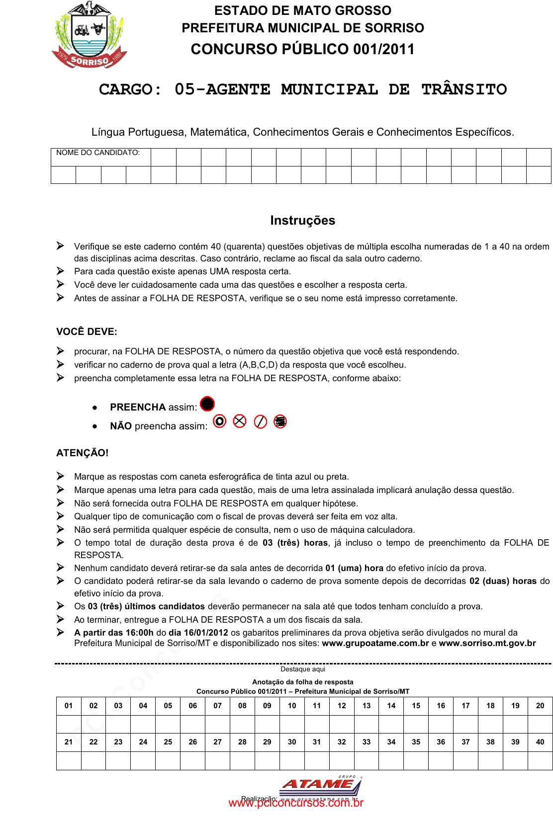 CONCURSO PÚBLICO Nº 001/2011 - PREFEITURA MUNICIPAL DE SORRISO/MT