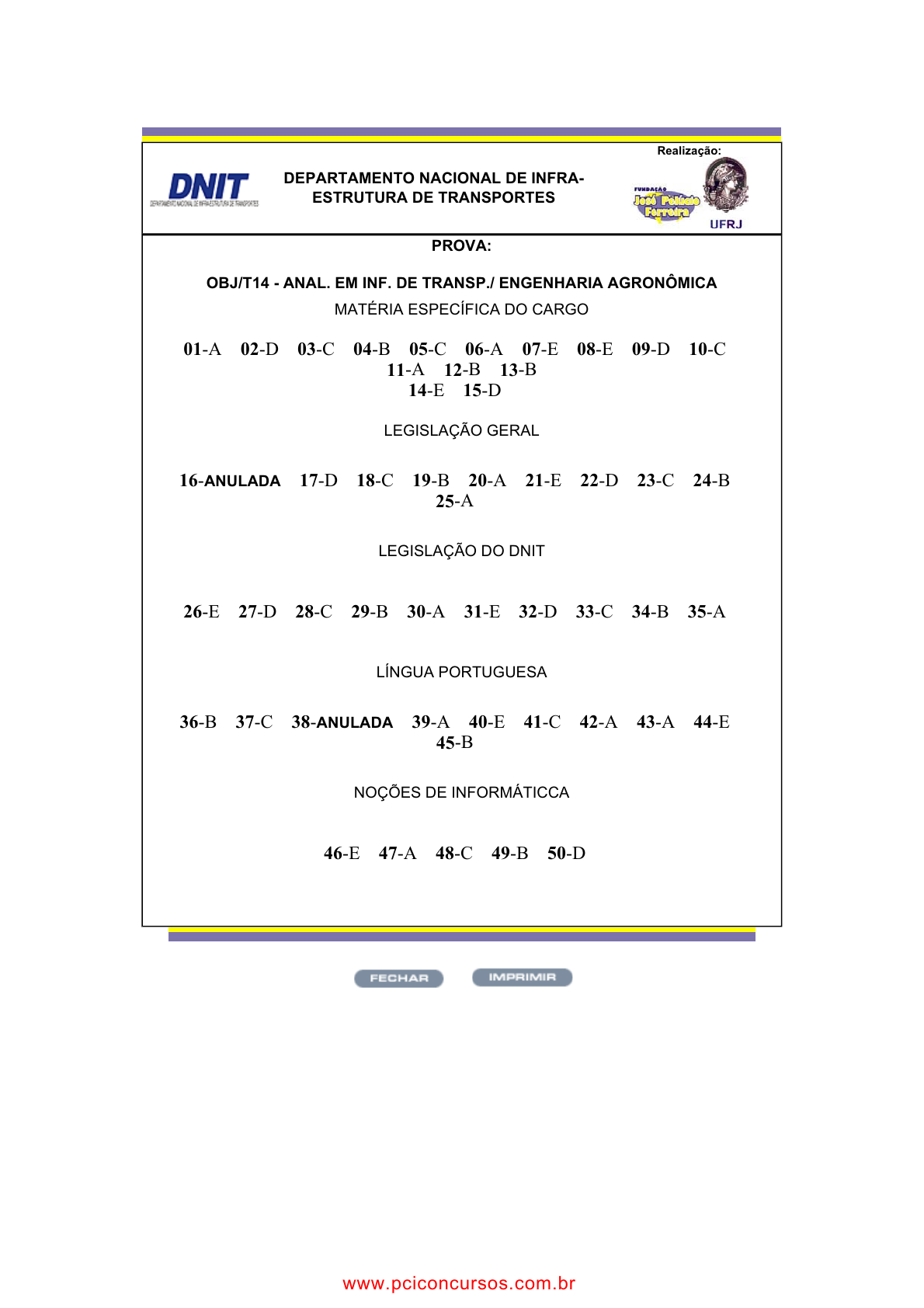 pcimarkpci MDAwMDowMDAwOjAwMDA6MDAwMDowMDAwOmZmZmY6MzZlOTpjMjU5:RnJpLCAxNyBTZXAgMjAyMSAxNTowNTo1NiAtMDMwMA== DEPARTAMENTO NACIONAL DE INFRA- ESTRUTURA DE TRANSPORTES Realização: PROVA: OBJ/T14 - ANAL. EM INF. DE TRANSP./ ENGENHARIA AGRONÔMICA MATÉRIA ESPECÍFICA DO CARGO 01-A 02-D 03-C 04-B 05-C 06-A 07-E 08-E 09-D 10-C 11-A 12-B 13-B 14-E 15-D LEGISLAÇÃO GERAL 16-ANULADA 17-D 18-C 19-B 20-A 21-E 22-D 23-C 24-B 25-A LEGISLAÇÃO DO DNIT 26-E 27-D 28-C 29-B 30-A 31-E 32-D 33-C 34-B 35-A LÍNGUA PORTUGUESA 36-B 37-C 38-ANULADA 39-A 40-E 41-C 42-A 43-A 44-E 45-B NOÇÕES DE INFORMÁTICCA 46-E 47-A 48-C 49-B 50-D www.pciconcursos.com.br pcimarkpci MDAwMDowMDAwOjAwMDA6MDAwMDowMDAwOmZmZmY6MzZlOTpjMjU5:RnJpLCAxNyBTZXAgMjAyMSAxNTowNjowMSAtMDMwMA== Engenharia Agronômica A na lis ta e m In fr a- E st ru tu ra d e Tr an sp or te s INSTRUÇÕES • O candidato receberá do fiscal: • Um caderno de questões contendo o tema da redação e 50 questões objetivas de múltipla escolha. • Um cartão de respostas personalizado. • Um caderno para a questão discursiva. • Ao ser autorizado o início da prova, verifique, no caderno de questões, se a numeração das questões e a paginação estão corretas. • Você dispõe de 4 (quatro) horas para fazer essa prova. Faça-a com tranqüilidade, mas controle o seu tempo. Esse tempo inclui a marcação do cartão de respostas. • Não será permitido ao candidato copiar os assinalamentos feitos no cartão de respostas. • Ao candidato somente será permitido levar seu caderno de questões ao término da prova. • Somente após decorrida uma hora do início da prova, o candidato poderá entregar o cartão de respostas e a redação e retirar-se da sala de prova. • Os três últimos candidatos de cada sala só poderão ser liberados juntos. • Se você precisar de algum esclarecimento, solicite a presença do responsável pelo local. Boa Prova ! www.pciconcursos.com.br www.pciconcursos.com.br pcimarkpci MDAwMDowMDAwOjAwMDA6MDAwMDowMDAwOmZmZmY6MzZlOTpjMjU5:RnJpLCAxNyBTZXAgMjAyMSAxNTowNjowMSAtMDMwMA== 2 DNIT MINISTÉRIO DOS TRANSPORTES Departamento Nacional de Infra-Estrutura de Transportes - Concurso Público 2006 www.pciconcursos.com.br www.pciconcursos.com.br pcimarkpci MDAwMDowMDAwOjAwMDA6MDAwMDowMDAwOmZmZmY6MzZlOTpjMjU5:RnJpLCAxNyBTZXAgMjAyMSAxNTowNjowMSAtMDMwMA== 3 DNIT MINISTÉRIO DOS TRANSPORTES Departamento Nacional de Infra-Estrutura de Transportes - Concurso Público 2006 DISCURSIVA Desenvolver um texto em cerca de 25 a 30 linhas sobre o seguinte tema: O governo de um determinado Estado brasileiro pretende fazer a duplicação de uma rodovia que tem um trecho significativo cortando um Parque Nacional, unidade de conservação de proteção integral, que vai ser afetado pelo empreendimento. A obra se justifica por ser de grande interesse público. De acordo com a Lei 9985, de 2000, que implantou o Sistema Nacional de Unidades de Conservação, e com a Resolução Conama 01, de 1997: a) de quem é a competência preferencial de licenciar a duplicação da estrada? b) cabe ao órgão administrador do Parque Nacional alguma participação no processo de licenciamento das obras na rodovia? Justifique sua resposta. c) como o Parque Nacional pode ser beneficiário de uma eventual compensação ambiental destinada a sua manutenção? CONHECIMENTO ESPECÍFICO 01- Com relação às matas ciliares é possível afirmar que: I– sofrem pressão antrópica e, em relevo acidentado, são áreas preferenciais para a abertura de estradas de rodagem e ferrovias. II– são importantes na manutenção de um microambiente próximo aos cursos d’água, promovendo menor variação de temperatura ao longo do dia. III– a serapilheira e o sistema radicular promovem uma camada no solo que possibilita o maior desbarrancamento das margens dos cursos d’água, quando de uma chuva intensa. IV– não representam papel significativo como corredores ecológicos que contribuem com os fluxos gênicos en- tre as populações de vegetais e animais. São corretas apenas as alternativas: (A) I e II (B) I e III (C) I e IV (D) II e IV (E) III e IV 02- Dentre os aspectos relevantes da ação do homem sobre o ambiente está a destruição das matas ciliares que, apesar da legislação vigente, ainda vem ocorrendo. Recuperar essas áreas de mata ciliar tem sido uma preocupação constante da sociedade como um todo, em função da sua importância, principalmente, na preservação de cursos d’água. Na recuperação dessas áreas, pode-se afirmar que: I– o tempo de regeneração da mata independe do dano causado anteriormente. II– para ocorrer uma regeneração mais rápida é necessário controlar espécies invasoras, principalmente gramíneas exóticas. III– ao se utilizar o plantio de mudas de plantas numa área de mata ciliar a ser recuperada, não é necessário fazer um levantamento florístico prévio do local para a escolha das espécies vegetais. IV– a regeneração natural tende a ser a forma de restauração de mata ciliar mais barata, necessitando alocar recursos para proteger a área. São corretas apenas as alternativas: (A) I e II (B) I e III (C) I e IV (D) II e IV (E) III e IV 03- Com relação à produção de mudas de plantas para áreas de domínio, para a recuperação de áreas degradadas ou para a recuperação de matas ciliares, pode-se dizer que: I– em relação aos recipientes para a produção de mudas, os tubetes apresentam vantagens como: menor volume e mecanização das operações de enchimento, melhor formação do sistema radicular e menor área de viveiro, do que o uso de sacos plásticos. II– quando a semeadura é feita diretamente na embalagem (recipiente), coloca-se apenas uma semente para dispensar os custos do desbaste. III– Independentemente da espécie a ser produzida, o substrato deve ser composto exclusivamente de 1/3 parte de barro, 1/3 parte de matéria orgânica e 1/3 parte de areia. IV– a aclimatação é a a