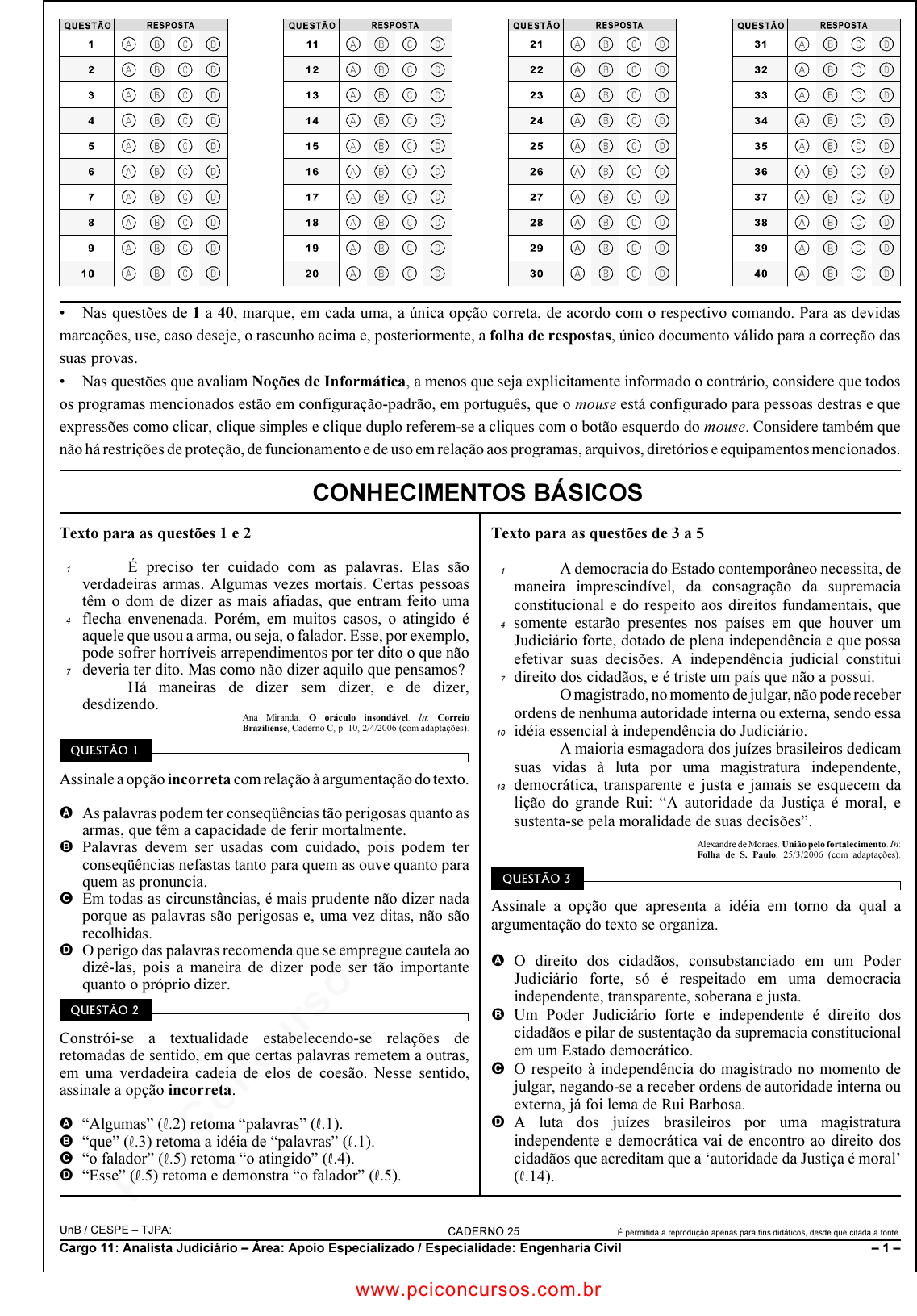 pcimarkpci MDAwMDowMDAwOjAwMDA6MDAwMDowMDAwOmZmZmY6MzZlOTpjMjU5:RnJpLCAxNyBTZXAgMjAyMSAxNjo0NzoxNSAtMDMwMA== UnB / CESPE – TJPA: CADERNO 25 É permitida a reprodução apenas para fins didáticos, desde que citada a fonte. Cargo 11: Analista Judiciário – Área: Apoio Especializado / Especialidade: Engenharia Civil – 1 – • Nas questões de 1 a 40, marque, em cada uma, a única opção�correta, de acordo com o respectivo comando. Para as devidas marcações, use, caso deseje, o rascunho acima e, posteriormente, a folha de respostas, único documento válido para a correção das suas provas. • Nas questões que avaliam Noções de Informática, a menos que seja explicitamente informado o contrário, considere que todos os programas mencionados estão em configuração-padrão, em português, que o mouse está configurado para pessoas destras e que expressões como clicar, clique simples e clique duplo referem-se a cliques com o botão esquerdo do mouse. Considere também que não há restrições de proteção, de funcionamento e de uso em relação aos programas, arquivos, diretórios e equipamentos mencionados. CONHECIMENTOS BÁSICOS Texto para as questões 1 e 2 É preciso ter cuidado com as palavras. Elas são1 verdadeiras armas. Algumas vezes mortais. Certas pessoastêm o dom de dizer as mais afiadas, que entram feito umaflecha envenenada. Porém, em muitos casos, o atingido é4 aquele que usou a arma, ou seja, o falador. Esse, por exemplo,pode sofrer horríveis arrependimentos por ter dito o que nãodeveria ter dito. Mas como não dizer aquilo que pensamos?7 Há maneiras de dizer sem dizer, e de dizer,desdizendo. Ana Miranda. O oráculo insondável. In: CorreioBraziliense, Caderno C, p. 10, 2/4/2006 (com adaptações). QUESTÃO 1 Assinale a opção incorreta com relação à argumentação do texto. A As palavras podem ter conseqüências tão perigosas quanto asarmas, que têm a capacidade de ferir mortalmente. B Palavras devem ser usadas com cuidado, pois podem terconseqüências nefastas tanto para quem as ouve quanto paraquem as pronuncia. C Em todas as circunstâncias, é mais prudente não dizer nadaporque as palavras são perigosas e, uma vez ditas, não sãorecolhidas. D O perigo das palavras recomenda que se empregue cautela aodizê-las, pois a maneira de dizer pode ser tão importantequanto o próprio dizer. QUESTÃO 2 Constrói-se a textualidade estabelecendo-se relações deretomadas de sentido, em que certas palavras remetem a outras,em uma verdadeira cadeia de elos de coesão. Nesse sentido,assinale a opção incorreta. A “Algumas” (R.2) retoma “palavras” (R.1). B “que” (R.3) retoma a idéia de “palavras” (R.1). C “o falador” (R.5) retoma “o atingido” (R.4). D “Esse” (R.5) retoma e demonstra “o falador” (R.5). Texto para as questões de 3 a 5 A democracia do Estado contemporâneo necessita, de1 maneira imprescindível, da consagração da supremaciaconstitucional e do respeito aos direitos fundamentais, quesomente estarão presentes nos países em que houver um4 Judiciário forte, dotado de plena independência e que possaefetivar suas decisões. A independência judicial constituidireito dos cidadãos, e é triste um país que não a possui.7 O magistrado, no momento de julgar, não pode receberordens de nenhuma autoridade interna ou externa, sendo essaidéia essencial à independência do Judiciário.10 A maioria esmagadora dos juízes brasileiros dedicamsuas vidas à luta por uma magistratura independente,democrática, transparente e justa e jamais se esquecem da13 lição do grande Rui: “A autoridade da Justiça é moral, esustenta-se pela moralidade de suas decisões”. Alexandre de Moraes. União pelo fortalecimento. In:Folha de S. Paulo, 25/3/2006 (com adaptações). QUESTÃO 3 Assinale a opção que apresenta a idéia em torno da qual a argumentação do texto se organiza. A O direito dos cidadãos, consubstanciado em um PoderJudiciário forte, só é respeitado em uma democraciaindependente, transparente, soberana e justa. B Um Poder Judiciário forte e independente é direito doscidadãos e pilar de sustentação da supremacia constitucionalem um Estado democrático. C O respeito à independência do magistrado no momento dejulgar, negando-se a receber ordens de autoridade interna ouexterna, já foi lema de Rui Barbosa. D A luta dos juízes brasileiros por uma magistraturaindependente e democrática vai de encontro ao direito doscidadãos que acreditam que a ‘autoridade da Justiça é moral’(R.14). www.pciconcursos.com.br pcimarkpci MDAwMDowMDAwOjAwMDA6MDAwMDowMDAwOmZmZmY6MzZlOTpjMjU5:RnJpLCAxNyBTZXAgMjAyMSAxNjo0NzoxNSAtMDMwMA== UnB / CESPE – TJPA: CADERNO 25 É permitida a reprodução apenas para fins didáticos, desde que citada a fonte. Cargo 11: Analista Judiciário – Área: Apoio Especializado / Especialidade: Engenharia Civil – 2 – QUESTÃO 4 No desenvolvimento da argumentação do texto, as formas verbais que indicam uma probabilidade ou suposição não incluem A “estarão” (R.4). B “houver” (R.4). C “possa” (R.5). D “sendo” (R.9). QUESTÃO 5 Assinale a opção incorreta a respeito do emprego das estruturas lingüísticas no texto. A No trecho “A democracia (...) necessita, de maneira imprescindível, da consagração da supremacia constitucional e do respeito aos direitos fundamentais” (R.1-3), o uso da preposição de nos termos destacados é exigência da forma verbal “necessita”, para que sejam respeitadas as regras de regência gramatical. B As regras gramaticais do padrão culto da língua portuguesa exigem o emprego da preposição no termo “em que” (R.4), o que indica que esse termo pode ser substituído pelo pronome onde. C Nas linhas 4 e 5, a flexão de singular na forma verbal “possa” indica que o pronome “que” refere-se a “Judiciário” e não a “países”, como poderia ser depreendido da organização textual. D Seria preservada a coer