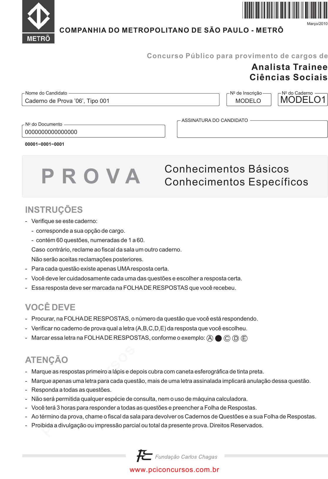 pcimarkpci MDAwMDowMDAwOjAwMDA6MDAwMDowMDAwOmZmZmY6MzZlOTpjMjU5:RnJpLCAxNyBTZXAgMjAyMSAxOTozNToxOSAtMDMwMA== N do CadernooN de Inscriçãoo ASSINATURA DO CANDIDATO N do Documentoo Nome do Candidato Março/2010 COMPANHIA DO METROPOLITANO DE SÃO PAULO - METRÔ Analista Trainee Ciências Sociais Concurso Público para provimento de cargos de Conhecimentos Básicos Conhecimentos EspecíficosP R O V A INSTRUÇÕES VOCÊ DEVE ATENÇÃO - Verifique se este caderno: - corresponde a sua opção de cargo. - contém 60 questões, numeradas de 1 a 60. Caso contrário, reclame ao fiscal da sala um outro caderno. Não serão aceitas reclamações posteriores. - Para cada questão existe apenas UMAresposta certa. - Você deve ler cuidadosamente cada uma das questões e escolher a resposta certa. - Essa resposta deve ser marcada na FOLHADE RESPOSTAS que você recebeu. - Procurar, na FOLHADE RESPOSTAS, o número da questão que você está respondendo. - Verificar no caderno de prova qual a letra (A,B,C,D,E) da resposta que você escolheu. - Marcar essa letra na FOLHADE RESPOSTAS, conforme o exemplo: - Marque as respostas primeiro a lápis e depois cubra com caneta esferográfica de tinta preta. - Marque apenas uma letra para cada questão, mais de uma letra assinalada implicará anulação dessa questão. - Responda a todas as questões. - Não será permitida qualquer espécie de consulta, nem o uso de máquina calculadora. - Você terá 3 horas para responder a todas as questões e preencher a Folha de Respostas. - Ao término da prova, chame o fiscal da sala para devolver os Cadernos de Questões e a sua Folha de Respostas. - Proibida a divulgação ou impressão parcial ou total da presente prova. Direitos Reservados. A C D E Caderno de Prova ’06’, Tipo 001 MODELO 0000000000000000 MODELO1 00001−0001−0001 www.pciconcursos.com.br pcimarkpci MDAwMDowMDAwOjAwMDA6MDAwMDowMDAwOmZmZmY6MzZlOTpjMjU5:RnJpLCAxNyBTZXAgMjAyMSAxOTozNToxOSAtMDMwMA== 2 METRO-Conhecimentos Básicos1 CONHECIMENTOS BÁSICOS Português Atenção: As questões de números 1 a 10 referem-se ao texto seguinte. Estradas e viajantes A linguagem nossa de cada dia pode ser altamente expressiva. Não sei até quando sobreviverão expressões, dita- dos, fórmulas proverbiais, modos de dizer que atravessaram o tempo falando as coisas de um jeito muito especial, gostoso, sugestivo. Acabarão por cair todas em desuso numa época co- mo a nossa, cheia de pressa e sem nenhuma paciência, ou apenas se renovarão? Algumas expressões são tão fortes que resistem aos séculos. Haverá alguma língua que não estabeleça formas de comparação entre vida e viagem, vida e caminho, vida e es- trada? O grande Dante já começava a Divina Comédia com “No meio do caminho de nossa vida...”. Se a vida é uma viagem, a grande viagem só pode ser... a morte, fim do nosso caminho. “Ela partiu", “Ele se foi”, dizemos. E assim vamos seguindo... Quando menino, ouvia com estranheza a frase “Cui- dado, tem boi na linha”. Como não havia linha de trem nem boi por perto, e as pessoas olhavam disfarçadamente para mim, co- mecei a desconfiar, mas sem compreender, que o boi era eu; mas como assim? Mais tarde vim a entender a tradução com- pleta e prosaica: “suspendamos a conversa, porque há alguém que não deve ouvi-la”. Uma outra expressão pitoresca, que eu já entendia, era “calça de pular brejo” ou “calça de atravessar rio”, no caso de pernas crescidas ou calças encolhidas, tudo constatado antes de pegar algum caminho. Já adulto, vim a dar com o termo “passagem”, no sentido fúnebre. “Passou desta para melhor”. Situação difícil: “estar numa encruzilhada”. Fim de vida penoso? “Também, já está subindo a ladeira dos oitenta...” São incontáveis os exem- plos, é uma retórica inteira dedicada a imagens como essas. Obviamente, os poetas, especialistas em imagens, se encar- regam de multiplicá-las. “Tinha uma pedra no meio do caminho”, queixou-se uma vez, e para sempre, o poeta Carlos Drummond de Andrade, fornecendo-nos um símbolo essencial para todo e qualquer obstáculo que um caminhante fatalmente enfrenta na estrada da vida, neste mundo velho sem porteira... (Peregrino Solerte, inédito) 1. A frase de abertura do texto – A linguagem nossa de cada dia pode ser altamente expressiva – corresponde a uma tese (A) cuja contestação é coerentemente desenvolvida, concluindo-se com a referência a Carlos Drummond de Andrade. (B) cujo desenvolvimento se faz com a multiplicação de exemplos, relativos a um mesmo campo de expres- são simbólica. (C) cujo desenvolvimento acaba por comprovar a inefi- ciência da linguagem simbólica, se comparada com a rotineira. (D) cuja comprovação se dá pelo fato de que, na evolu- ção de uma língua, as expressões simbólicas se mantêm sempre as mesmas. (E) cuja contestação é encaminhada mediante a compa- ração entre a linguagem antiga e a linguagem con- temporânea. _________________________________________________________ 2. Atente para as seguintes afirmações: I. No 1o parágrafo, expressa-se a convicção de que os modos de dizer mais expressivos não sobrevi- verão nos tempos modernos, por serem avaliados como ineficazes nos processos de comunicação. II. No 3o parágrafo, a impossibilidade de o menino compreender a frase ouvida aos adultos deveu-se ao fato de estar traduzida em linguagem prosaica. III. No 4o parágrafo, reconhece-se nos poetas a capa- cidade de enriquecimento expressivo da linguagem, especialistas que são na criação de imagens. Em relação ao texto, está correto APENAS o que se afir- ma em (A) I. (B) II. (C) III. (D) I e II. (E) II e III. _________________________________________________________ 3. As expressões E assim vamos seguindo e neste mundo velho sem porteira (A) devem ser tomadas como exemplos do mesmo tipo de repertório de imagens enumeradas no texto. (B) constituem mais exemplos da tradução prosaica que se 