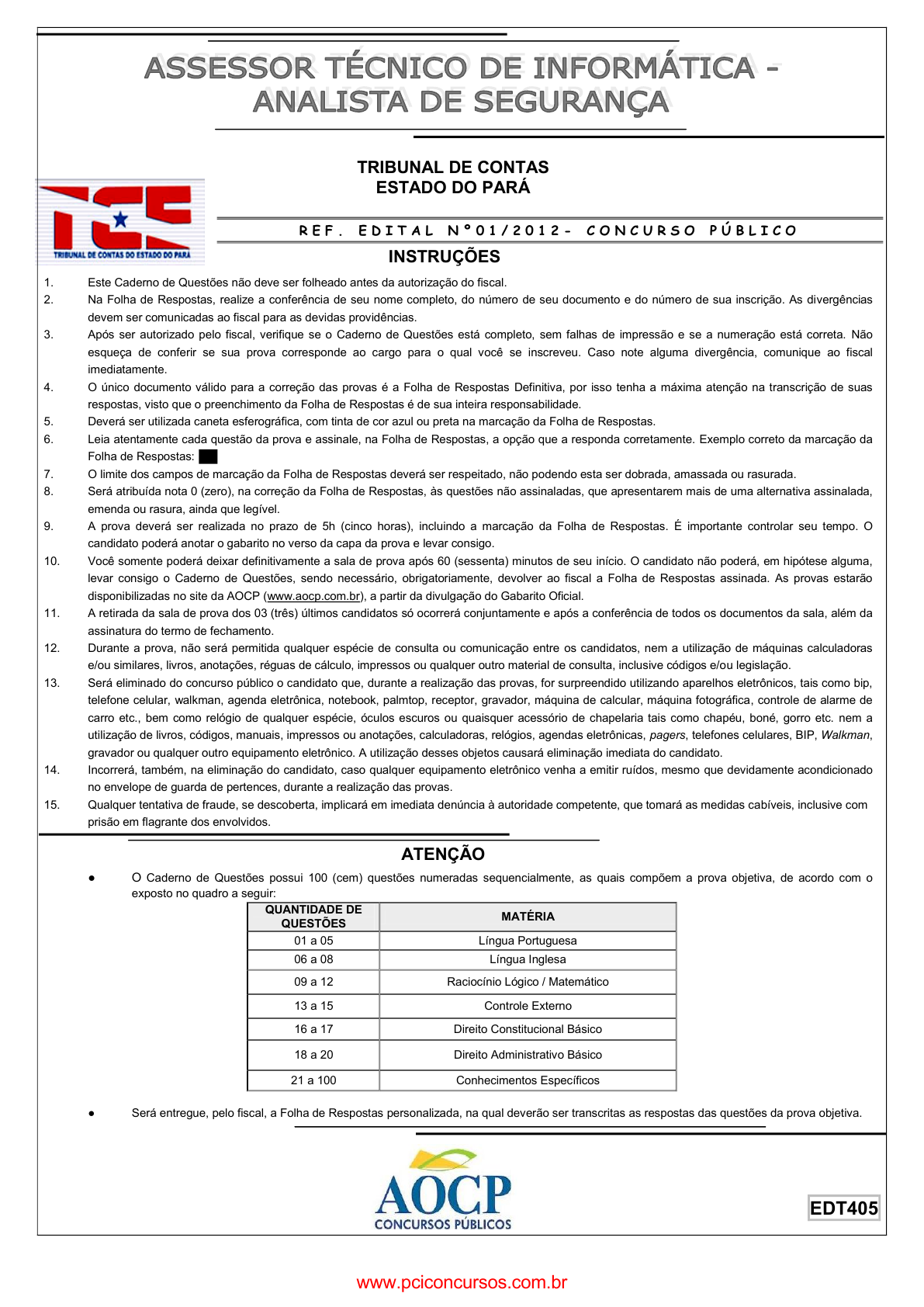 pcimarkpci MDAwMDowMDAwOjAwMDA6MDAwMDowMDAwOmZmZmY6MzZlOTpjMjU5:RnJpLCAxNyBTZXAgMjAyMSAyMTo0NToyMiAtMDMwMA== TRIBUNAL DE CONTAS ESTADO DO PARÁ R E F . E D I T A L N º 0 1 / 2 0 1 2 - C O N C U R S O P Ú B L I C O INSTRUÇÕES 1. Este Caderno de Questões não deve ser folheado antes da autorização do fiscal. 2. Na Folha de Respostas, realize a conferência de seu nome completo, do número de seu documento e do número de sua inscrição. As divergências devem ser comunicadas ao fiscal para as devidas providências. 3. Após ser autorizado pelo fiscal, verifique se o Caderno de Questões está completo, sem falhas de impressão e se a numeração está correta. Não esqueça de conferir se sua prova corresponde ao cargo para o qual você se inscreveu. Caso note alguma divergência, comunique ao fiscal imediatamente. 4. O único documento válido para a correção das provas é a Folha de Respostas Definitiva, por isso tenha a máxima atenção na transcrição de suas respostas, visto que o preenchimento da Folha de Respostas é de sua inteira responsabilidade. 5. Deverá ser utilizada caneta esferográfica, com tinta de cor azul ou preta na marcação da Folha de Respostas. 6. Leia atentamente cada questão da prova e assinale, na Folha de Respostas, a opção que a responda corretamente. Exemplo correto da marcação da Folha de Respostas: 7. O limite dos campos de marcação da Folha de Respostas deverá ser respeitado, não podendo esta ser dobrada, amassada ou rasurada. 8. Será atribuída nota 0 (zero), na correção da Folha de Respostas, às questões não assinaladas, que apresentarem mais de uma alternativa assinalada, emenda ou rasura, ainda que legível. 9. A prova deverá ser realizada no prazo de 5h (cinco horas), incluindo a marcação da Folha de Respostas. É importante controlar seu tempo. O candidato poderá anotar o gabarito no verso da capa da prova e levar consigo. 10. Você somente poderá deixar definitivamente a sala de prova após 60 (sessenta) minutos de seu início. O candidato não poderá, em hipótese alguma, levar consigo o Caderno de Questões, sendo necessário, obrigatoriamente, devolver ao fiscal a Folha de Respostas assinada. As provas estarão disponibilizadas no site da AOCP (www.aocp.com.br), a partir da divulgação do Gabarito Oficial. 11. A retirada da sala de prova dos 03 (três) últimos candidatos só ocorrerá conjuntamente e após a conferência de todos os documentos da sala, além da assinatura do termo de fechamento. 12. Durante a prova, não será permitida qualquer espécie de consulta ou comunicação entre os candidatos, nem a utilização de máquinas calculadoras e/ou similares, livros, anotações, réguas de cálculo, impressos ou qualquer outro material de consulta, inclusive códigos e/ou legislação. 13. Será eliminado do concurso público o candidato que, durante a realização das provas, for surpreendido utilizando aparelhos eletrônicos, tais como bip, telefone celular, walkman, agenda eletrônica, notebook, palmtop, receptor, gravador, máquina de calcular, máquina fotográfica, controle de alarme de carro etc., bem como relógio de qualquer espécie, óculos escuros ou quaisquer acessório de chapelaria tais como chapéu, boné, gorro etc. nem a utilização de livros, códigos, manuais, impressos ou anotações, calculadoras, relógios, agendas eletrônicas, pagers, telefones celulares, BIP, Walkman, gravador ou qualquer outro equipamento eletrônico. A utilização desses objetos causará eliminação imediata do candidato. 14. Incorrerá, também, na eliminação do candidato, caso qualquer equipamento eletrônico venha a emitir ruídos, mesmo que devidamente acondicionado no envelope de guarda de pertences, durante a realização das provas. 15. Qualquer tentativa de fraude, se descoberta, implicará em imediata denúncia à autoridade competente, que tomará as medidas cabíveis, inclusive com prisão em flagrante dos envolvidos. ATENÇÃO ● O Caderno de Questões possui 100 (cem) questões numeradas sequencialmente, as quais compõem a prova objetiva, de acordo com o exposto no quadro a seguir: QUANTIDADE DE QUESTÕES MATÉRIA 01 a 05 Língua Portuguesa 06 a 08 Língua Inglesa 09 a 12 Raciocínio Lógico / Matemático 13 a 15 Controle Externo 16 a 17 Direito Constitucional Básico 18 a 20 Direito Administrativo Básico 21 a 100 Conhecimentos Específicos ● Será entregue, pelo fiscal, a Folha de Respostas personalizada, na qual deverão ser transcritas as respostas das questões da prova objetiva. EDT405 www.pciconcursos.com.br pcimarkpci MDAwMDowMDAwOjAwMDA6MDAwMDowMDAwOmZmZmY6MzZlOTpjMjU5:RnJpLCAxNyBTZXAgMjAyMSAyMTo0NToyMiAtMDMwMA== CARGO: ASSESSOR TÉCNICO DE INFORMÁTICA – ANALISTA DE SEGURANÇA - 2 - --------------------------------------------------------------------------------(destaque aqui)----------------------------------------------------------------------- FOLHA PARA ANOTAÇÃO DAS RESPOSTAS DO CANDIDATO QUESTÃO 01 02 03 04 05 06 07 08 09 10 11 12 13 14 15 16 17 18 19 20 21 22 23 24 25 RESP. QUESTÃO 26 27 28 29 30 31 32 33 34 35 36 37 38 39 40 41 42 43 44 45 46 47 48 49 50 RESP. QUESTÃO 51 52 53 54 55 56 57 58 59 60 61 62 63 64 65 66 67 68 69 70 71 72 73 74 75 RESP. QUESTÃO 76 77 78 79 80 81 82 83 84 85 86 87 88 89 90 91 92 93 94 95 96 97 98 99 100 RESP. www.pciconcursos.com.br pcimarkpci MDAwMDowMDAwOjAwMDA6MDAwMDowMDAwOmZmZmY6MzZlOTpjMjU5:RnJpLCAxNyBTZXAgMjAyMSAyMTo0NToyMiAtMDMwMA== CARGO: ASSESSOR TÉCNICO DE INFORMÁTICA – ANALISTA DE SEGURANÇA - 3 - LL ÍÍ NN GG UU AA PP OO RR TT UU GG UU EE SS AA Chaplin e Camões na chuva Eduardo Escorel 1.° Meia hora de chuva moderada foi suficiente para alagar a rua Luís de Camões, no centro do Rio. Para ir a pé até lá, saindo da Rua da Assembléia, foi preciso atravessar a avenida Rio Branco, seguir pela rua da Carioca, dobrar na Ramalho Ortigão, contornar a igreja São Francisco de Paula, passar em frente ao Real Gabinete Portugu