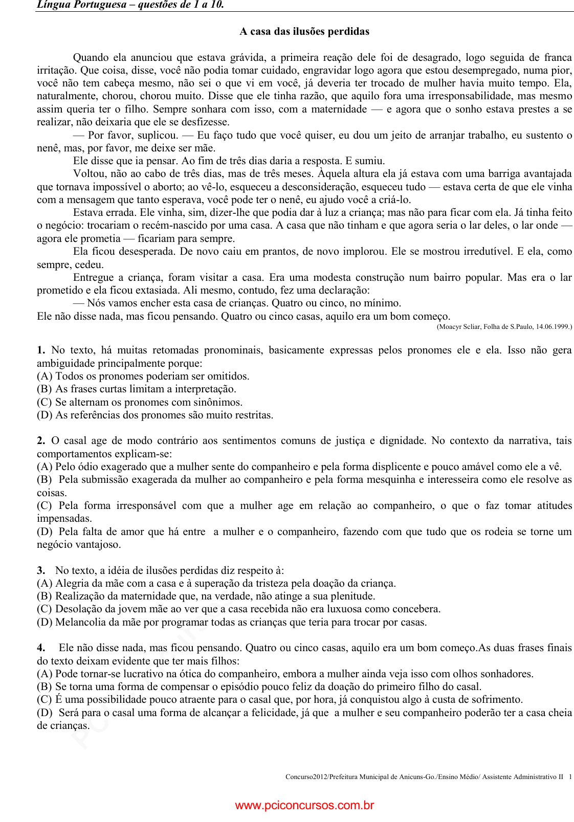 pcimarkpci MDAwMDowMDAwOjAwMDA6MDAwMDowMDAwOmZmZmY6MzZlOTpjMjU5:RnJpLCAxNyBTZXAgMjAyMSAyMzoxMjozNSAtMDMwMA== Concurso2012/Prefeitura Municipal de Anicuns-Go./Ensino Médio/ Assistente Administrativo II 1 Língua Portuguesa – questões de 1 a 10. A casa das ilusões perdidas Quando ela anunciou que estava grávida, a primeira reação dele foi de desagrado, logo seguida de franca irritação. Que coisa, disse, você não podia tomar cuidado, engravidar logo agora que estou desempregado, numa pior, você não tem cabeça mesmo, não sei o que vi em você, já deveria ter trocado de mulher havia muito tempo. Ela, naturalmente, chorou, chorou muito. Disse que ele tinha razão, que aquilo fora uma irresponsabilidade, mas mesmo assim queria ter o filho. Sempre sonhara com isso, com a maternidade — e agora que o sonho estava prestes a se realizar, não deixaria que ele se desfizesse. — Por favor, suplicou. — Eu faço tudo que você quiser, eu dou um jeito de arranjar trabalho, eu sustento o nenê, mas, por favor, me deixe ser mãe. Ele disse que ia pensar. Ao fim de três dias daria a resposta. E sumiu. Voltou, não ao cabo de três dias, mas de três meses. Àquela altura ela já estava com uma barriga avantajada que tornava impossível o aborto; ao vê-lo, esqueceu a desconsideração, esqueceu tudo — estava certa de que ele vinha com a mensagem que tanto esperava, você pode ter o nenê, eu ajudo você a criá-lo. Estava errada. Ele vinha, sim, dizer-lhe que podia dar à luz a criança; mas não para ficar com ela. Já tinha feito o negócio: trocariam o recém-nascido por uma casa. A casa que não tinham e que agora seria o lar deles, o lar onde — agora ele prometia — ficariam para sempre. Ela ficou desesperada. De novo caiu em prantos, de novo implorou. Ele se mostrou irredutível. E ela, como sempre, cedeu. Entregue a criança, foram visitar a casa. Era uma modesta construção num bairro popular. Mas era o lar prometido e ela ficou extasiada. Ali mesmo, contudo, fez uma declaração: — Nós vamos encher esta casa de crianças. Quatro ou cinco, no mínimo. Ele não disse nada, mas ficou pensando. Quatro ou cinco casas, aquilo era um bom começo. (Moacyr Scliar, Folha de S.Paulo, 14.06.1999.) 1. No texto, há muitas retomadas pronominais, basicamente expressas pelos pronomes ele e ela. Isso não gera ambiguidade principalmente porque: (A) Todos os pronomes poderiam ser omitidos. (B) As frases curtas limitam a interpretação. (C) Se alternam os pronomes com sinônimos. (D) As referências dos pronomes são muito restritas. 2. O casal age de modo contrário aos sentimentos comuns de justiça e dignidade. No contexto da narrativa, tais comportamentos explicam-se: (A) Pelo ódio exagerado que a mulher sente do companheiro e pela forma displicente e pouco amável como ele a vê. (B) Pela submissão exagerada da mulher ao companheiro e pela forma mesquinha e interesseira como ele resolve as coisas. (C) Pela forma irresponsável com que a mulher age em relação ao companheiro, o que o faz tomar atitudes impensadas. (D) Pela falta de amor que há entre a mulher e o companheiro, fazendo com que tudo que os rodeia se torne um negócio vantajoso. 3. No texto, a idéia de ilusões perdidas diz respeito à: (A) Alegria da mãe com a casa e à superação da tristeza pela doação da criança. (B) Realização da maternidade que, na verdade, não atinge a sua plenitude. (C) Desolação da jovem mãe ao ver que a casa recebida não era luxuosa como concebera. (D) Melancolia da mãe por programar todas as crianças que teria para trocar por casas. 4. Ele não disse nada, mas ficou pensando. Quatro ou cinco casas, aquilo era um bom começo.As duas frases finais do texto deixam evidente que ter mais filhos: (A) Pode tornar-se lucrativo na ótica do companheiro, embora a mulher ainda veja isso com olhos sonhadores. (B) Se torna uma forma de compensar o episódio pouco feliz da doação do primeiro filho do casal. (C) É uma possibilidade pouco atraente para o casal que, por hora, já conquistou algo à custa de sofrimento. (D) Será para o casal uma forma de alcançar a felicidade, já que a mulher e seu companheiro poderão ter a casa cheia de crianças. www.pciconcursos.com.br pcimarkpci MDAwMDowMDAwOjAwMDA6MDAwMDowMDAwOmZmZmY6MzZlOTpjMjU5:RnJpLCAxNyBTZXAgMjAyMSAyMzoxMjozNSAtMDMwMA== Concurso2012/Prefeitura Municipal de Anicuns-Go./Ensino Médio/ Assistente Administrativo II 2 Disponível em: http://www.google.com.br/images. 5. Em relação à charge acima é correto afirmar que: (A) A variação linguística permite concluir que cada região tem seus falares, cada grupo sociolinguístico tem o seu modo de comunicar. (B) É indevido o uso da vírgula em ―Não, futebor. (C) Faz uma crítica ferrenha àqueles que não se utilizam da norma padrão para se comunicar. (D) A vírgula, na segunda fala, pode ser substituída sem prejuízo de sentido por ― no entanto. Disponível em: objetivandodisponibilizar. wordpress.com. 6. No título da matéria- ―Menor atividade econômica ajuda a segurar a inflação”, o recurso de linguagem utilizado foi: (A) Prosopopeia. (B) Comparação. (C) Metáfora. (D) Metonímia. A tira que se segue é a conclusão de uma história vivida pelo garoto Calvin e seu tigre de estimação humanizado, Haroldo. Na tira em questão, Calvin encontrou um pequeno esquilo doente que, apesar dos cuidados que recebeu do garoto, acabou morrendo. Na tira que você lerá, Calvin e Haroldo conversam sobre a questão da morte, motivados pelo triste destino do pobre esquilinho. (WATTERSON, Bill. Tem uma coisa babando embaixo da cama. São Paulo: Conrad Editora, 2008). MINHA MÃE DISSE QUE MORRER É TÃO NATURAL QUANTO NASCER, E QUE É TUDO PARTE DO CICLO DA VIDA. ELA DIZ QUE NÓS NÃO ENTENDEMOS ISSO DE VERDADE, MAS HÁ MUITAS COISAS QUE NÃO ENTENDEMOS TOTALMENTE, E QUE DEVEMOS USAR DA MELHOR FORMA O CONHECIMENTO QUE TEMOS. ACHO QUE FAZ SENTIDO. ... MAS VOCÊ NÃO VÁ PARA NEN