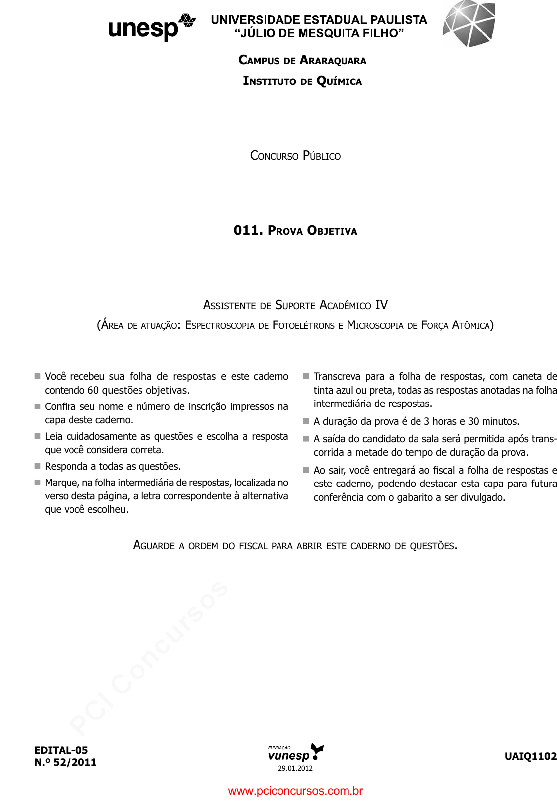 pcimarkpci MDAwMDowMDAwOjAwMDA6MDAwMDowMDAwOmZmZmY6MzZlOTpjMjU5:U2F0LCAxOCBTZXAgMjAyMSAwMDozNTozMCAtMDMwMA== Campus de araraquara InstItuto de químICa ConCurso PúbliCo 011. prova objetIva Assistente de suPorte ACAdêmiCo iV (ÁreA de AtuAção: esPeCtrosCoPiA de Fotoelétrons e miCrosCoPiA de ForçA AtômiCA) Você recebeu sua folha de respostas e este caderno contendo 60 questões objetivas. Confira seu nome e número de inscrição impressos na capa deste caderno. Leia cuidadosamente as questões e escolha a resposta que você considera correta. Responda a todas as questões. Marque, na folha intermediária de respostas, localizada no verso desta página, a letra correspondente à alternativa que você escolheu. Transcreva para a folha de respostas, com caneta de tinta azul ou preta, todas as respostas anotadas na folha intermediária de respostas. A duração da prova é de 3 horas e 30 minutos. A saída do candidato da sala será permitida após trans- corrida a metade do tempo de duração da prova. Ao sair, você entregará ao fiscal a folha de respostas e este caderno, podendo destacar esta capa para futura conferência com o gabarito a ser divulgado. AguArde A ordem do FisCAl PArA Abrir este CAderno de questões. Edital-05 n.º 52/2011 29.01.2012 uaiq1102 www.pciconcursos.com.br pcimarkpci MDAwMDowMDAwOjAwMDA6MDAwMDowMDAwOmZmZmY6MzZlOTpjMjU5:U2F0LCAxOCBTZXAgMjAyMSAwMDozNTozMCAtMDMwMA== Campus de araraquara InstItuto de químICa Folha IntermedIárIa de respostas www.pciconcursos.com.br pcimarkpci MDAwMDowMDAwOjAwMDA6MDAwMDowMDAwOmZmZmY6MzZlOTpjMjU5:U2F0LCAxOCBTZXAgMjAyMSAwMDozNTozMCAtMDMwMA== 3 UAIQ1102/011-ASAIV(EspecFotoMicrForAtômica) ConheCimentos gerais Língua Portuguesa Leia o texto para responder às questões de números 01 a 06. Os progressos na renda dos brasileiros e a decisão do governo de manter os gastos com a saúde fazem a festa das empresas farma- cêuticas. Em entrevista, o presidente da Federação Internacional da Indústria Farmacêutica, David Brennam, aponta que a taxa de crescimento das vendas de remédios no Brasil é hoje seis vezes superior ao desempenho dos mercados dos países ricos. “No Brasil, estamos vendo uma expansão do mercado de remédios da ordem de 13% por ano. Nos países ricos, ela não chega a 2%”, disse o executivo. Segundo ele, só as vendas na China batem as do Brasil. Brennam tem duas explicações para o fenômeno. A primeira delas é a maior renda do brasileiro. “Conforme a população vai saindo da pobreza e acumulando um salário melhor, a primeira coisa que as famílias buscam é melhor saúde e melhor educação,” explicou. Nesse cenário, ganha a venda de remédios no balcão. Segundo dados da Organização Mundial da Saúde (OMS), mais de 50% dos gastos no Brasil com remédios ainda vêm do bolso de cada cidadão. Outra realidade é a manutenção dos gastos do governo com a saúde. Sem o problema da dívida, o governo brasileiro e o dos demais países emergentes continuam a gastar com saúde, o que também representa um amplo mercado para as empresas farma- cêuticas. Brennam aponta para a expansão do mercado brasileiro e alerta que a disputa por patentes no Brasil obrigou-o a cancelar investimentos para a instalação de uma fábrica no País. (O Estado de S.Paulo, 04.11.2011. Adaptado) 01. Lendo o texto, conclui-se que (A) o aumento da renda da população, as melhorias salariais e os gastos do governo com saúde fazem do Brasil um mercado cobiçado pela indústria farmacêutica. (B) a venda de remédios cresce no Brasil, mas executivos da indústria farmacêutica apontam dificuldades operacio- nais provocadas pela burocracia dos países emergentes. (C) a taxa de crescimento das vendas de remédios no Brasil atingiu um patamar comparável ao dos países ricos, mas prevê-se uma desaceleração no setor farmacêutico. (D) os investimentos da indústria farmacêutica no Brasil dependem das condições oferecidas pelos governos de outros países, onde as leis trabalhistas são menos rígidas. (E) os dados de gastos do governo com a saúde no Brasil constituem fator desestimulante para as indústrias far- macêuticas que optam por mercados mais promissores. 02. As declarações de David Brennam, no texto, são (A) tendenciosas, já que não avaliam o desempenho dos países ricos no mercado produtor de remédios. (B) corporativas, pois justificam o crescimento da venda de remédios pelos esforços das empresas farmacêuticas. (C) elucidativas, porque demonstram domínio das questões ligadas à expansão do mercado de remédios no Brasil. (D) explicativas, no entanto, descartam o aumento de renda do brasileiro na aquisição dos produtos farmacêuticos. (E) legalistas, ao apontar as políticas de saúde do governo como causa exclusiva do aumento na venda de remédios. 03. Os trechos em negrito em – Os progressos na renda dos bra- sileiros e a decisão do governo de manter os gastos com a saúde fazem a festa das empresas farmacêuticas. Em en- trevista, o presidente da Federação Internacional da Indústria Farmacêutica, David Brennam, aponta que a taxa de cresci- mento das vendas de remédios no Brasil é hoje seis vezes superior ao desempenho dos mercados dos países ricos. Nesse cenário, ganha a venda de remédios no balcão. – estão corretamente reescritos, sem alteração de sentido, em: (A) fazem as empresas farmacêuticas comemorarem / equipara-se ao desempenho / Nessa paisagem (B) fazem as empresas farmacêuticas exultarem / excede o desempenho / Nesse requisito (C) fazem as empresas farmacêuticas alegrarem-se / limita-se ao desempenho / Nesse aspecto (D) fazem as empresas farmacêuticas acautelarem-se / supera o desempenho / Nessa configuração (E) fazem as empresas farmacêuticas regozijarem-se / su- planta o desempenho / Nesse quadro Para responder às questões de números 04 e 05, considere o seguinte trecho: Conforme a população vai saindo da pobreza e acumulando um salário melhor, a prime