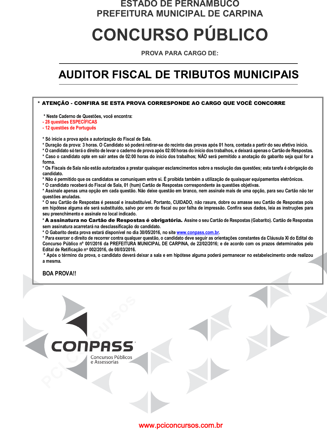 pcimarkpci MDAwMDowMDAwOjAwMDA6MDAwMDowMDAwOmZmZmY6MzZlOTpjMjU5:U2F0LCAxOCBTZXAgMjAyMSAwNjo1NzoyNyAtMDMwMA== ESTADO DE PERNAMBUCO PREFEITURA MUNICIPAL DE CARPINA * ATENÇÃO - CONFIRA SE ESTA PROVA CORRESPONDE AO CARGO QUE VOCÊ CONCORRE * Neste Caderno de Questões, você encontra: - 28 questões ESPECÍFICAS - 12 questões de Português * Só inicie a prova após a autorização do Fiscal de Sala. * Duração da prova: 3 horas. O Candidato só poderá retirar-se do recinto das provas após 01 hora, contada a partir do seu efetivo início. * O candidato só terá o direito de levar o caderno de prova após 02:00 horas do início dos trabalhos, e deixará apenas o Cartão de Respostas. * Caso o candidato opte em sair antes de 02:00 horas do início dos trabalhos; NÃO será permitido a anotação do gabarito seja qual for a forma. * Os Fiscais de Sala não estão autorizados a prestar quaisquer esclarecimentos sobre a resolução das questões; esta tarefa é obrigação do candidato. * Não é permitido que os candidatos se comuniquem entre si. É proibida também a utilização de quaisquer equipamentos eletrônicos. * O candidato receberá do Fiscal de Sala, 01 (hum) Cartão de Respostas correspondente às questões objetivas. * Assinale apenas uma opção em cada questão. Não deixe questão em branco, nem assinale mais de uma opção, para seu Cartão não ter questões anuladas. * O seu Cartão de Respostas é pessoal e insubstituível. Portanto, CUIDADO, não rasure, dobre ou amasse seu Cartão de Respostas pois em hipótese alguma ele será substituído, salvo por erro do fiscal ou por falha de impressão. Confira seus dados, leia as instruções para seu preenchimento e assinale no local indicado. * A assinatura no Cartão de Respostas é obrigatória. Assine o seu Cartão de Respostas (Gabarito). Cartão de Respostas sem assinatura acarretará na desclassificação do candidato. * O Gabarito desta prova estará disponível no dia 30/05/2016, no site www.conpass.com.br. * Para exercer o direito de recorrer contra qualquer questão, o candidato deve seguir as orientações constantes da Cláusula XI do Edital do Concurso Público nº 001/2016 da PREFEITURA MUNICIPAL DE CARPINA, de 22/02/2016; e de acordo com os prazos determinados pelo Edital de Retificação no 002/2016, de 08/03/2016. * Após o término da prova, o candidato deverá deixar a sala e em hipótese alguma poderá permanecer no estabelecimento onde realizou a mesma. BOA PROVA!! CONCURSO PÚBLICO PROVA PARA CARGO DE: AUDITOR FISCAL DE TRIBUTOS MUNICIPAIS www.pciconcursos.com.br pcimarkpci MDAwMDowMDAwOjAwMDA6MDAwMDowMDAwOmZmZmY6MzZlOTpjMjU5:U2F0LCAxOCBTZXAgMjAyMSAwNjo1NzoyNyAtMDMwMA== PARTE I – AUDITOR FISCAL DE TRIBUTOS 01 - A natureza específica do tributo é determinada pelo (a): A) Fato gerador da respectiva obrigação. B) Base de cálculo, uma vez que a Constituição Federal, em eu art. 145 § 2º, proíbe que as taxas tenham base de cálculo própria de impostos. C) Tipo de lei que cria esse tributo. D) Fato gerador da respectiva obrigação, sendo relevante, para qualifica-la, a destinação legal do produto da arrecadação. E) Alíquota que determina o percentual a ser cobrado de cada tributo. 02 - Assinale a alternativa incorreta: A) Os empréstimos compulsórios só podem ser instituídos pela União e em casos excepcionais. B) O direito tributário é um ramo do direito financeiro que estuda a relação entre o Fisco e o contribuinte, no que se refere à instituição, arrecadação, fiscalização e extinção de tributos. C) Para promover o equilíbrio socioeconômico entre os Estados é admissível que a União possa instituir tributos de modo a favorecer os Estados que estão em desvantagem. D) A União, os Estado, os Município e Distrito Federal não podem cobrar impostos de templos de qualquer culto. E) De acordo com a Constituição Federal, a competência tributária é indelegável, salvo atribuição das funções de arrecadar ou fiscalizar tributos, ou de executar leis, serviços, atos ou decisões administrativas em matéria tributária, conferida por uma pessoa jurídica de direito público a outra. 03 - Para se instituir um imposto é necessário que: A) A obrigação tenha por fato gerador uma situação que dependa de uma atividade estatal específica relativa ao contribuinte. B) Seja regulamentado por lei complementar específica para esse tributo. C) É autorizado à União instituir tributo que não seja uniforme em todo o território nacional. D) O CTN autoriza que União importe distinção ou preferência em favor de determinado Estado ou Município. E) Esteja previsto no CTN e seja instituído pelo ente político competente, dentro das limitações constitucionais impostas. 04 - Acerca da possibilidade de delegação da competência tributária é correto afirmar: A) A competência tributária é indelegável, sem exceção, por expressa vedação constitucional. B) É possível delegar a função de arrecadação e fiscalização de tributos, além de execução de leis em matéria tributária. C) É possível delegar a função de arrecadação e fiscalização de tributos, além de extinção de créditos tributários. D) É possível delegar apenas a função de fiscalização de tributos. E) Não é possível delegar a função de arrecadação e fiscalização de tributos. 05 - O Imposto sobre transmissão de bens imóveis e de direitos a eles relativos, de competência do Estado, não tem como fato gerador: A) A transmissão de direitos reais B) A transmissão de direitos do domínio útil de bens imóveis. C) A cessão de direitos relativos às transmissões da propriedade. D) A transmissão de direitos reais de garantia. E) A cessão de direitos relativos às transmissões da propriedade. 06 - Considera-se como sendo tenda, para efeito de imposto de renda: A) Qualquer tipo de acréscimo patrimonial. B) Produto do capital e acréscimo patrimonial de qualquer natureza.
