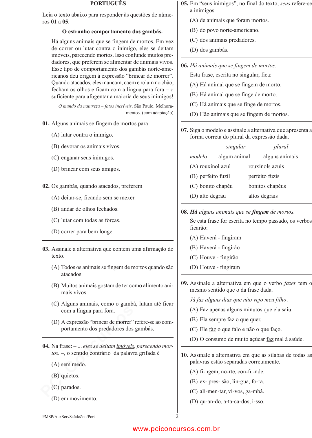 pcimarkpci MDAwMDowMDAwOjAwMDA6MDAwMDowMDAwOmZmZmY6MzZlOTpjMjU5:U2F0LCAxOCBTZXAgMjAyMSAxNToxNjoxMSAtMDMwMA== PMSP/AuxServSaúdeZoo/Port 2 PORTUGUÊS Leia o texto abaixo para responder às questões de núme- ros 01 a 05. O estranho comportamento dos gambás. Há alguns animais que se fingem de mortos. Em vez de correr ou lutar contra o inimigo, eles se deitam imóveis, parecendo mortos. Isso confunde muitos pre- dadores, que preferem se alimentar de animais vivos. Esse tipo de comportamento dos gambás norte-ame- ricanos deu origem à expressão “brincar de morrer”. Quando atacados, eles mancam, caem e rolam no chão, fecham os olhos e ficam com a língua para fora – o suficiente para afugentar a maioria de seus inimigos! O mundo da natureza – fatos incríveis. São Paulo. Melhora- mentos. (com adaptação) 01. Alguns animais se fingem de mortos para (A) lutar contra o inimigo. (B) devorar os animais vivos. (C) enganar seus inimigos. (D) brincar com seus amigos. 02. Os gambás, quando atacados, preferem (A) deitar-se, ficando sem se mexer. (B) andar de olhos fechados. (C) lutar com todas as forças. (D) correr para bem longe. 03. Assinale a alternativa que contém uma afirmação do texto. (A) Todos os animais se fingem de mortos quando são atacados. (B) Muitos animais gostam de ter como alimento ani- mais vivos. (C) Alguns animais, como o gambá, lutam até ficar com a língua para fora. (D) A expressão “brincar de morrer” refere-se ao com- portamento dos predadores dos gambás. 04. Na frase: – ... eles se deitam imóveis, parecendo mor- tos. –, o sentido contrário da palavra grifada é (A) sem medo. (B) quietos. (C) parados. (D) em movimento. 05. Em “seus inimigos”, no final do texto, seus refere-se a inimigos (A) de animais que foram mortos. (B) do povo norte-americano. (C) dos animais predadores. (D) dos gambás. 06. Há animais que se fingem de mortos. Esta frase, escrita no singular, fica: (A) Há animal que se fingem de morto. (B) Há animal que se finge de morto. (C) Há animais que se finge de mortos. (D) Hão animais que se fingem de mortos. 07. Siga o modelo e assinale a alternativa que apresenta a forma correta do plural da expressão dada. singular plural modelo: algum animal alguns animais (A) rouxinol azul rouxinols azuis (B) perfeito fuzil perfeito fuzis (C) bonito chapéu bonitos chapéus (D) alto degrau altos degrais 08. Há alguns animais que se fingem de mortos. Se esta frase for escrita no tempo passado, os verbos ficarão: (A) Haverá - fingiram (B) Haverá - fingirão (C) Houve - fingirão (D) Houve - fingiram 09. Assinale a alternativa em que o verbo fazer tem o mesmo sentido que o da frase dada. Já faz alguns dias que não vejo meu filho. (A) Faz apenas alguns minutos que ela saiu. (B) Ela sempre faz o que quer. (C) Ele faz o que falo e não o que faço. (D) O consumo de muito açúcar faz mal à saúde. 10. Assinale a alternativa em que as sílabas de todas as palavras estão separadas corretamente. (A) fi-ngem, no-rte, con-fu-nde. (B) ex- pres- são, lín-gua, fo-ra. (C) ali-men-tar, vi-vos, ga-mbá. (D) qu-an-do, a-ta-ca-dos, i-sso. www.pciconcursos.com.br www.pciconcursos.com.br pcimarkpci MDAwMDowMDAwOjAwMDA6MDAwMDowMDAwOmZmZmY6MzZlOTpjMjU5:U2F0LCAxOCBTZXAgMjAyMSAxNToxNjoxMSAtMDMwMA== 3 PMSP/AuxServSaúdeZoo/Port 11. Os gambás atacados mancam, caem e rolam no chão. O motivo do uso da vírgula na frase acima é o mesmo que na seguinte frase: (A) Os gambás soltam cheiro ruim, alimentam-se de frutas e se fingem de mortos. (B) Quando os gambás são atacados, eles se fingem de mortos. (C) Os gambás se fingem de mortos, mas outros ani- mais também. (D) Em vez de lutar contra seus inimigos, os gambás preferem se fingir de mortos. 12. Assinale a alternativa que preenche, corretamente, o espaço em branco da seguinte frase: Contra ataques, eu como um gambá. (A) se defendo (B) defendo-se (C) mim defendo (D) me defendo Leia o texto abaixo para responder às questões de núme- ros 13 a 18. Quem fica com o totó? O aposentado Antônio Fernando Noceti, de 59 anos, tem um casal de filhos mimados. Eles já completaram 10 anos, mas ainda dormem na cama do papai. E ai de quem tentar expulsá-los. Noceti anda inconsolável. Ocila Ramos, sua ex-mulher, quer tirar dele seus dois xodós. A disputa foi parar na justiça de Brasília. Na audiência, o choro do aposentado não sensibilizou o juiz. Noceti perdeu em primeira instância, mesmo ten- do o laudo de um especialista, que alertava: seus fi- lhotes poderiam sofrer de depressão, fobias e automutilação. As crianças de Noceti chamam-se Paquito e Laika. São dois cães. Derrotado, o aposen- tado solta os cachorros: “Vou lutar até o fim pelos meus filhos”. Como nos Estados Unidos, o divórcio já provoca a disputa de animais. No Brasil, até pouco tempo, pais e mães de totós eram mansos. Na separação, selavam acordos informais. O caso de Noceti é o primeiro de que se tem notícia nos tribunais do país. Época, 22.10.2002. (com adaptação) 13. De acordo com o texto, é correto afirmar que (A) Noceti tem dois meninos de 10 anos que ainda dormem na cama do pai. (B) Noceti tem dois cachorros que são tratados como filhos. (C) Noceti tem um casal de filhos e um casal de ca- chorros. (D) Noceti é o nome de um cachorro. 14. Paquito e Laika são nomes (A) de dois garotos. (B) de um menino e de uma menina. (C) de um casal de cães. (D) do aposentado e de sua mulher. 15. ..., sua ex-mulher, quer tirar dele seus dois xodós. No texto, a palavra xodós transmite sentimento de (A) desprezo. (B) vingança. (C) espanto. (D) afeto. 16. Derrotado, o aposentado solta os cachorros: “Vou lutar até o fim pelos meus filhos”. A expressão solta os cachorros quer dizer que o apo- sentado (A) ficou de mau humor. (B) ficou satisfeito. (C) mostrou-se despreocupado. (D) libertou os cachorros. Para responder às questões de números 17 e 18, conside- re a seguinte frase: 17. No Brasil, até pouco tempo, 