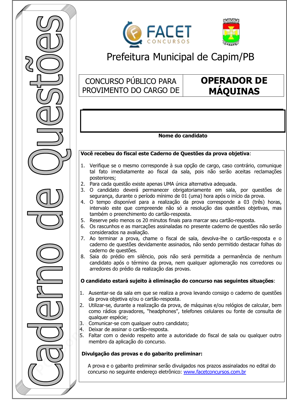 pcimarkpci MDAwMDowMDAwOjAwMDA6MDAwMDowMDAwOmZmZmY6MzZlOTpjMjU5:U2F0LCAxOCBTZXAgMjAyMSAyMDo0NzozNiAtMDMwMA== Prefeitura Municipal de Capim/PB CONCURSO PÚBLICO PARA PROVIMENTO DO CARGO DE OPERADOR DE MÁQUINAS Nome do candidato Você recebeu do fiscal este Caderno de Questões da prova objetiva: 1. Verifique se o mesmo corresponde à sua opção de cargo, caso contrário, comunique tal fato imediatamente ao fiscal da sala, pois não serão aceitas reclamações posteriores; 2. Para cada questão existe apenas UMA única alternativa adequada. 3. O candidato deverá permanecer obrigatoriamente em sala, por questões de segurança, durante o período mínimo de 01 (uma) hora após o início da prova. 4. O tempo disponível para a realização da prova corresponde a 03 (três) horas, intervalo este que compreende não só a resolução das questões objetivas, mas também o preenchimento do cartão-resposta. 5. Reserve pelo menos os 20 minutos finais para marcar seu cartão-resposta. 6. Os rascunhos e as marcações assinaladas no presente caderno de questões não serão considerados na avaliação. 7. Ao terminar a prova, chame o fiscal de sala, devolva-lhe o cartão-resposta e o caderno de questões devidamente assinados, não sendo permitido destacar folhas do caderno de questões. 8. Saia do prédio em silêncio, pois não será permitida a permanência de nenhum candidato após o término da prova, nem qualquer aglomeração nos corredores ou arredores do prédio da realização das provas. O candidato estará sujeito à eliminação do concurso nas seguintes situações: 1. Ausentar-se da sala em que se realiza a prova levando consigo o caderno de questões da prova objetiva e/ou o cartão-resposta. 2. Utilizar-se, durante a realização da prova, de máquinas e/ou relógios de calcular, bem como rádios gravadores, “headphones”, telefones celulares ou fonte de consulta de qualquer espécie; 3. Comunicar-se com qualquer outro candidato; 4. Deixar de assinar o cartão-resposta. 5. Faltar com o devido respeito ante a autoridade do fiscal de sala ou qualquer outro membro da aplicação do concurso. Divulgação das provas e do gabarito preliminar: A prova e o gabarito preliminar serão divulgados nos prazos assinalados no edital do concurso no seguinte endereço eletrônico: www.facetconcursos.com.br pcimarkpci MDAwMDowMDAwOjAwMDA6MDAwMDowMDAwOmZmZmY6MzZlOTpjMjU5:U2F0LCAxOCBTZXAgMjAyMSAyMDo0NzozNiAtMDMwMA== pcimarkpci MDAwMDowMDAwOjAwMDA6MDAwMDowMDAwOmZmZmY6MzZlOTpjMjU5:U2F0LCAxOCBTZXAgMjAyMSAyMDo0NzozNiAtMDMwMA== 2 Prefeitura Municipal de Capim CONCURSO PÚBLICO PARA PROVIMENTO DO CARGO DE OPERADOR DE MÁQUINAS PORTUGUÊS Leia o texto abaixo e, em seguida, responda às questões pertinentes: Mila (Carlos Heitor Cony) Era pouco mais do que minha mão: por isso eu precisei das duas para segurá-la, 13 anos atrás. E, como eu não tinha muito jeito, encostei-a ao peito para que ela não caísse, simples apoio nessa primeira vez. Gostei desse calor e acredito que ela também. Dias depois, quando abriu os olhinhos, olhou-me fundamente: escolheu-me para dono. Pior: me aceitou. Foram 13 anos de chamego e encanto. Dormimos muitas noites juntos, a patinha dela em cima do meu ombro. Tinha medo de vento. O que fazer contra o vento? Amá-la – foi a resposta, e acredito que ela entendeu isso. Formamos, ela e eu, uma dupla dinâmica contra as ciladas que se armam. E também contra aqueles que não aceitam os que se amam. Quando meu pai morreu, ela se chegou, solidária, encostou sua cabeça em meus joelhos, não exigiu a minha festa, não queria disputar espaço, ser maior do que a minha tristeza. Tendo-a ao meu lado, eu perdi o medo do mundo e do vento. E ela teve uma ninhada de nove filhotes, escolhi uma de suas filhinhas e nossa dupla ficou mais dupla porque passamos a ser três. E passeávamos pela Lagoa, com a idade ela adquiriu “fumos fidalgos”, como o Dom Casmurro, de Machado de Assis. Era uma lady, uma rainha de Sabá numa liteira inundada de sol e transportada por súditos imaginários. No sábado, olhando-me nos olhos, com seus olhinhos cor de mel, bonita como nunca, mais que amada de todas, deixou que eu a beijasse chorando. Talvez ela tenha compreendido. Bem maior do que minha mão, bem maior do que o meu peito, levei-a até o fim. Eu me considerava um profissional decente. Até semana passada, houvesse o que houvesse, procurava cumprir o dever dentro de minhas limitações. Não foi possível chegar ao gabinete onde, quietinha, deitada a meus pés, esperava que eu acabasse a crônica para ficar com ela. Até o último momento, olhou para mim, me acolhendo e me aceitando. Levei-a, em meus braços, apoiada em meu peito. Apertei-a com força, sabendo que ela seria maior do que a saudade. As Cem Melhores Crônicas Brasileiras / Joaquim Ferreira dos Santos, organização e introdução. Rio de Janeiro: Objetiva, 2007. 356 p. 1. Assinale a alternativa CORRETA, de acordo com o texto: a O texto conta a história de amor entre um homem e sua criança adotada. b O narrador decidiu, resolutamente, que só ficaria com o animal por até treze anos. c Os treze anos de convívio foram marcados por conflitos e discórdias. d A relação de treze anos foi caracterizada por afeto, companheirismo e amor, entre o narrador e o animal. e O animal foi escolhido pelo narrador para ser companheiro deste. 2. Marque a opção INCORRETA, de acordo com o texto: a O narrador dormia ao lado de seu animal, porque vivia na solidão. b O bicho se fez companhia solidária nos momentos de dor. c Houve uma relação de amor correspondido, fixado entre o narrador e o animal. d A companhia do animal transmitia ao narrador uma sensação de segurança e de amparo. e O animal tinha medo do vento. 3. Marque a opção CORRETA, de acordo com o texto: a O narrador se recusou a ser o dono do animal. b Narrador e animal continuam vivendo juntos, depois de treze anos. c Como treze é o número do azar, o narrador achou por b