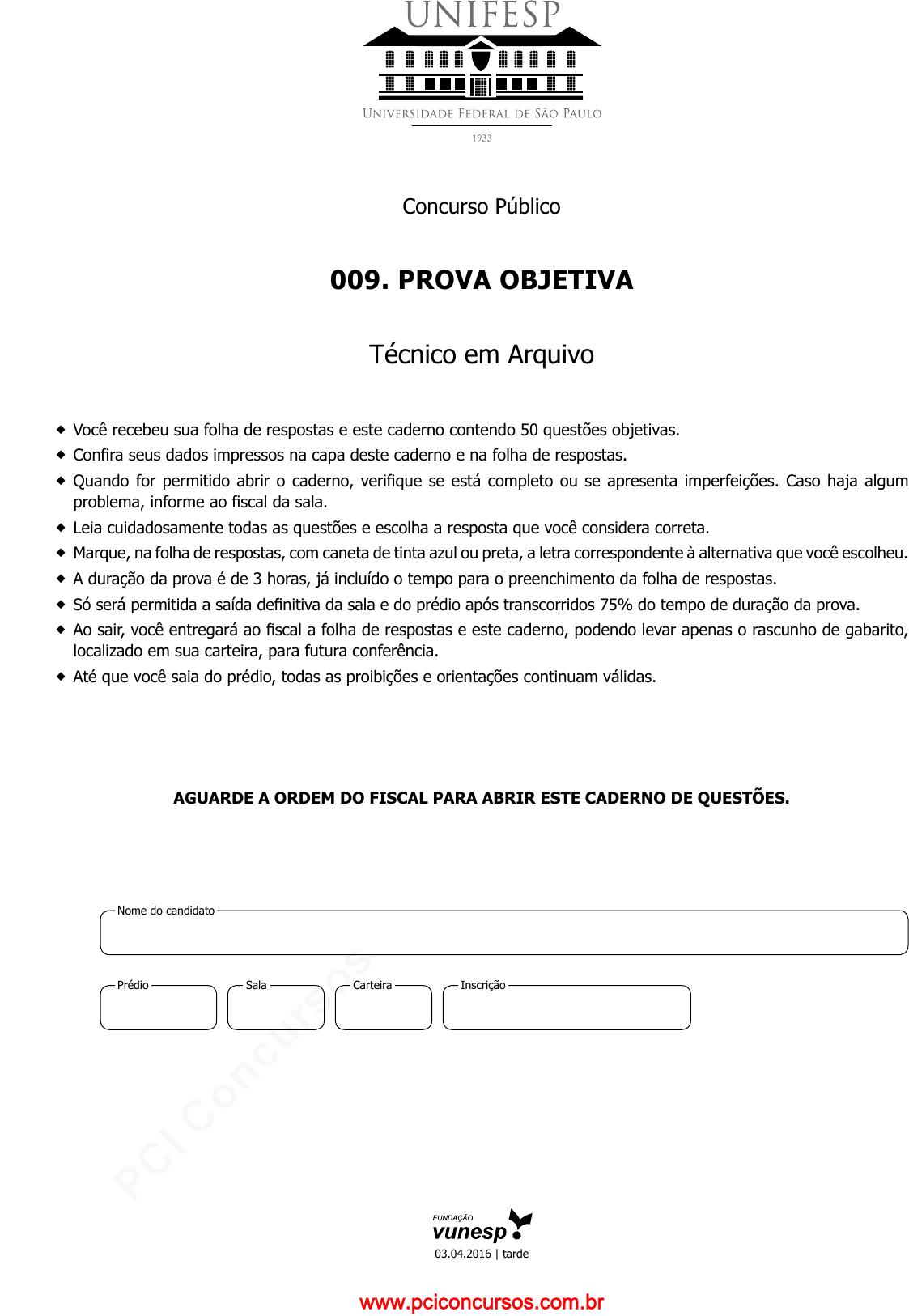 pcimarkpci MDAwMDowMDAwOjAwMDA6MDAwMDowMDAwOmZmZmY6MzZlOTpjMjU5:U2F0LCAxMSBTZXAgMjAyMSAwNzo1NDoyOCAtMDMwMA== Concurso Público 009. Prova objetiva Técnico em Arquivo � Você recebeu sua folha de respostas e este caderno contendo 50 questões objetivas. � Confira seus dados impressos na capa deste caderno e na folha de respostas. � Quando for permitido abrir o caderno, verifique se está completo ou se apresenta imperfeições. Caso haja algum problema, informe ao fiscal da sala. � Leia cuidadosamente todas as questões e escolha a resposta que você considera correta. � Marque, na folha de respostas, com caneta de tinta azul ou preta, a letra correspondente à alternativa que você escolheu. � A duração da prova é de 3 horas, já incluído o tempo para o preenchimento da folha de respostas. � Só será permitida a saída definitiva da sala e do prédio após transcorridos 75% do tempo de duração da prova. � Ao sair, você entregará ao fiscal a folha de respostas e este caderno, podendo levar apenas o rascunho de gabarito, localizado em sua carteira, para futura conferência. � Até que você saia do prédio, todas as proibições e orientações continuam válidas. aguarde a ordem do fiscal Para abrir este caderno de questões. 03.04.2016 | tarde Nome do candidato Prédio Sala Carteira Inscrição www.pciconcursos.com.br pcimarkpci MDAwMDowMDAwOjAwMDA6MDAwMDowMDAwOmZmZmY6MzZlOTpjMjU5:U2F0LCAxMSBTZXAgMjAyMSAwNzo1NDoyOCAtMDMwMA== www.pciconcursos.com.br pcimarkpci MDAwMDowMDAwOjAwMDA6MDAwMDowMDAwOmZmZmY6MzZlOTpjMjU5:U2F0LCAxMSBTZXAgMjAyMSAwNzo1NDoyOCAtMDMwMA== 3 UFSP1503/009-TécArquivo-Tarde conhecimentos gerais Língua Portuguesa 01. Leia a charge. (Duke. www.otempo.com.br, 19.01.2016) As frases da personagem mostram-na como uma pessoa (A) indiferente. (B) resoluta. (C) hesitante. (D) irredutível. (E) intrépida. Leia o texto para responder às questões de números 02 a 08. É permitido sonhar Os bastidores do vestibular são cheios de histórias – curiosas, estranhas, comoventes. O jovem que chega atrasa- do por alguns segundos, por exemplo, é uma figura clássica, e patética. Mas existem outras figuras capazes de chamar a atenção. Takeshi Nojima é um caso. Ele fez vestibular para a Fa- culdade de Medicina da Universidade do Paraná. Veio do Ja- pão aos 11 anos, trabalhou em várias coisas, e agora quer começar uma carreira médica. Nada surpreendente, não fosse a idade do Takeshi: ele tem 80 anos. Isto mesmo, 80. Numa fase em que outros já passaram até da aposentadoria compulsória, ele se prepara para iniciar nova vida. E o faz tranquilo: “Cuidei de meus pais, cuidei dos meus filhos. Agora posso realizar um sonho que trago da infância”. Não faltará quem critique Takeshi Nojima: ele está tirando o lugar de jovens, dirá algum darwinista social. Eu ponderaria que nem tudo na vida se regula pelo critério cronológico. Há pais que passam muito pouco tempo com os filhos e nem por isso são maus pais; o que interessa é a qualidade do tempo, não a quantidade. Talvez a expectativa de vida não permita ao vestibulando Nojima uma longa carreira na profis- são médica. Mas os anos, ou meses, ou mesmo os dias que dedicar a seus pacientes terão em si a carga afetiva de uma existência inteira. Não sei se Takeshi Nojima passou no vestibular; a no- tícia que li não esclarecia a respeito. Mas ele mesmo disse que isto não teria importância: se fosse reprovado, começaria tudo de novo. E aí de novo ele dá um exemplo. Os resultados do difícil exame trazem desilusão para muitos jovens, e não são poucos os que pensam em desistir por causa de um fra- casso. A estes eu digo: antes de abandonar a luta, pensem em Takeshi Nojima, pensem na força de seu sonho. Sonhar não é proibido. É um dever. (Moacyr Scliar. Minha mãe não dorme enquanto eu não chegar, 1996. Adaptado) 02. Para o narrador, a história de Takeshi Nojima chama a atenção porque este (A) inventou novos sonhos para não levar uma vida ociosa. (B) veio do Japão e trabalhou em várias coisas antes de estudar. (C) foi um filho dedicado e um pai responsável. (D) é um senhor de 80 anos que decidiu voltar a estudar. (E) está preocupado em obter a aposentadoria compul- sória. 03. Em relação à atitude de Takeshi Nojima, o narrador (A) concorda com ela, pois acredita que a expectativa de vida dele será muito alta. (B) discorda dela, pois acredita que ele realmente estará tirando o lugar de jovens. (C) concorda com ela, pois acredita que uma pessoa deva perseguir os seus sonhos. (D) discorda dela, pois acredita que ele terá uma atua- ção profissional lastimável. (E) concorda com ela, pois acredita que ele esteja só se divertindo com a situação. www.pciconcursos.com.br pcimarkpci MDAwMDowMDAwOjAwMDA6MDAwMDowMDAwOmZmZmY6MzZlOTpjMjU5:U2F0LCAxMSBTZXAgMjAyMSAwNzo1NDoyOCAtMDMwMA== 4UFSP1503/009-TécArquivo-Tarde 04. No último parágrafo do texto, na passagem –… se fosse reprovado, começaria tudo de novo. E aí de novo ele dá um exemplo. –, a repetição das expressões em destaque ressalta a ideia de (A) perseverança. (B) desilusão. (C) proibição. (D) abandono. (E) fracasso. 05. Observe as passagens: – … e agora quer começar uma carreira médica. (2o pa- rágrafo); – … ele tem 80 anos. Isto mesmo, 80. (3o parágrafo); – Talvez a expectativa de vida não permita… (4o pará- grafo). As expressões destacadas expressam, respectivamente, sentido de (A) lugar, modo e causa. (B) tempo, afirmação e dúvida. (C) afirmação, afirmação e dúvida. (D) tempo, modo e afirmação. (E) modo, dúvida e intensidade. 06. O emprego do adjetivo anteposto ao substantivo realça a qualidade que a este se atribui, o que se pode comprovar com a expressão em destaque na seguinte passagem do texto: (A) Os bastidores do vestibular são cheios de histórias – curiosas, estranhas, comoventes. (B) O jovem que chega atrasado por alguns segundos, por exemplo, é uma figura c