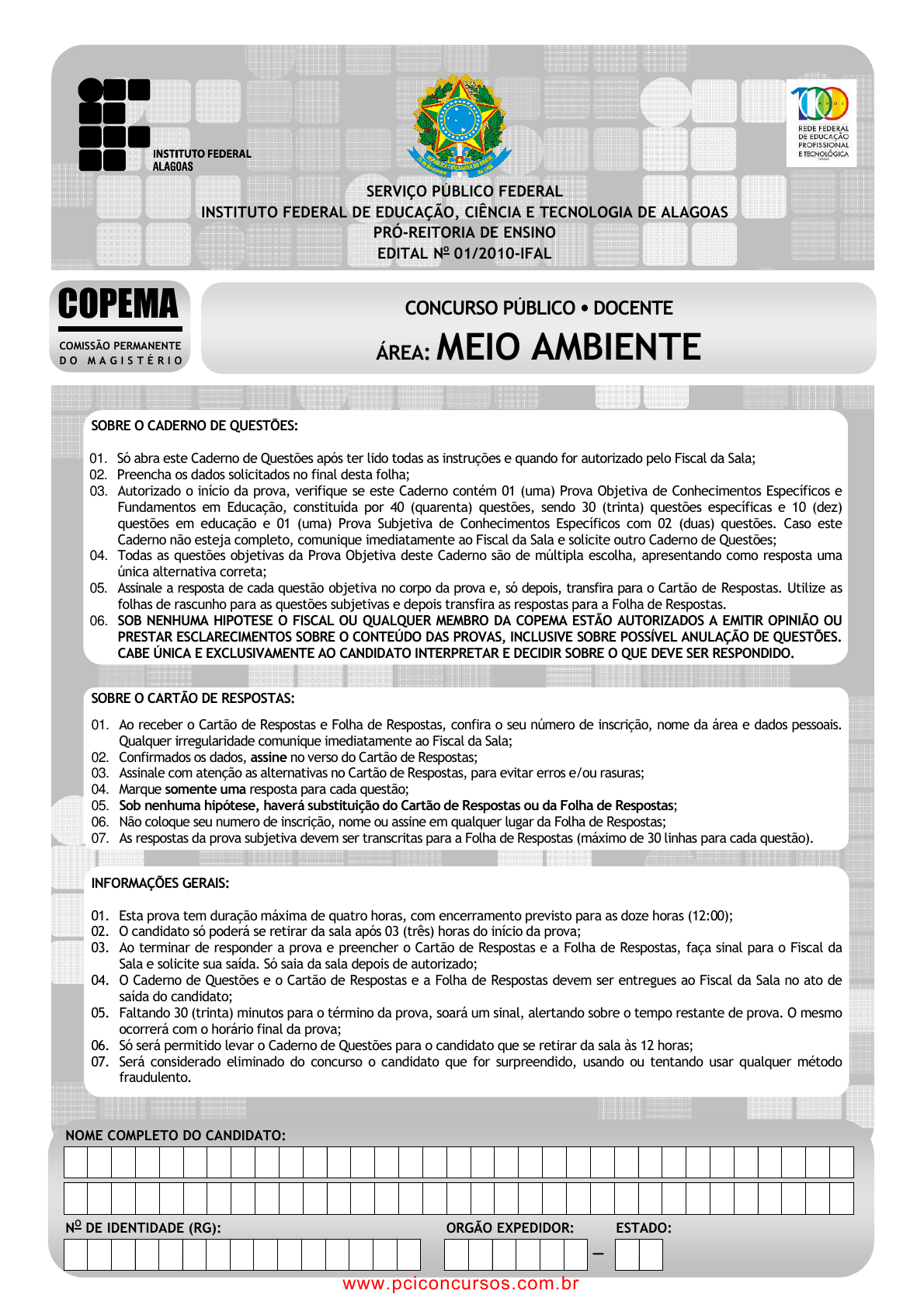 pcimarkpci MDAwMDowMDAwOjAwMDA6MDAwMDowMDAwOmZmZmY6MzZlOTpjMjU5:VGh1LCAxNiBTZXAgMjAyMSAxOTozODoyMCAtMDMwMA== CONCURSO PÚBLICO – DOCENTE ÁREA: MEIO AMBIENTE EDITAL No 01/2010-IFAL . 1 Área: Meio Ambiente INSTITUTO FEDERAL DE ALAGOAS SERVIÇO PÚBLICO FEDERAL INSTITUTO FEDERAL DE EDUCAÇÃO, CIÊNCIA E TECNOLOGIA DE ALAGOAS PRÓ-REITORIA DE ENSINO EDITAL No 01/2010-IFAL CONCURSO PÚBLICO ���� DOCENTE ÁREA: MEIO AMBIENTE – NOME COMPLETO DO CANDIDATO: NO DE IDENTIDADE (RG): ORGÃO EXPEDIDOR: ESTADO: COPEMA COMISSÃO PERMANENTE D O M A G I S T É R I O SOBRE O CADERNO DE QUESTÕES: 01. Só abra este Caderno de Questões após ter lido todas as instruções e quando for autorizado pelo Fiscal da Sala; 02. Preencha os dados solicitados no final desta folha; 03. Autorizado o início da prova, verifique se este Caderno contém 01 (uma) Prova Objetiva de Conhecimentos Específicos e Fundamentos em Educação, constituída por 40 (quarenta) questões, sendo 30 (trinta) questões específicas e 10 (dez) questões em educação e 01 (uma) Prova Subjetiva de Conhecimentos Específicos com 02 (duas) questões. Caso este Caderno não esteja completo, comunique imediatamente ao Fiscal da Sala e solicite outro Caderno de Questões; 04. Todas as questões objetivas da Prova Objetiva deste Caderno são de múltipla escolha, apresentando como resposta uma única alternativa correta; 05. Assinale a resposta de cada questão objetiva no corpo da prova e, só depois, transfira para o Cartão de Respostas. Utilize as folhas de rascunho para as questões subjetivas e depois transfira as respostas para a Folha de Respostas. 06. SOB NENHUMA HIPOTESE O FISCAL OU QUALQUER MEMBRO DA COPEMA ESTÃO AUTORIZADOS A EMITIR OPINIÃO OU PRESTAR ESCLARECIMENTOS SOBRE O CONTEÚDO DAS PROVAS, INCLUSIVE SOBRE POSSÍVEL ANULAÇÃO DE QUESTÕES. CABE ÚNICA E EXCLUSIVAMENTE AO CANDIDATO INTERPRETAR E DECIDIR SOBRE O QUE DEVE SER RESPONDIDO. SOBRE O CARTÃO DE RESPOSTAS: 01. Ao receber o Cartão de Respostas e Folha de Respostas, confira o seu número de inscrição, nome da área e dados pessoais. Qualquer irregularidade comunique imediatamente ao Fiscal da Sala; 02. Confirmados os dados, assine no verso do Cartão de Respostas; 03. Assinale com atenção as alternativas no Cartão de Respostas, para evitar erros e/ou rasuras; 04. Marque somente uma resposta para cada questão; 05. Sob nenhuma hipótese, haverá substituição do Cartão de Respostas ou da Folha de Respostas; 06. Não coloque seu numero de inscrição, nome ou assine em qualquer lugar da Folha de Respostas; 07. As respostas da prova subjetiva devem ser transcritas para a Folha de Respostas (máximo de 30 linhas para cada questão). INFORMAÇÕES GERAIS: 01. Esta prova tem duração máxima de quatro horas, com encerramento previsto para as doze horas (12:00); 02. O candidato só poderá se retirar da sala após 03 (três) horas do início da prova; 03. Ao terminar de responder a prova e preencher o Cartão de Respostas e a Folha de Respostas, faça sinal para o Fiscal da Sala e solicite sua saída. Só saia da sala depois de autorizado; 04. O Caderno de Questões e o Cartão de Respostas e a Folha de Respostas devem ser entregues ao Fiscal da Sala no ato de saída do candidato; 05. Faltando 30 (trinta) minutos para o término da prova, soará um sinal, alertando sobre o tempo restante de prova. O mesmo ocorrerá com o horário final da prova; 06. Só será permitido levar o Caderno de Questões para o candidato que se retirar da sala às 12 horas; 07. Será considerado eliminado do concurso o candidato que for surpreendido, usando ou tentando usar qualquer método fraudulento. www.pciconcursos.com.br pcimarkpci MDAwMDowMDAwOjAwMDA6MDAwMDowMDAwOmZmZmY6MzZlOTpjMjU5:VGh1LCAxNiBTZXAgMjAyMSAxOTozODoyMCAtMDMwMA== CONCURSO PÚBLICO – DOCENTE ÁREA: MEIO AMBIENTE EDITAL No 01/2010-IFAL . 2 Área: Meio Ambiente INSTITUTO FEDERAL DE ALAGOAS PROVA OBJETIVA 1. A possibilidade ou não de aproveitamento do nitrogênio atmosférico pelos seres vivos está representada no esquema a seguir. Para quais itens acima ocorre esse aproveitamento? a) II e IV. b) III e IV. c) I e III. d) IV e V. e) II e V. 2. Os problemas ambientais têm despertado enorme preocupação em todo o mundo, por isso são realizados vários encontros para tratar do tema, como em Johanesburgo (África do Sul). Sobre as questões ambientais, avalie as afirmativas a seguir: I. O aquecimento global, resultante do chamado “efeito estufa”, é um dos problemas ambientais da atualidade, pois já se verifica suas consequências em nível global. II. A crise ambiental atinge exclusivamente os países ricos, pois é uma consequência direta da produção industrial, inexistente nos países pobres. III. No século passado, ficou conhecida uma série de propostas dos países ricos para superação dos problemas ambientais, propostas estas que contaram com o apoio unânime do G-7 (Estados Unidos, Japão, Alemanha, França, Brasil, Itália e Canadá). Assinale a alternativa CORRETA: a) Apenas a afirmativa I está correta. b) Apenas a afirmativa II está correta. c) Apenas a afirmativa III está correta. d) As afirmativas I e II estão corretas. e) As afirmativas II e III estão corretas. 3. Ondas são perturbações periódicas ou oscilações de partículas ou do espaço por meio das quais muitas formas de energia se propagam a partir de suas fontes. Quanto às propriedades das ondas: I. Duas ou mais ondas de mesma frequência, quando sobrepostas, formam uma única onda composta, resultado da adição simples dos deslocamentos das ondas componentes. II. Ondas que oscilam em fases diferentes não se sobrepõem. Neste caso, elas se cancelam uma à outra. III. As ondas podem ser refletidas quando encontram obstáculos. Se as ondas refletidas percorrerem a trajetória original da onda incidente, elas se sobrepõem. IV. A velocidade de uma onda depende da natureza do meio de propagação. Estão CORRETOS os i