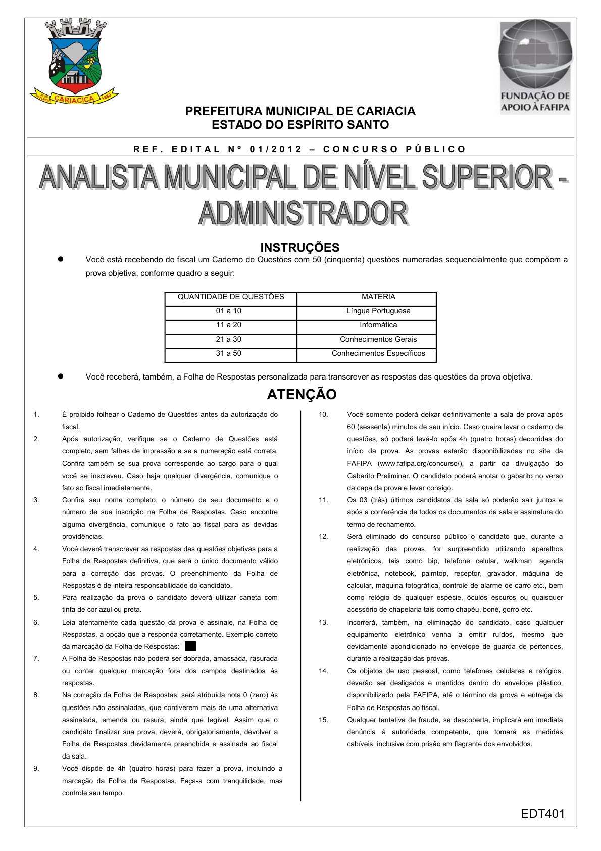 pcimarkpci MDAwMDowMDAwOjAwMDA6MDAwMDowMDAwOmZmZmY6MzZlOTpjMjU5:VGh1LCAxNiBTZXAgMjAyMSAyMDoxMToyMiAtMDMwMA== www.pciconcursos.com.br PREFEITURA MUNICIPAL DE CARIACIA ESTADO DO ESPÍRITO SANTO R E F . E D I T A L N º 0 1 / 2 0 1 2 – C O N C U R S O P Ú B L I C O INSTRUÇÕES Você está recebendo do fiscal um Caderno de Questões com 50 (cinquenta) questões numeradas sequencialmente que compõem a prova objetiva, conforme quadro a seguir: QUANTIDADE DE QUESTÕES MATÉRIA 01 a 10 Língua Portuguesa 11 a 20 Informática 21 a 30 Conhecimentos Gerais 31 a 50 Conhecimentos Específicos Você receberá, também, a Folha de Respostas personalizada para transcrever as respostas das questões da prova objetiva. ATENÇÃO 1. É proibido folhear o Caderno de Questões antes da autorização do fiscal. 2. Após autorização, verifique se o Caderno de Questões está completo, sem falhas de impressão e se a numeração está correta. Confira também se sua prova corresponde ao cargo para o qual você se inscreveu. Caso haja qualquer divergência, comunique o fato ao fiscal imediatamente. 3. Confira seu nome completo, o número de seu documento e o número de sua inscrição na Folha de Respostas. Caso encontre alguma divergência, comunique o fato ao fiscal para as devidas providências. 4. Você deverá transcrever as respostas das questões objetivas para a Folha de Respostas definitiva, que será o único documento válido para a correção das provas. O preenchimento da Folha de Respostas é de inteira responsabilidade do candidato. 5. Para realização da prova o candidato deverá utilizar caneta com tinta de cor azul ou preta. 6. Leia atentamente cada questão da prova e assinale, na Folha de Respostas, a opção que a responda corretamente. Exemplo correto da marcação da Folha de Respostas: 7. A Folha de Respostas não poderá ser dobrada, amassada, rasurada ou conter qualquer marcação fora dos campos destinados às respostas. 8. Na correção da Folha de Respostas, será atribuída nota 0 (zero) às questões não assinaladas, que contiverem mais de uma alternativa assinalada, emenda ou rasura, ainda que legível. Assim que o candidato finalizar sua prova, deverá, obrigatoriamente, devolver a Folha de Respostas devidamente preenchida e assinada ao fiscal da sala. 9. Você dispõe de 4h (quatro horas) para fazer a prova, incluindo a marcação da Folha de Respostas. Faça-a com tranquilidade, mas controle seu tempo. 10. Você somente poderá deixar definitivamente a sala de prova após 60 (sessenta) minutos de seu início. Caso queira levar o caderno de questões, só poderá levá-lo após 4h (quatro horas) decorridas do início da prova. As provas estarão disponibilizadas no site da FAFIPA (www.fafipa.org/concurso/), a partir da divulgação do Gabarito Preliminar. O candidato poderá anotar o gabarito no verso da capa da prova e levar consigo. 11. Os 03 (três) últimos candidatos da sala só poderão sair juntos e após a conferência de todos os documentos da sala e assinatura do termo de fechamento. 12. Será eliminado do concurso público o candidato que, durante a realização das provas, for surpreendido utilizando aparelhos eletrônicos, tais como bip, telefone celular, walkman, agenda eletrônica, notebook, palmtop, receptor, gravador, máquina de calcular, máquina fotográfica, controle de alarme de carro etc., bem como relógio de qualquer espécie, óculos escuros ou quaisquer acessório de chapelaria tais como chapéu, boné, gorro etc. 13. Incorrerá, também, na eliminação do candidato, caso qualquer equipamento eletrônico venha a emitir ruídos, mesmo que devidamente acondicionado no envelope de guarda de pertences, durante a realização das provas. 14. Os objetos de uso pessoal, como telefones celulares e relógios, deverão ser desligados e mantidos dentro do envelope plástico, disponibilizado pela FAFIPA, até o término da prova e entrega da Folha de Respostas ao fiscal. 15. Qualquer tentativa de fraude, se descoberta, implicará em imediata denúncia à autoridade competente, que tomará as medidas cabíveis, inclusive com prisão em flagrante dos envolvidos. EDT401 pcimarkpci MDAwMDowMDAwOjAwMDA6MDAwMDowMDAwOmZmZmY6MzZlOTpjMjU5:VGh1LCAxNiBTZXAgMjAyMSAyMDoxMToyMiAtMDMwMA== www.pciconcursos.com.br --------------------------------------------------------------------------------(destaque aqui)----------------------------------------------------------------------- FOLHA PARA ANOTAÇÃO DAS RESPOSTAS DO CANDIDATO QUESTÃO 01 02 03 04 05 06 07 08 09 10 11 12 13 14 15 16 17 18 19 20 21 22 23 24 25 RESP. QUESTÃO 26 27 28 29 30 31 32 33 34 35 36 37 38 39 40 41 42 43 44 45 46 47 48 49 50 RESP. pcimarkpci MDAwMDowMDAwOjAwMDA6MDAwMDowMDAwOmZmZmY6MzZlOTpjMjU5:VGh1LCAxNiBTZXAgMjAyMSAyMDoxMToyMiAtMDMwMA== www.pciconcursos.com.br CARGO: ANALISTA MUNICIPAL DE NÍVEL SUPERIOR - ADMINISTRADOR - 3 - LÍNGUA PORTUGUESA A Igreja da Mãe dos Homens Paulo Pacini 1.° Na rua da Alfândega, perto da Av. Rio Branco, encontra-se uma das igrejas menos conhecidas do centro do Rio, em que pese sua antiguidade e beleza. Dedicada a N.Sª Mãe dos Homens, este templo origina-se no século XVIII, e teve ligação com acontecimentos importantes da história carioca e brasileira. 2.° Quando o trecho da rua da Alfândega (antigo caminho de Capurerussú) ainda era chamado de Quitanda do Marisco, nome devido à existência de um estabelecimento na esquina da atual rua da Quitanda, erigiu-se um oratório com a imagem da Mãe dos Homens, junto ao qual, à noite, e sob a luz baça das lâmpadas de azeite de baleia, fiéis se reuniam e invocavam as graças da santa. O crescente número de devotos levou à construção de uma pequena capela, e em 1758 é fundada uma agremiação em seu nome. Doações possibilitariam, anos depois, o início das obras do templo atual. As primeiras iniciativas datam de 1779, e os trabalhos continuariam até o século seguinte. Com estilo arquitetônico barroco, po