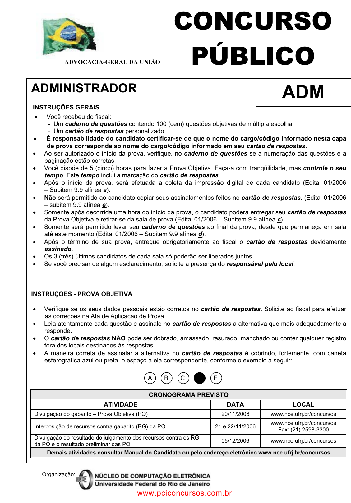 pcimarkpci MDAwMDowMDAwOjAwMDA6MDAwMDowMDAwOmZmZmY6MzZlOTpjMjU5:VGh1LCAxNiBTZXAgMjAyMSAyMDozMzozMiAtMDMwMA== CONCURSO PÚBLICO INSTRUÇÕES GERAIS Você recebeu do fiscal: - Um caderno de questões contendo 100 (cem) questões objetivas de múltipla escolha; - Um cartão de respostas personalizado. É responsabilidade do candidato certificar-se de que o nome do cargo/código informado nesta capa de prova corresponde ao nome do cargo/código informado em seu cartão de respostas. Ao ser autorizado o início da prova, verifique, no caderno de questões se a numeração das questões e a paginação estão corretas. Você dispõe de 5 (cinco) horas para fazer a Prova Objetiva. Faça-a com tranqüilidade, mas controle o seu tempo. Este tempo inclui a marcação do cartão de respostas. Após o início da prova, será efetuada a coleta da impressão digital de cada candidato (Edital 01/2006 – Subitem 9.9 alínea a). Não será permitido ao candidato copiar seus assinalamentos feitos no cartão de respostas. (Edital 01/2006 – subitem 9.9 alínea e). Somente após decorrida uma hora do início da prova, o candidato poderá entregar seu cartão de respostas da Prova Objetiva e retirar-se da sala de prova (Edital 01/2006 – Subitem 9.9 alínea c). Somente será permitido levar seu caderno de questões ao final da prova, desde que permaneça em sala até este momento (Edital 01/2006 – Subitem 9.9 alínea d). Após o término de sua prova, entregue obrigatoriamente ao fiscal o cartão de respostas devidamente assinado. Os 3 (três) últimos candidatos de cada sala só poderão ser liberados juntos. Se você precisar de algum esclarecimento, solicite a presença do responsável pelo local. INSTRUÇÕES - PROVA OBJETIVA Verifique se os seus dados pessoais estão corretos no cartão de respostas. Solicite ao fiscal para efetuar as correções na Ata de Aplicação de Prova. Leia atentamente cada questão e assinale no cartão de respostas a alternativa que mais adequadamente a responde. O cartão de respostas NÃO pode ser dobrado, amassado, rasurado, manchado ou conter qualquer registro fora dos locais destinados às respostas. A maneira correta de assinalar a alternativa no cartão de respostas é cobrindo, fortemente, com caneta esferográfica azul ou preta, o espaço a ela correspondente, conforme o exemplo a seguir: CRONOGRAMA PREVISTO ATIVIDADE DATA LOCAL Divulgação do gabarito – Prova Objetiva (PO) 20/11/2006 www.nce.ufrj.br/concursos Interposição de recursos contra gabarito (RG) da PO 21 e 22/11/2006 www.nce.ufrj.br/concursos Fax: (21) 2598-3300 Divulgação do resultado do julgamento dos recursos contra os RG da PO e o resultado preliminar das PO 05/12/2006 www.nce.ufrj.br/concursos Demais atividades consultar Manual do Candidato ou pelo endereço eletrônico www.nce.ufrj.br/concursos ADMINISTRADOR Organização: A B C D E ADM ADVOCACIA-GERAL DA UNIÃO www.pciconcursos.com.br pcimarkpci MDAwMDowMDAwOjAwMDA6MDAwMDowMDAwOmZmZmY6MzZlOTpjMjU5:VGh1LCAxNiBTZXAgMjAyMSAyMDozMzozMiAtMDMwMA== www.pciconcursos.com.br pcimarkpci MDAwMDowMDAwOjAwMDA6MDAwMDowMDAwOmZmZmY6MzZlOTpjMjU5:VGh1LCAxNiBTZXAgMjAyMSAyMDozMzozMiAtMDMwMA== 3 ADMINISTRADOR Organização: Núcleo de Computação Eletrônica ADVOCACIA-GERAL DA UNIÃO LÍNGUA PORTUGUESA TEXTO – A PUBLICIDADE INFANTIL DEVE SER PROIBIDA POR LEI? Gilberto C. Leifert Há um caminho simples: proibir. Há o caminho correto: educar. Pois cidadãos responsáveis e consumidores conscientes se forjam com informação. Até recentemente, a sociedade entendia ser a educação tarefa exclusiva de pais e professores. Sabiamente, esse conceito evoluiu. Cobra-se, agora, o compromisso de educar também de veículos de comunicação, publicidade, das artes etc. Não poderia haver reivindicação mais justa, dada a importância da educação – desde que não se esqueça o essencial: a responsabilidade de pais e professores continua sendo intransferível. O Conar aplica o Código Brasileiro, que cuida da publicidade em geral e que acaba de ser atualizado e ampliado em relação aos anúncios de produtos e serviços destinados a crianças e adolescentes. A auto- regulamentação recomenda ainda que os anúncios não desmereçam valores sociais ou provoquem discriminação, em particular daqueles que não sejam consumidores do produto, tampouco associem crianças e adolescentes a situações incompatíveis com sua condição, sejam elas ilegais, perigosas ou socialmente condenáveis. Mais: a publicidade, entre outras recomendações, não deve: impor a noção de que o consumo do produto proporciona superioridade ou, na sua falta, inferioridade; provocar situação de constrangimento aos pais com o propósito de impingir o consumo; empregar crianças e adolescentes como modelos para vocalizar apelo direto, recomendação ou sugestão de uso ou consumo, tipo “peça para mamãe comprar” ou “faça como eu, use”. Essas recomendações – e outras mais – são, para o Conar, contribuições muito mais efetivas à formação dos futuros consumidores do que a simplista proibição das mensagens. Lembrando B. Russel: para todo problema complicado há uma solução simples, rápida, de baixo custo e ..... errada. 01 – Levando-se em consideração a pergunta do título do texto, podemos dizer que a resposta dada para ela, no primeiro parágrafo do texto, é: (A) Sim, pois é mais fácil proibir do que educar; (B) Não, já que o caminho mais adequado é o de educar; (C) Não, porque educar é mais simples; (D) Sim, pois é necessário conscientizar os cidadãos; (E) Sim, mas o proibir deve ser acompanhado do educar. 02 – “Há um caminho simples: proibir. Há o caminho correto: educar”. Sobre os elementos estruturadores desse segmento do texto, a única afirmação INCORRETA é: (A) Os vocábulos simples e correto funcionam como antônimos no texto; (B) A presença do artigo o indica que só há um caminho correto: educar; (C) Entre os dois períodos há