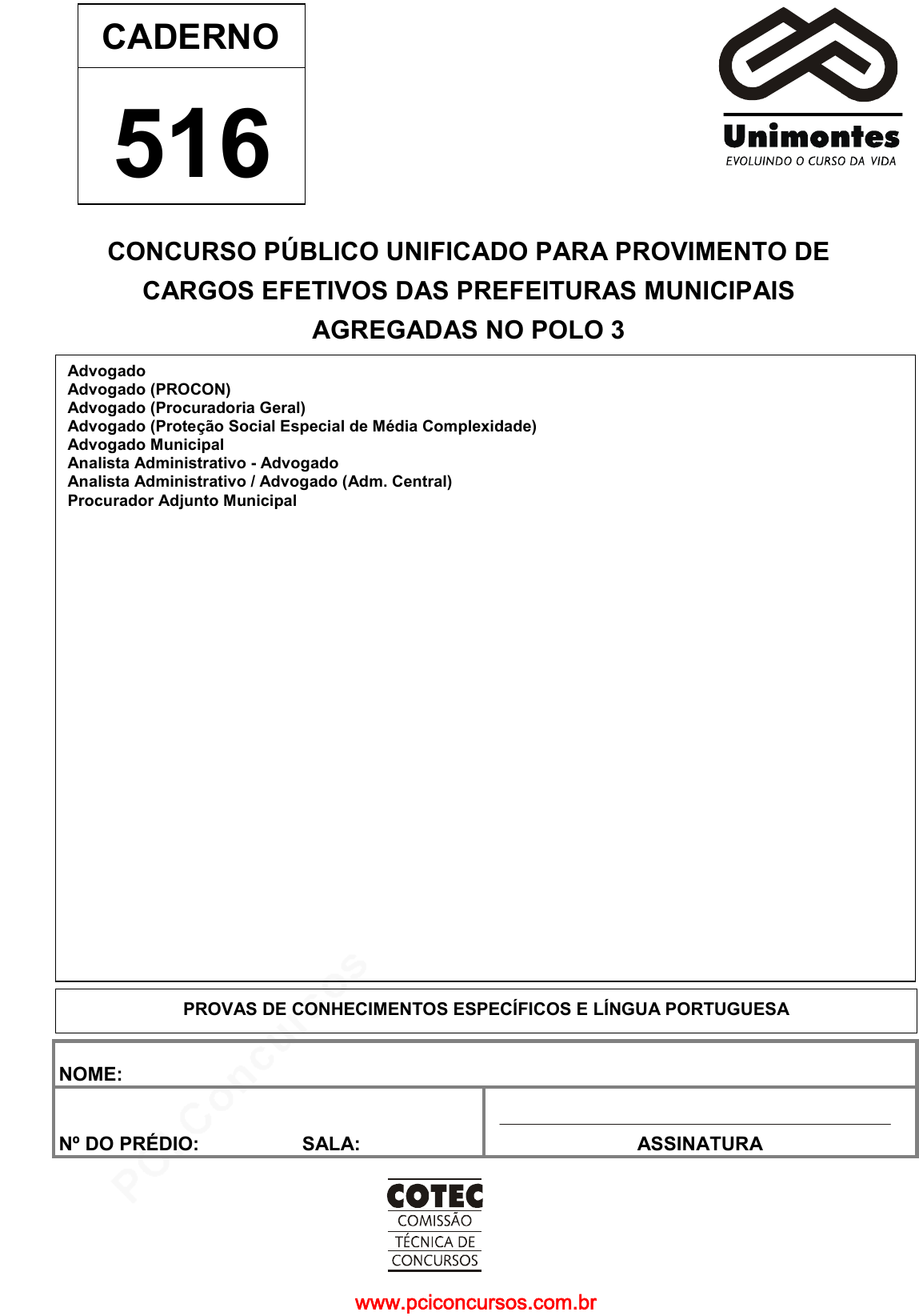 pcimarkpci MDAwMDowMDAwOjAwMDA6MDAwMDowMDAwOmZmZmY6MzZlOTpjMjU5:VGh1LCAxNiBTZXAgMjAyMSAyMTowMzowNCAtMDMwMA== CONCURSO PÚBLICO UNIFICADO PARA PROVIMENTO DE CARGOS EFETIVOS DAS PREFEITURAS MUNICIPAIS AGREGADAS NO POLO 3 NOME: Nº DO PRÉDIO: SALA: ASSINATURA CADERNO 516 Advogado Advogado (PROCON) Advogado (Procuradoria Geral) Advogado (Proteção Social Especial de Média Complexidade) Advogado Municipal Analista Administrativo - Advogado Analista Administrativo / Advogado (Adm. Central) Procurador Adjunto Municipal PROVAS DE CONHECIMENTOS ESPECÍFICOS E LÍNGUA PORTUGUESA www.pciconcursos.com.br pcimarkpci MDAwMDowMDAwOjAwMDA6MDAwMDowMDAwOmZmZmY6MzZlOTpjMjU5:VGh1LCAxNiBTZXAgMjAyMSAyMTowMzowNSAtMDMwMA== 2 ORIENTAÇÕES IMPORTANTES 01 - Este caderno contém questões do tipo múltipla escolha. 02 - Verifique se o caderno contém falhas: folhas em branco, má impressão, páginas trocadas, numeração errada, etc. Encontrando falhas, levante a mão. O Fiscal o atenderá e trocará o seu caderno. 03 - Cada questão tem 4 (quatro) alternativas (A - B - C - D). Apenas 1 (uma) resposta é correta. Não marque mais de uma resposta para a mesma questão, nem deixe nenhuma delas sem resposta. Se isso acontecer, a questão será anulada. 04 - Para marcar as respostas, use preferencialmente caneta esferográfica com tinta azul ou preta. NÃO utilize caneta com tinta vermelha. Assinale a resposta certa, preenchendo toda a área da bolinha . 05 - Tenha cuidado na marcação da Folha de Respostas, pois ela não será substituída em hipótese alguma. 06 - Confira e assine a Folha de Respostas, antes de entregá-la ao Fiscal. NA FALTA DA ASSINATURA, A SUA PROVA SERÁ ANULADA. 07 - Não se esqueça de assinar a Lista de Presenças. 08 Após UMA HORA, a partir do início das provas, você poderá retirar-se da sala, SEM levar este caderno. 09 - Após DUAS HORAS, a partir do início das provas, você poderá retirar-se da sala, levando este caderno. DURAÇÃO DESTAS PROVAS: TRÊS HORAS OBS.: Candidatos com cabelos longos deverão deixar as orelhas totalmente descobertas durante a realização das provas. É proibido o uso de boné. www.pciconcursos.com.br pcimarkpci MDAwMDowMDAwOjAwMDA6MDAwMDowMDAwOmZmZmY6MzZlOTpjMjU5:VGh1LCAxNiBTZXAgMjAyMSAyMTowMzowNSAtMDMwMA== 3 PROVA DE CONHECIMENTOS ESPECÍFICOS Questões numeradas de 01 a 15 QUESTÃO 01 Artigo 5º, § 3º - Os tratados e convenções internacionais sobre direitos humanos que forem aprovados, em cada Casa do Congresso Nacional, em dois turnos, por três quintos dos votos dos respectivos membros, serão equivalentes às emendas constitucionais (BRASIL, 1988). A partir do enunciado, pode-se afirmar: A) Desde a adesão do Brasil, sem qualquer reserva, ao Pacto de San José da Costa Rica, ambos no ano de 1992, não há mais base legal para prisão civil do depositário infiel, pois o caráter especial desses diplomas internacionais sobre direitos humanos lhes reserva lugar específico no ordenamento jurídico, estando equiparados à Lei Complementar. B) A subscrição pelo Brasil do Pacto de São José da Costa Rica, limitando a prisão civil por dívida ao descumprimento inescusável de prestação alimentícia, implicou a derrogação das normas estritamente legais referentes à prisão do depositário infiel, reafirmado o status constitucional do referido Pacto. C) O status normativo supralegal dos tratados internacionais de direitos humanos subscritos pelo Brasil torna inaplicável a legislação infraconstitucional com ele conflitante, seja ela anterior seja posterior ao ato de adesão. Assim ocorreu com o art. 1.287, do CC, de 1916, e com o DL 911/1969, bem como em relação ao art. 652 do Novo CC (Lei 10.406/2002). D) No Brasil, duas são a convenções internacionais que ingressaram no ordenamento jurídico nos termos do artigo 5º, § 3º da CRFB/88, a Convenção Internacional sobre os Direitos das Pessoas com Deficiência e a Convenção Internacional sobre a Eliminação de todas as Formas de Discriminação Racial. QUESTÃO 02 Após a alteração promovida pela EC 15/1996, a Constituição explicitou o alcance do âmbito de consulta para o caso de reformulação territorial de Municípios e, portanto, o significado da expressão “populações diretamente interessadas”, contida na redação originária do § 4º do artigo 18 da Constituição, no sentido de ser necessária a consulta a toda a população afetada pela modificação territorial, o que, no caso de desmembramento, deve envolver tanto a população do território a ser desmembrado quanto a do território remanescente. Sobre o tema tratado no enunciado, é CORRETO o que se afirma: A) A criação e a incorporação de Municípios, além de outras exigências, far-se-á por lei estadual, dentro do período determinado por Lei Complementar Federal, e dependerão de consulta prévia, expressa através do voto, às populações dos Municípios envolvidos. B) Pesquisas de opinião, abaixo-assinados e declarações de organizações comunitárias, favoráveis à criação, à incorporação ou ao desmembramento de Município, atende ao disposto no § 4º, do artigo 18 da Constituição da República. C) Seja qual for a modalidade de desmembramento proposta, a validade da lei que o efetive estará subordinada, por força da Constituição, ao referendo, vale dizer, à consulta às populações dos Municípios envolvidos, conforme a dicção do artigo 18, § 4º da Constituição da República. D) A alteração dos limites territoriais de Municípios prescinde da consulta prévia às populações diretamente interessadas, de Lei Estadual e deve ocorrer dentro do período estabelecido por Lei Complementar, conforme previsão do artigo 18, § 4º da Constituição da República. www.pciconcursos.com.br pcimarkpci MDAwMDowMDAwOjAwMDA6MDAwMDowMDAwOmZmZmY6MzZlOTpjMjU5:VGh1LCAxNiBTZXAgMjAyMSAyMTowMzowNSAtMDMwMA== 4 QUESTÃO 03 Os artigos 22 e 24 da Constituição da República especificam o cam