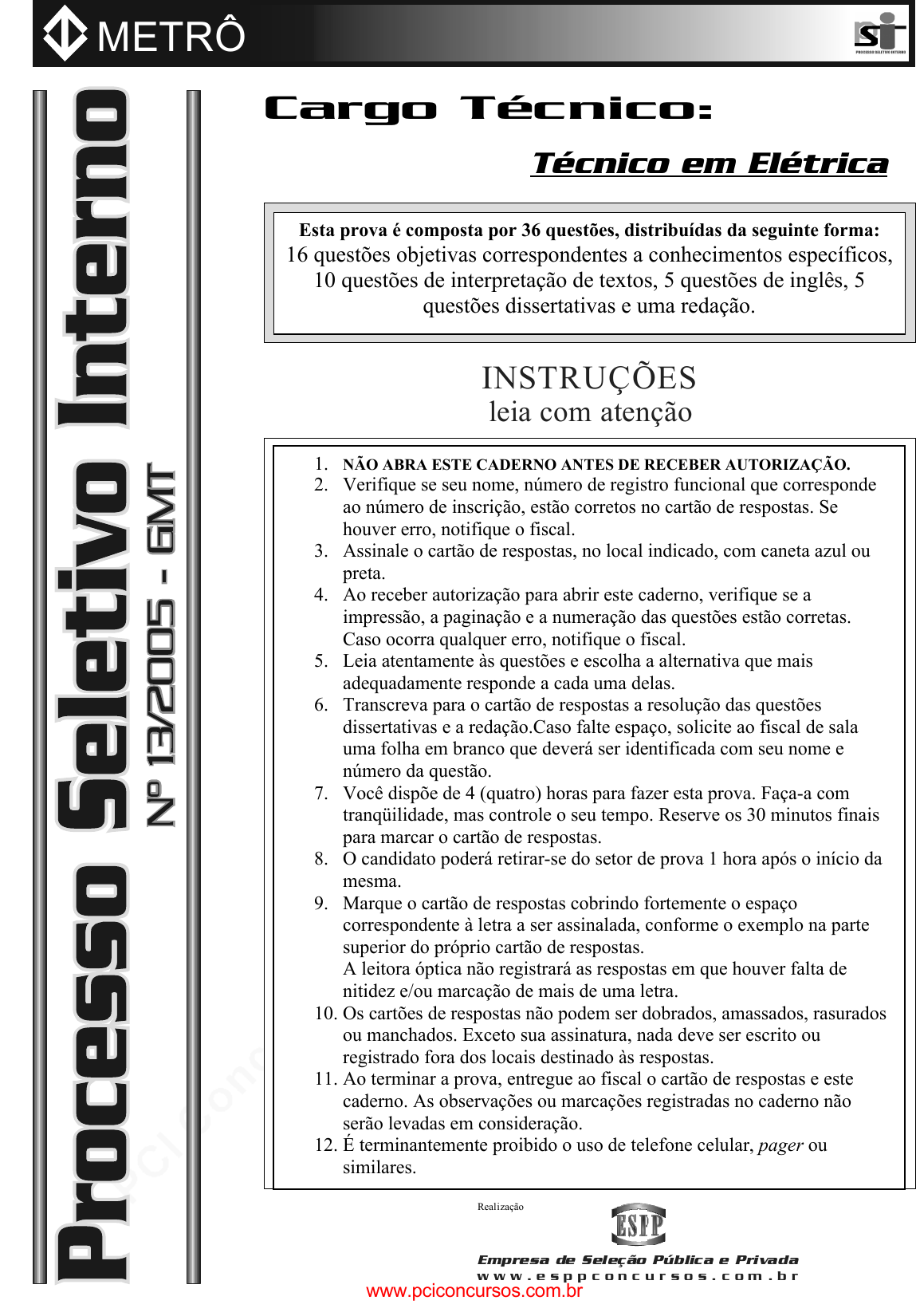 pcimarkpci MDAwMDowMDAwOjAwMDA6MDAwMDowMDAwOmZmZmY6MzZlOTpjMjU5:U2F0LCAxMSBTZXAgMjAyMSAxMDoxNjo1OCAtMDMwMA== Cargo Técnico: Empresa de Seleção Pública e Privada w w w . e s p p c o n c u r s o s . c o m . b r Realização INSTRUÇÕES leia com atenção METRÔ 1. NÃO ABRA ESTE CADERNO ANTES DE RECEBER AUTORIZAÇÃO. 2. Verifique se seu nome, número de registro funcional que corresponde ao número de inscrição, estão corretos no cartão de respostas. Se houver erro, notifique o fiscal. 3. Assinale o cartão de respostas, no local indicado, com caneta azul ou preta. 4. Ao receber autorização para abrir este caderno, verifique se a impressão, a paginação e a numeração das questões estão corretas. Caso ocorra qualquer erro, notifique o fiscal. 5. Leia atentamente às questões e escolha a alternativa que mais adequadamente responde a cada uma delas. 6. Transcreva para o cartão de respostas a resolução das questões dissertativas e a redação.Caso falte espaço, solicite ao fiscal de sala uma folha em branco que deverá ser identificada com seu nome e número da questão. 7. Você dispõe de 4 (quatro) horas para fazer esta prova. Faça-a com tranqüilidade, mas controle o seu tempo. Reserve os 30 minutos finais para marcar o cartão de respostas. 8. O candidato poderá retirar-se do setor de prova 1 hora após o início da mesma. 9. Marque o cartão de respostas cobrindo fortemente o espaço correspondente à letra a ser assinalada, conforme o exemplo na parte superior do próprio cartão de respostas. A leitora óptica não registrará as respostas em que houver falta de nitidez e/ou marcação de mais de uma letra. 10. Os cartões de respostas não podem ser dobrados, amassados, rasurados ou manchados. Exceto sua assinatura, nada deve ser escrito ou registrado fora dos locais destinado às respostas. 11. Ao terminar a prova, entregue ao fiscal o cartão de respostas e este caderno. As observações ou marcações registradas no caderno não serão levadas em consideração. 12. É terminantemente proibido o uso de telefone celular, pager ou similares. Técnico em Elétrica Esta prova é composta por 36 questões, distribuídas da seguinte forma: 16 questões objetivas correspondentes a conhecimentos específicos, 10 questões de interpretação de textos, 5 questões de inglês, 5 questões dissertativas e uma redação. www.pciconcursos.com.br pcimarkpci MDAwMDowMDAwOjAwMDA6MDAwMDowMDAwOmZmZmY6MzZlOTpjMjU5:U2F0LCAxMSBTZXAgMjAyMSAxMDoxNjo1OCAtMDMwMA== QUESTÕES OBJETIVAS CONHECIMENTOS ESPECÍFICOS 1. Assinale o fator por que deve ser multiplicada a potência instalada para se obter a potência que será realmente utilizada. a) Fator de diversidade b) Fator de demanda c) Fator de carga d) Fator de potência e) Fator de consumo 2. Qual é a intensidade da corrente elétrica que passa por uma resistência de 1KΩ submetida a uma tensão de 12V? a) 12mA b) 15mA c) 10mA d) 8mA e) 20mA 3. “Chave estrela triângulo e chave compensadora” são dispositivos utilizados para: a) Facilitar a seletividade da instalação no que diz respeito à sinalização b) Corrigir o fator de carga nas instalações c) Dar partidas em motores de indução em gaiola com potências acima de 5 HP d) Viabilizar a partida em carga dos motores de indução em gaiola e) Nenhuma das alternativas anteriores 4. De acordo com a “Segunda Lei de Ohm”, deseja-se montar um resistor de precisão de 2,43Ω com um fio de níquel-cromo de 1mm de diâmetro. Qual deve ser o comprimento desse fio? a) 1,862m b)1,567m c)2,5m d) 2m e)1,735m 5. No circuito abaixo conhecemos os valores de E1, E2, V3 e V4 . Determine V1 e V2 por meio da lei de “Kirchhoff” para Tensões. a) V1 = 2V; V2 = 3V b) V1 = 4V; V2 = 5V c) V1 = 3V; V2 = 6V d) V1 = 3V; V2 = 7V e) V1 = 2V; V2 = 4V 6. Considerando o circuito abaixo, formado por três capacitores ligados em série, a tensão de cada capacitor será de: a) V1 = 5,42V; V2 = 3,61V; V3 = 0,97V b) V1= 5,37V; V2 = 3,72V; V3 = 0,99V c) V1 = 4,59V; V2 = 3,47V; V3 = 0,87V d) V1 = 3,97V; V2 = 2,59V; V3 = 0,77V e) V1 = 5,52V; V2 = 4,91V; V3 = 0,91V 7. Determine a indutância equivalente do circuito abaixo, estando L3 e L4 próximos entre si, com K=0,5 e assinale a alternativa correta: a) 50µH b) 51µH c) 5,2µH d) 52µH e) 5,1µH 8. Dois capacitores, o primeiro trifásico e o segundo monofásico, têm uma potência nominal de 10kVA e tensão nominal de 220V. Suas reatâncias, em ohms, são, respectivamente: a) 2,80 e 2,80 b) 2,80 e 4,84 c) 4,84 e 4,84 d) 8,37 e 4,84 e) 6,35 e 3,58 9. Numa instalação trifásica, o condutor neutro deve ser usado quando a carga for: a) composta de cargas monofásicas b) composta de um banco de capacitores c) categorizada como equilibrada resistiva d) constituída de um motor de indução com chave Y∆ e) nenhuma das alternativas anteriores 10. Um motor de indução trifásico de 4 pólos tem potência nominal de 35kW e velocidade de 1750rpm. Seu torque nominal, em Newton metros, equivale a: a) 020 b) 072 c) 149 d) 191 e) 081 11. Observe os seguintes parâmetros de um transformador: 1- resistência dos enrolamentos 2- reatância de dispersão 3- resistência de magnetização 4- reatância de magnetização Aqueles que limitam a corrente de curto-circuito são os expressos pelos números: a) 1 e 2 b) 1 e 3 c) 3 e 4 d) 1 e 4 e) 2 e 3 12. nos motores de indução, o torque máximo varia em relação à freqüência da forma: a) Diretamente proporcional b) Inversamente proporcional c) Diretamente proporcional ao seu quadrado d) Inversamente proporcional ao seu quadrado e) Não varia www.pciconcursos.com.br pcimarkpci MDAwMDowMDAwOjAwMDA6MDAwMDowMDAwOmZmZmY6MzZlOTpjMjU5:U2F0LCAxMSBTZXAgMjAyMSAxMDoxNjo1OCAtMDMwMA== 13. Dentre as lâmpadas listadas abaixo, as que apresentam maior eficiência luminosa (lúmens/W) são as: a) Incandescentes b) Mistas c) Fluorescentes d) De sódio de alta pressão e) De vapor de mercúrio 14. No Sistema Internacional, qual é a