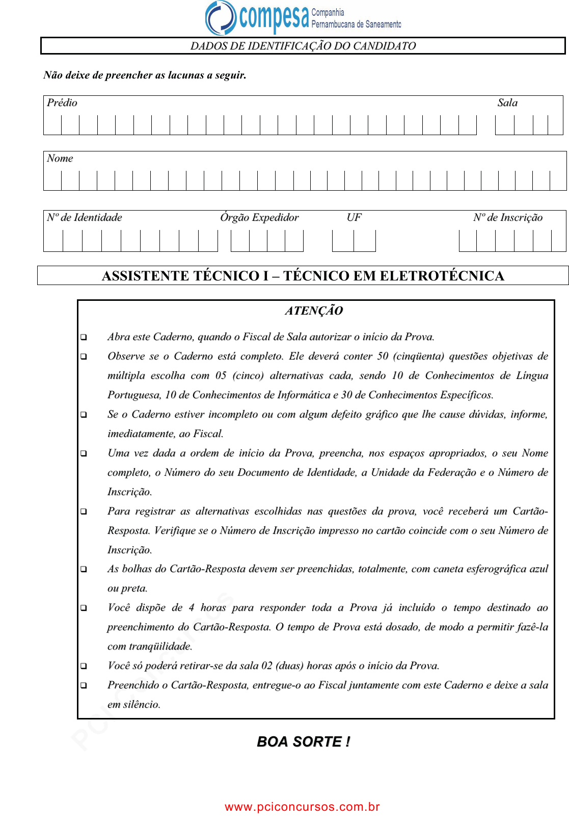 pcimarkpci MDAwMDowMDAwOjAwMDA6MDAwMDowMDAwOmZmZmY6MzZlOTpjMjU5:U2F0LCAxMSBTZXAgMjAyMSAxMDo0NzoxMyAtMDMwMA== DDAADDOOSS DDEE IIDDEENNTTIIFFIICCAAÇÇÃÃOO DDOO CCAANNDDIIDDAATTOO Não deixe de preencher as lacunas a seguir. PPrrééddiioo SSaallaa NNoommee NNºº ddee IIddeennttiiddaaddee ÓÓrrggããoo EExxppeeddiiddoorr UUFF NNºº ddee IInnssccrriiççããoo ASSISTENTE TÉCNICO I – TÉCNICO EM ELETROTÉCNICA AATTEENNÇÇÃÃOO �� AAbbrraa eessttee CCaaddeerrnnoo,, qquuaannddoo oo FFiissccaall ddee SSaallaa aauuttoorriizzaarr oo iinníícciioo ddaa PPrroovvaa.. �� OObbsseerrvvee ssee oo CCaaddeerrnnoo eessttáá ccoommpplleettoo.. EEllee ddeevveerráá ccoonntteerr 5500 ((cciinnqqüüeennttaa)) qquueessttõõeess oobbjjeettiivvaass ddee mmúúllttiippllaa eessccoollhhaa ccoomm 0055 ((cciinnccoo)) aalltteerrnnaattiivvaass ccaaddaa,, sseennddoo 1100 ddee CCoonnhheecciimmeennttooss ddee LLíínngguuaa PPoorrttuugguueessaa,, 1100 ddee CCoonnhheecciimmeennttooss ddee IInnffoorrmmááttiiccaa ee 3300 ddee CCoonnhheecciimmeennttooss EEssppeeccííffiiccooss.. �� SSee oo CCaaddeerrnnoo eessttiivveerr iinnccoommpplleettoo oouu ccoomm aallgguumm ddeeffeeiittoo ggrrááffiiccoo qquuee llhhee ccaauussee ddúúvviiddaass,, iinnffoorrmmee,, iimmeeddiiaattaammeennttee,, aaoo FFiissccaall.. �� UUmmaa vveezz ddaaddaa aa oorrddeemm ddee iinníícciioo ddaa PPrroovvaa,, pprreeeenncchhaa,, nnooss eessppaaççooss aapprroopprriiaaddooss,, oo sseeuu NNoommee ccoommpplleettoo,, oo NNúúmmeerroo ddoo sseeuu DDooccuummeennttoo ddee IIddeennttiiddaaddee,, aa UUnniiddaaddee ddaa FFeeddeerraaççããoo ee oo NNúúmmeerroo ddee IInnssccrriiççããoo.. �� PPaarraa rreeggiissttrraarr aass aalltteerrnnaattiivvaass eessccoollhhiiddaass nnaass qquueessttõõeess ddaa pprroovvaa,, vvooccêê rreecceebbeerráá uumm CCaarrttããoo-- RReessppoossttaa.. VVeerriiffiiqquuee ssee oo NNúúmmeerroo ddee IInnssccrriiççããoo iimmpprreessssoo nnoo ccaarrttããoo ccooiinncciiddee ccoomm oo sseeuu NNúúmmeerroo ddee IInnssccrriiççããoo.. �� AAss bboollhhaass ddoo CCaarrttããoo--RReessppoossttaa ddeevveemm sseerr pprreeeenncchhiiddaass,, ttoottaallmmeennttee,, ccoomm ccaanneettaa eessffeerrooggrrááffiiccaa aazzuull oouu pprreettaa.. �� VVooccêê ddiissppõõee ddee 44 hhoorraass ppaarraa rreessppoonnddeerr ttooddaa aa PPrroovvaa jjáá iinncclluuííddoo oo tteemmppoo ddeessttiinnaaddoo aaoo pprreeeenncchhiimmeennttoo ddoo CCaarrttããoo--RReessppoossttaa.. OO tteemmppoo ddee PPrroovvaa eessttáá ddoossaaddoo,, ddee mmooddoo aa ppeerrmmiittiirr ffaazzêê--llaa ccoomm ttrraannqqüüiilliiddaaddee.. �� VVooccêê ssóó ppooddeerráá rreettiirraarr--ssee ddaa ssaallaa 0022 ((dduuaass)) hhoorraass aappóóss oo iinníícciioo ddaa PPrroovvaa.. �� PPrreeeenncchhiiddoo oo CCaarrttããoo--RReessppoossttaa,, eennttrreegguuee--oo aaoo FFiissccaall jjuunnttaammeennttee ccoomm eessttee CCaaddeerrnnoo ee ddeeiixxee aa ssaallaa eemm ssiillêênncciioo.. BBOOAA SSOORRTTEE !! www.pciconcursos.com.br pcimarkpci MDAwMDowMDAwOjAwMDA6MDAwMDowMDAwOmZmZmY6MzZlOTpjMjU5:U2F0LCAxMSBTZXAgMjAyMSAxMDo0NzoxMyAtMDMwMA== CONCURSO PÚBLICO 2 CONHECIMENTOS DDEE LLÍÍNNGGUUAA PPOORRTTUUGGUUEESSAA Texto 1 para as questões de 01 a 10. Água - Desafio do século 21 As mais bonitas imagens da Terra, aquelas que são agradáveis aos olhos, à imaginação, as que são um convite ao relaxamento, sempre têm a água em sua composição: as ondas do mar, as cachoeiras, um riacho cristalino, a neve sobre as montanhas, os lagos espelhados, a chuva caindo sobre as plantas, o orvalho... A ciência tem demonstrado que a vida se originou na água e que ela constitui a matéria predominante nos organismos vivos. É impossível imaginar um tipo de vida em sociedade que dispense o uso da água: água para beber e cozinhar; para a higiene pessoal e do lugar onde vivemos; para uso industrial; para irrigação das plantações; para geração de energia e para navegação. A água é um elemento essencial à vida. Mas, a água potável não estará disponível infinitamente. Ela é um recurso limitado. Parece inacreditável, já que existe tanta água no planeta! A água ocupa 70% da superfície da Terra. A maior parte, 97%, é salgada. Apenas 3% do total é água doce e, desses, 0,01% vai para os rios, ficando disponível para uso. O restante está em geleiras, icebergs e em subsolos muito profundos. Ou seja, o que pode ser potencialmente consumido é uma pequena fração. Há muita coisa, a saber, a respeito da água. Ela está presente nos menores movimentos do nosso corpo, como no piscar de olhos. Afinal, somos compostos basicamente de água. A água tem-se tornado um elemento de disputa entre nações. Um relatório do Banco Mundial, datado de 1995, alerta para o fato de que "as guerras do próximo século serão por causa de água, não por causa do petróleo ou política”. Hoje, cerca de 250 milhões de pessoas, distribuídos em 26 países, já enfrentam escassez crônica de água. Em 30 anos, o número de pessoas saltará para 3 bilhões em 52 países. Nesse período, a quantidade de água disponível por pessoa em países do Oriente Médio e do norte da África estará reduzida em 80 por cento. A projeção que se faz é que, nesse período, 8 bilhões de pessoas habitarão a terra, em sua maioria, concentradas nas grandes cidades. Daí, será necessário produzir mais comida e mais energia, aumentando o consumo doméstico e industrial de água. Essas perspectivas fazem crescer o risco de guerras, porque a questão das águas torna-se internacional. Um levantamento da ONU aponta duas sugestões básicas para diminuir a escassez de água: aumentar a sua disponibilidade e utilizá-la mais eficazmente. Para aumentar a disponibilidade, uma das alternativas seria o aproveitamento das geleiras, a outra, a dessalinização da água do mar. Esses processos são muito caros e tornam-se inviáveis para a maioria dos países q