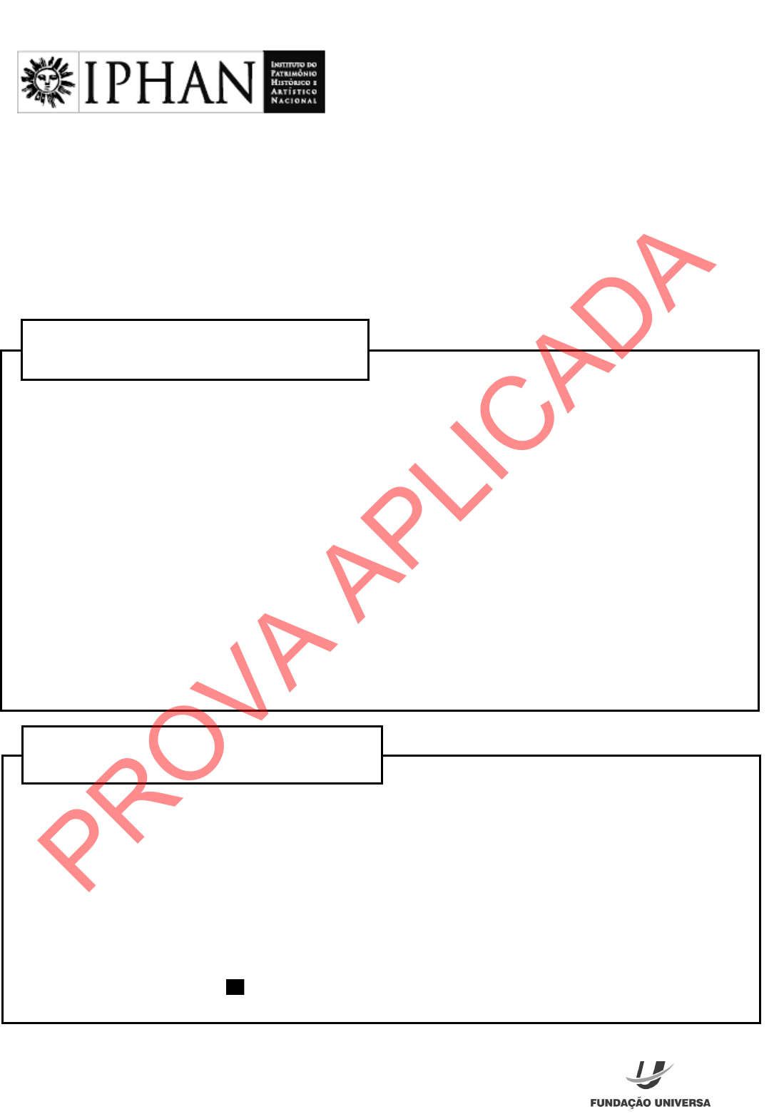 MINISTÉRIO DA CULTURA INSTITUTO DO PATRIMÔNIO HISTÓRICO E ARTÍSTICO NACIONAL – IPHAN CONCURSO PÚBLICO – NÍVEL SUPERIOR � Verifique se os seus dados estão corretos no Cartão de Respostas óptico. Caso haja algum dado incorreto, escreva apenas no(s) campo(s) a ser(em) corrigido(s), conforme instruções no Cartão de Respostas . � Leia atentamente cada questão e assinale no Cartão de Respostas óptico a alternativa que mais adequadamente a responde. � A questão que tiver mais de uma resposta assinalada será considerada errada, mesmo que uma das assinalações esteja correta. � O Cartão de Respostas óptico NÃO pode ser dobrado, amassado, rasurado, manchado ou conter qualquer registro fora dos locais destinados às respostas. � A maneira correta de assinalar a alternativa no Cartão de Respostas óptico é cobrindo, fortemente, com caneta esferográfica de tinta preta ou azul, fabricada com material transparente, o espaço a ela correspondente, conforme modelo a seguir: Marque as respostas assim : INSTRUÇÕES – PROVA OBJETIVA INSTRUÇÕES GERAIS Realização: DATA E HORÁRIO DA PROVA: 13/12/2009 – 9h 104 – ARQUITETURA E URBANISMO � O candidato receberá do Chefe d e Sala: - Um Caderno de Questões das Provas Objetiva e Discursiva, contendo 50 (cinquenta) questões de múltipla escolha, com 5 (cinco) alternativas de resposta cada uma e apenas uma alternativa correta, e 2 (duas) questões discursivas com as respectivas orientações. - Um Cartão de Respostas óptico personalizado. - Duas Folhas de Respostas para as Questões Discursivas. � Ao ser autorizado o início da prova, o candidato deverá verificar se a numeração das questões, a paginação e a codificação do Cartão e das Folhas estão corretas. � O candidato dispõe de 4 (quatro) horas e 30 (trinta) minutos para fazer a Prova Objetiva e as Questões Discursivas, devendo controlar o tempo, pois não haverá prorrogação desse prazo.. � Esse tempo inclui a marcação do Cartão de Respostas óptico da Prova Objetiva. � Ao candidato somente será permitido levar o Caderno de Questões após 4 (quatro) horas do início da prova. � Somente após decorrida 1 (uma) hora do início da prova, o candidato poderá entregar seu Cartão de Respostas óptico e as Folhas de Respostas das Questões Discursivas e retirar-se da sala. � Após o término da prova, o candidato deve entregar ao Chefe de Sala o Cartão de Respostas óptico devidamente assinado e as Folhas de Respostas das Questões Discursivas. � Se o candidato precisar de algum esclarecimento, deverá solicitar ao Chefe de Sala . � O candidato deve deixar sobre a carteira apenas o documento de identidade e a caneta esferográfica de tinta preta ou azul , fabricada com material transparente. � Não é permitida a utilização de qualquer aparelho eletrônico de comunicação. O candidato deverá desligar e entregar ao Chefe de Sala régua de cálculo, calculadora, agenda eletrônica, palmtop, bip, receptor, pager, notebook, telefone celular, gravador, máquina fotográfica, walkman, aparelho portátil de armazenamento e de reprodução de músicas, vídeos e outros arquivos digitais, relógio, ou qualquer outro equipamento desse tipo e qualquer tipo de arma, mesmo que com porte autorizado. � Não é permitida a consulta a livros, dicionários, apontamentos e apostilas. MINISTÉRIO DA CULTURA INSTITUTO DO PATRIMÔNIO HISTÓRICO E ARTÍSTICO NACIONAL – IPHAN CONCURSO PÚBLICO – NÍVEL SUPERIOR PR OV A AP LIC AD A PR OV A AP LIC AD A FUNDAÇÃO UNIVERSA CONCURSO PÚBLICO – IPHAN – ARQUITETURA E URBANISMO (CÓDIGO 104) Página 3 de 16 CONHECIMENTOS BÁSICOS Texto I, para responder às questões 1 e 2. Cidadezinha qualquer Casas entre bananeiras mulheres entre laranjeiras pomar amor cantar. Um homem vai devagar. Um cachorro vai devagar. Um burro vai devagar. Devagar... as janelas olham. Eta vida besta, meu Deus. Carlos Drummond de Andrade. Reunião , 10.ª ed. Rio de Janeiro: José Olympio, 1980, p. 17. QUESTÃO 1 _____________________________________ Com base no texto I, assinale a alternativa incorreta . (A) Para o autor, em uma visão integral, porém dinâmica da cidade, a ausência de artigos na primeira estrofe do texto reflete a similaridade conceitual estabelecida entre os substantivos. (B) A fusão dos elementos humanos à paisagem natural, em uma visão panorâmica, ratifica a ausência de artigos na primeira estrofe. (C) Ao longo do texto, quase não há inserção de adjetivos, dado o fato de a dinamicidade do texto não promover espaço para o detalhamento. (D) O emprego da pontuação ao longo do texto sugere ausência de conhecimento sintático, promovendo lentidão e morosidade na leitura. (E) É empregada a sinonímia de estruturação sintática e lexical na segunda estrofe. QUESTÃO 2 _____________________________________ Com base no texto I, assinale a alternativa incorreta . (A) Se, ao penúltimo verso, for dada a seguinte redação: Devagar... às janelas olham ter-se-á modificação semântica da estrutura textual. (B) A variação da abordagem semântica na estrutura sintática do texto tornou-o incoeso e inacessível ao leitor. (C) Nenhum atributo é legado aos substantivos da segunda estrofe, porém, apesar desta característica, é perceptível a introdução de movimentação espacial. (D) No texto, é possível verificar a ocorrência de artigo indefinido. (E) No trecho “Devagar... as janelas olham.”, foi empregada a personificação, processo que humaniza objetos. Texto II, para responder às questões 3 e 4. Com o ouvido no passado 1 4 “As palavras voam, os escritos permanecem”, diz- se no Ocidente. O senhor pode explicar como a tradição oral tem legitimidade para exprimir a história das cultu ras africanas? Essa citação, procedente dos romanos, contribuiu para forjar 7 10 13 16 19 22 25 28 31 34 37 40 43 46 a opinião segundo a qual uma fonte oral não merece crédito. Ora, os 