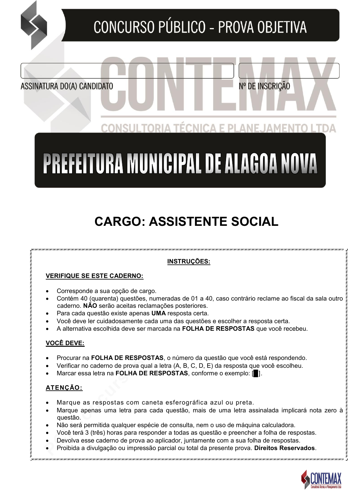 pcimarkpci MDAwMDowMDAwOjAwMDA6MDAwMDowMDAwOmZmZmY6MzZlOTpjMjU5:U2F0LCAxOCBTZXAgMjAyMSAwMTozNjo1MCAtMDMwMA== CARGO: ASSISTENTE SOCIAL INSTRUÇÕES: VERIFIQUE SE ESTE CADERNO: Corresponde a sua opção de cargo. Contém 40 (quarenta) questões, numeradas de 01 a 40, caso contrário reclame ao fiscal da sala outro caderno. NÃO serão aceitas reclamações posteriores. Para cada questão existe apenas UMA resposta certa. Você deve ler cuidadosamente cada uma das questões e escolher a resposta certa. A alternativa escolhida deve ser marcada na FOLHA DE RESPOSTAS que você recebeu. VOCÊ DEVE: Procurar na FOLHA DE RESPOSTAS, o número da questão que você está respondendo. Verificar no caderno de prova qual a letra (A, B, C, D, E) da resposta que você escolheu. Marcar essa letra na FOLHA DE RESPOSTAS, conforme o exemplo: [█]. ATENÇÃO: Marque as respostas com caneta esferográfica azul ou preta. Marque apenas uma letra para cada questão, mais de uma letra assinalada implicará nota zero à questão. Não será permitida qualquer espécie de consulta, nem o uso de máquina calculadora. Você terá 3 (três) horas para responder a todas as questão e preencher a folha de respostas. Devolva esse caderno de prova ao aplicador, juntamente com a sua folha de respostas. Proibida a divulgação ou impressão parcial ou total da presente prova. Direitos Reservados. pcimarkpci MDAwMDowMDAwOjAwMDA6MDAwMDowMDAwOmZmZmY6MzZlOTpjMjU5:U2F0LCAxOCBTZXAgMjAyMSAwMTozNjo1MCAtMDMwMA== PREFEITURA MUNICIPAL DE ALAGOA NOVA-ESTADO DA PARAÍBA P á g in a 2 RASCUNHO pcimarkpci MDAwMDowMDAwOjAwMDA6MDAwMDowMDAwOmZmZmY6MzZlOTpjMjU5:U2F0LCAxOCBTZXAgMjAyMSAwMTozNjo1MCAtMDMwMA== PREFEITURA MUNICIPAL DE ALAGOA NOVA-ESTADO DA PARAÍBA P á g in a 3 QUESTÕES - LÍNGUA PORTUGUESA (1 – 12) 02 PONTOS TEXTO I A pandemia entre dois presidentes: o eleito e o pato manco Resistência de Trump a aceitar vitória de Biden aumenta temor de que combate à doença que se agrava nos EUA caia no limbo Por Sandra Cohen Enquanto Joe Biden era declarado presidente eleito, os EUA registravam no sábado 126.742 novos infectados por Covid-19, o maior número de casos num só dia e o agravamento da doença em 42 dos 50 estados. Com o presidente Donald Trump no fim do mandato transformado em “pato manco” e ainda sem reconhecer a derrota, cresceu o temor de que o combate à doença caia definitivamente no limbo. A vitória democrata está associada também ao comportamento negligente do presidente para coibir a pandemia, que causou mais de 270 mil mortes no país. Biden já disse a que veio. No discurso em que aceitou ser o 46º presidente dos EUA, deixou claro que o tema será prioritário na transição. Ele vai nomear nesta segunda-feira uma força-tarefa de 12 pessoas contra novo coronavírus. E consultar o epidemiologista Anthony Fauci, maior especialista dos EUA em doenças infecciosas, que Trump ameaçou demitir após quase quatro décadas de trabalho na Casa Branca. Note-se que a atual força-tarefa, comandada pelo vice-presidente Mike Pence, não se reúne há mais de um mês. Ainda não está claro, porém, como será o “mandato de ação” anunciado por Biden, enquanto o presidente se mantém aferrado ao cargo e ameaça sabotar a transição. Sem influência, já que seu sucessor está eleito, Trump se transforma automaticamente em “pato manco”, no período entre a eleição e a posse de Biden. Por lei, o acesso a documentos, relatórios e agências federais devem ser facilitados pelo governo ao presidente eleito enquanto não toma posse. A equipe de Biden acelerou os planos para a transição, que vêm sendo traçados desde o início do semestre, e estão descritos no site "BuildBackBetter.com". As outras questões prioritárias para o Dia 1 da próxima Presidência são recuperação econômica, igualdade racial e mudança climática. No que diz respeito ao novo coronavírus, a proposta de Biden prevê o trabalho junto a governadores e prefeitos de forma a tornar obrigatório o uso de máscaras faciais. E também o aumento de testes de diagnóstico - “confiáveis e gratuitos” - enquanto uma vacina não estiver disponível. A distribuição de imunizantes contra o novo coronavírus - prometida por Trump para antes das eleições - certamente será atribuição do novo governo. Biden prometeu reatar, no mesmo dia em que assumir o cargo, as relações do país com a Organização Mundial de Saúde, rotulada pelo atual presidente como marionete da China. O agravamento da doença levanta ainda dúvidas sobre os rituais da cerimônia de posse, no dia 20 de janeiro: se Biden fará o juramento de máscara, se o número de convidados será limitado e se os animados bailes, por onde o novo presidente e a primeira-dama peregrinam durante a noite, resistirão às restrições impostas pela pandemia. Assim como a campanha, a eleição e a transição de poder, a posse de Biden também caminha para o insólito. Sinal dos tempos. https://g1.globo.com/mundo/blog/sandra- cohen/post/2020/11/09/a-pandemia-entre-dois-presidentes- o-eleito-e-o-pato-manco.ghtml 01. Pode-se afirmar que o foco do texto I está direcionado: a) à transição conturbada de poder do governo Trump para o eleito presidente Joe Biden. b) ao temor de que o combate ao coronavírus fique prejudicado, haja vista os obstáculos impostos por Trump à transição de poder. c) à dificuldade da campanha e da eleição de Joe Biden, além das dúvidas de como será sua posse. d) à atribuição da distribuição de imunizantes para combater o coronavírus: se será a Trump ou a Joe Biden. e) à necessidade de o novo governo representado por Joe Biden reatar um relacionamento saudável com a Organização Mundial da Saúde. 02. O texto I, em relação à sua tipologia, pode ser classificado, precipuamente, como: a) narrativo; b) injuntivo; c) descritivo; d) dramático; e) argumentativo. 03. No último parágrafo, o vocábulo “insólito” apresenta relação semân