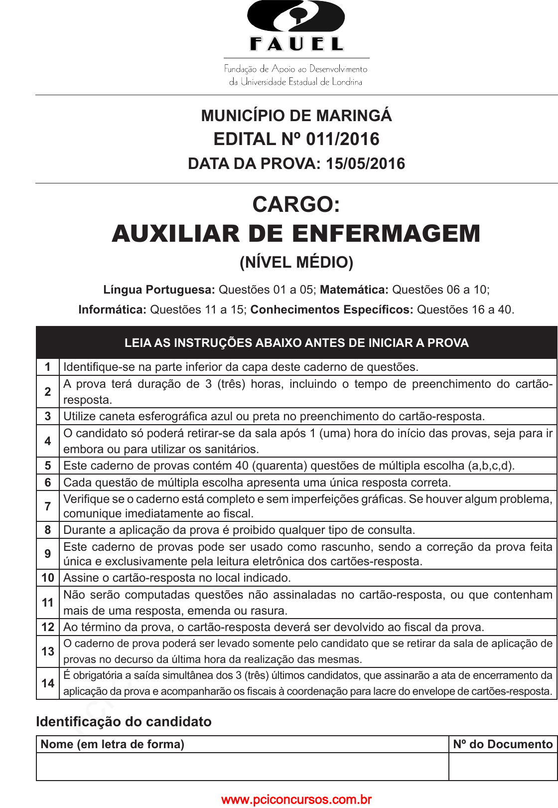 pcimarkpci MDAwMDowMDAwOjAwMDA6MDAwMDowMDAwOmZmZmY6MzZlOTpjMjU5:U2F0LCAxOCBTZXAgMjAyMSAxMDoxNjo0MyAtMDMwMA== MUNICÍPIO DE MARINGÁ EDITAL Nº 011/2016 DATA DA PROVA: 15/05/2016 CARGO: AUXILIAR DE ENFERMAGEM (NÍVEL MÉDIO) Língua Portuguesa: Questões 01 a 05; Matemática: Questões 06 a 10; Informática: Questões 11 a 15; Conhecimentos Específicos: Questões 16 a 40. LEIA AS INSTRUÇÕES ABAIXO ANTES DE INICIAR A PROVA 1 Identifique-se na parte inferior da capa deste caderno de questões. 2 A prova terá duração de 3 (três) horas, incluindo o tempo de preenchimento do cartão- resposta. 3 Utilize caneta esferográfica azul ou preta no preenchimento do cartão-resposta. 4 O candidato só poderá retirar-se da sala após 1 (uma) hora do início das provas, seja para ir embora ou para utilizar os sanitários. 5 Este caderno de provas contém 40 (quarenta) questões de múltipla escolha (a,b,c,d). 6 Cada questão de múltipla escolha apresenta uma única resposta correta. 7 Verifique se o caderno está completo e sem imperfeições gráficas. Se houver algum problema, comunique imediatamente ao fiscal. 8 Durante a aplicação da prova é proibido qualquer tipo de consulta. 9 Este caderno de provas pode ser usado como rascunho, sendo a correção da prova feita única e exclusivamente pela leitura eletrônica dos cartões-resposta. 10 Assine o cartão-resposta no local indicado. 11 Não serão computadas questões não assinaladas no cartão-resposta, ou que contenham mais de uma resposta, emenda ou rasura. 12 Ao término da prova, o cartão-resposta deverá ser devolvido ao fiscal da prova. 13 O caderno de prova poderá ser levado somente pelo candidato que se retirar da sala de aplicação de provas no decurso da última hora da realização das mesmas. 14 É obrigatória a saída simultânea dos 3 (três) últimos candidatos, que assinarão a ata de encerramento da aplicação da prova e acompanharão os fiscais à coordenação para lacre do envelope de cartões-resposta. Identificação do candidato Nome (em letra de forma) Nº do Documento www.pciconcursos.com.br pcimarkpci MDAwMDowMDAwOjAwMDA6MDAwMDowMDAwOmZmZmY6MzZlOTpjMjU5:U2F0LCAxOCBTZXAgMjAyMSAxMDoxNjo0MyAtMDMwMA== 1 QUESTÕES 01 A 05 - LÍNGUA PORTUGUESA Texto 01 Prevenção da Dengue A ação mais simples para prevenção da dengue é evitar o nascimento do mosquito, já que não existem vacinas ou medicamentos que combatam a contaminação. Para isso, é preciso eliminar os lugares que eles escolhem para a reprodução. A regra básica é não deixar a água, principalmente limpa, parada em qualquer tipo de recipiente. Como a proliferação do mosquito da dengue é rápida, além das iniciativas governamentais, é importantíssimo que a população também colabore para interromper o ciclo de transmissão e contaminação. Para se ter uma ideia, em 45 dias de vida, um único mosquito pode contaminar até 300 pessoas. Então, a dica é manter recipientes, como caixas d’água, barris, tambores tanques e cisternas, devidamente fechados. E não deixar água parada em locais como: vidros, potes, pratos e vasos de plantas ou flores, garrafas, latas, pneus, panelas, calhas de telhados, bandejas, bacias, drenos de escoamento, canaletas, blocos de cimento, urnas de cemitério, folhas de plantas, tocos e bambus, buracos de árvores, além de outros locais em que a água da chuva é coletada ou armazenada. É bom lembrar que o ovo do mosquito da dengue pode sobreviver até 450 dias, mesmo se o local onde foi depositado o ovo estiver seco. Caso a área receba água novamente, o ovo ficará ativo e pode atingir a fase adulta em um espaço de tempo entre 2 e 3 dias. Por isso é importante eliminar água e lavar os recipientes com água e sabão. (Disponível em: http://www.combateadengue.com. br/prevencao-da-dengue/) ________________________________________ 01. O texto acima tem como objetivo: a) Apresentar uma lista contendo apenas os locais que podem acumular água. b) Informar quais são os sintomas da Dengue. c) Conscientizar o leitor, informando atitudes para evitar a criação do Aedes aegypti. d) Criticar as medidas tomadas pelo governo, pois são ineficientes. ________________________________________ 02. Sobre o Texto 1, é INCORRETO o que se afirma em: a) A única forma de prevenir-se contra o mosquito da dengue é eliminando seus focos. b) Mesmo se o local estiver seco, o ovo depositado pode sobreviver. c) As ações governamentais não são as únicas medidas para combater o mosquito. d) O mosquito prefere deixar seus ovos em água limpa. ________________________________________ 03. Assinale a alternativa em que há erro de concordância: a) O mosquito Aedes aegypti vive até 450 dias. b) Locais como folhas de plantas, tocos e bambus também precisam de vistoria. c) Para evitar o nascimento do mosquito, todos devem colaborarem. d) É preciso manter fechado qualquer recipiente que acumule água. ________________________________________ 04. No trecho: “Então, a dica é manter recipientes, como caixas d’água, barris, tambores tanques e cisternas, devidamente fechados.”, no trecho sublinhado, o emprego da vírgula tem como função: a) Estética, para não ficar um acúmulo de palavras. b) Separar elementos com a mesma função sintática. c) Destacar cada termo para o leitor. d) Separar elementos, pois não são complementares. ________________________________________ 05. Assinale a alternativa em que a classificação do termo em destaque da oração está correta: a) Por isso é importante eliminar água e lavar os recipientes com água e sabão. (Sujeito) b) A população precisa colaborar para interromper o ciclo de transmissão e contaminação. (Adjunto Adverbial) c) O ovo ficará ativo e pode atingir a fase adulta em um espaço de tempo entre 2 e 3 dias. (Predicativo do Sujeito) d) A regra básica é não deixar a água, principalmente limpa, parada em qualquer tipo de recipiente. (Núcleo do Sujeito) QUESTÕE