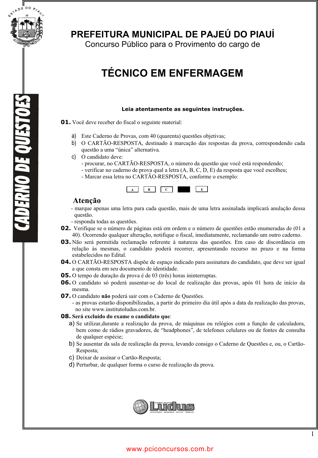 pcimarkpci MDAwMDowMDAwOjAwMDA6MDAwMDowMDAwOmZmZmY6MzZlOTpjMjU5:U2F0LCAxMSBTZXAgMjAyMSAxMjoyNDoyMyAtMDMwMA== 1 Leia atentamente as seguintes instruções. 01. Você deve receber do fiscal o seguinte material: a) Este Caderno de Provas, com 40 (quarenta) questões objetivas; b) O CARTÃO-RESPOSTA, destinado à marcação das respostas da prova, correspondendo cada questão a uma “única” alternativa. c) O candidato deve: - procurar, no CARTÃO-RESPOSTA, o número da questão que você está respondendo; - verificar no caderno de prova qual a letra (A, B, C, D, E) da resposta que você escolheu; - Marcar essa letra no CARTÃO-RESPOSTA, conforme o exemplo: Atenção - marque apenas uma letra para cada questão, mais de uma letra assinalada implicará anulação dessa questão. - responda todas as questões. 02. Verifique se o número de páginas está em ordem e o número de questões estão enumeradas de (01 a 40). Ocorrendo qualquer alteração, notifique o fiscal, imediatamente, reclamando um outro caderno. 03. Não será permitida reclamação referente à natureza das questões. Em caso de discordância em relação às mesmas, o candidato poderá recorrer, apresentando recurso no prazo e na forma estabelecidos no Edital. 04. O CARTÃO-RESPOSTA dispõe de espaço indicado para assinatura do candidato, que deve ser igual a que consta em seu documento de identidade. 05. O tempo de duração da prova é de 03 (três) horas ininterruptas. 06. O candidato só poderá ausentar-se do local de realização das provas, após 01 hora de início da mesma. 07. O candidato não poderá sair com o Caderno de Questões. - as provas estarão disponibilizadas, a partir do primeiro dia útil após a data da realização das provas, no site www.institutoludus.com.br. 08. Será excluído do exame o candidato que: a) Se utilizar,durante a realização da prova, de máquinas ou relógios com a função de calculadora, bem como de rádios gravadores, de “headphones”, de telefones celulares ou de fontes de consulta de qualquer espécie; b) Se ausentar da sala de realização da prova, levando consigo o Caderno de Questões e, ou, o Cartão- Resposta; c) Deixar de assinar o Cartão-Resposta; d) Perturbar, de qualquer forma o curso de realização da prova. D E A CB PREFEITURA MUNICIPAL DE PAJEÚ DO PIAUÍ Concurso Público para o Provimento do cargo de TÉCNICO EM ENFERMAGEM www.pciconcursos.com.br pcimarkpci MDAwMDowMDAwOjAwMDA6MDAwMDowMDAwOmZmZmY6MzZlOTpjMjU5:U2F0LCAxMSBTZXAgMjAyMSAxMjoyNDoyMyAtMDMwMA== 2 LÍNGUA PORTUGUESA TEXTO MUITOS EMPREGOS, UMA ÚNICA VOCAÇÃO Desde o estouro da “bolha” da internet, o jornalismo brasileiro, ou melhor, as principais organizações jornalísticas do país têm passado por maus bocados. Empreendimentos que pareciam promissores engasgaram ou morreram sufocados. Velhos problemas se agravam, novos surgem, com a receita publicitária sempre declinante. Entre os jornalistas, que assistem à redução do seu campo tradicional de trabalho, há uma sensação de que é a profissão que está em crise. Pode até ser, embora seja cedo para um diagnóstico fechado. Qualquer que seja o mal, no entanto, há casos que evidenciam que se pode fugir do que parece ser um destino. 01 - De acordo com o autor, A) As dificuldades nos meios de comunicação decorrem da atividade dos jornalistas, não do desempenho das empresas do setor. B) O crescimento desnecessário dos meios eletrônicos de comunicação provocou a maior crise já vivida pelos empresários do jornalismo. C) Dificuldades herdadas e crises próprias do momento determinaram que várias empresas jornalísticas buscassem reduzir seus investimentos em publicidade. D) A crise perceptível no setor jornalístico manifesta-se de maneiras distintas, dentre elas o comprometimento e interrupções de projetos na área. E) A conjuntura desfavorável vivida pelo jornalismo no país não se restringe às empresas do setor; atinge, inclusive, a internet. 02 - No contexto, a frase “Pode até ser, embora seja cedo para um diagnóstico fechado” significa que o autor, A) Mesmo admitindo que um juízo mais preciso exigiria mais tempo, reconhece a possibilidade de concordar com a impressão dos jornalistas. B) Criticando a precariedade da análise dos jornalistas, revela-se em dúvida sobre aceitar a idéia de que a crise é da profissão. C) Acolhendo a idéia de que a crise seja mesmo do jornalismo, ressalva a inutilidade do diagnóstico do problema. D) Ainda que comprove a tese dos jornalistas (a crise é do jornalismo), não deixa de questionar a competência desses profissionais para levantarem tal proposição. E) Levantando a hipótese de julgamento leviano, adverte para o fato de que os jornalistas não têm opinião consistente. 03 - A última frase do texto A) Sugere que más perspectivas no campo de atuação impedem o bom desempenho dos profissionais. B) Afirma a existência de situações que desmentem a fatalidade dos prognósticos acerca da profissão de jornalista. C) Incita os profissionais a não aceitarem, sem luta, a calamidade que se anuncia quanto ao futuro do jornalismo. D) Expressa o desejo de que, independentemente das causas, o jornalismo reverta a situação de crise em que se encontra. E) Evidencia que, em qualquer que seja o contexto, uma fuga nunca deve ser cogitada. 04 - Das frases abaixo, a única totalmente correta é: A) Têm provocado maus entendidos. B) Existe casos. C) Vêem a redução do seu campo tradicional de trabalho. D) Qualquer que sejam os males. E) Quaisquer que seja os males. 05 – Na frase “Todos somos os fios do tecido”, há exemplo de: A) metonímia. B) metáfora. C) pleonasmo. D) eufemismo. E) hipérbole. 06 – Indique a alternativa que apresenta a divisão silábica correta. A) pa-ra-íso; ra-í-nha; ca-a-tin-ga; di-á-rio. B) mo-er; co-or-de-na-ção; al-cool. C) oc-ci-pi-tal; can-as-ço; a-bsur-do. D) cha-péu; gue-rrei-ro;su-blo-car. E) sub-li-nhar; a-tri-to; ab-rup-te