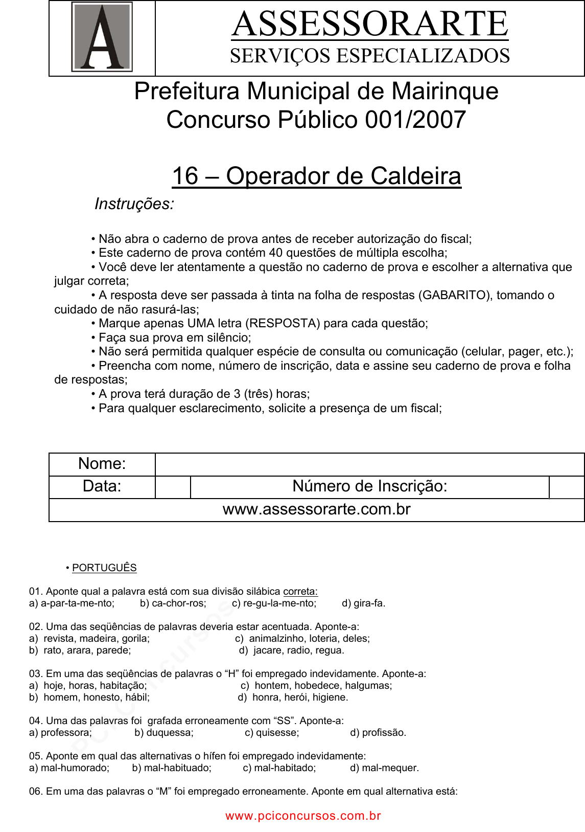 pcimarkpci MDAwMDowMDAwOjAwMDA6MDAwMDowMDAwOmZmZmY6MzZlOTpjMjU5:U2F0LCAxOCBTZXAgMjAyMSAyMDowNjo1NSAtMDMwMA== ASSESSORARTE SERVIÇOS ESPECIALIZADOS Prefeitura Municipal de Mairinque Concurso Público 001/2007 16 – Operador de Caldeira Instruções: • Não abra o caderno de prova antes de receber autorização do fiscal; • Este caderno de prova contém 40 questões de múltipla escolha; • Você deve ler atentamente a questão no caderno de prova e escolher a alternativa que julgar correta; • A resposta deve ser passada à tinta na folha de respostas (GABARITO), tomando o cuidado de não rasurá-las; • Marque apenas UMA letra (RESPOSTA) para cada questão; • Faça sua prova em silêncio; • Não será permitida qualquer espécie de consulta ou comunicação (celular, pager, etc.); • Preencha com nome, número de inscrição, data e assine seu caderno de prova e folha de respostas; • A prova terá duração de 3 (três) horas; • Para qualquer esclarecimento, solicite a presença de um fiscal; Nome: Data: Número de Inscrição: www.assessorarte.com.br • PORTUGUÊS 01. Aponte qual a palavra está com sua divisão silábica correta: a) a-par-ta-me-nto; b) ca-chor-ros; c) re-gu-la-me-nto; d) gira-fa. 02. Uma das seqüências de palavras deveria estar acentuada. Aponte-a: a) revista, madeira, gorila; c) animalzinho, loteria, deles; b) rato, arara, parede; d) jacare, radio, regua. 03. Em uma das seqüências de palavras o “H” foi empregado indevidamente. Aponte-a: a) hoje, horas, habitação; c) hontem, hobedece, halgumas; b) homem, honesto, hábil; d) honra, herói, higiene. 04. Uma das palavras foi grafada erroneamente com “SS”. Aponte-a: a) professora; b) duquessa; c) quisesse; d) profissão. 05. Aponte em qual das alternativas o hífen foi empregado indevidamente: a) mal-humorado; b) mal-habituado; c) mal-habitado; d) mal-mequer. 06. Em uma das palavras o “M” foi empregado erroneamente. Aponte em qual alternativa está: www.pciconcursos.com.br pcimarkpci MDAwMDowMDAwOjAwMDA6MDAwMDowMDAwOmZmZmY6MzZlOTpjMjU5:U2F0LCAxOCBTZXAgMjAyMSAyMDowNjo1NSAtMDMwMA== a) O jogo foi no campo adversário; c) Mês de dezembro é o mês do Natal; b) Você nem se lembra mais; d) Não comseguiu sequer compreender. 07. Uma das palavras não se escreve com “Z”. Aponte-a: a) pizo; b) limpeza; c) delicadeza; d) beleza. 08. Uma das seqüências de palavras foi acentuada erroneamente. Aponte-a. a) fábrica, números, lilás; b) atrás, gás, sílaba; c) ónibus, trés, tránsito; d) óculos, país, lápis. 09. Uma das palavras está grafada incorretamente com “J”. Aponte-a: a) fujiu; b) jeito; c) canjica; d) jipe. 10. O “Ç” foi utilizado indevidamente em qual das palavras: a) trança; b) melançia; c) açougue; d) palhaço. 11. Uma das palavras se escreve com “Ç” e não com “SS” como foi grafada. Aponte-a: a) assustar; b) assento; c) assunto; d) assucarado. 12. Qual das palavras deveria estar grafada com “X”: a) licho; b) bicho; c) chuva; d) chuchu. 13. Em qual das frases abaixo está faltando pontuação: a) Mamãe sempre dizia: arrume suas coisas; c) Então Carlos afirmou: Matheus é um gênio; b) Papai me disse estude meu filho; d) Vá embora. 14. Você é um coletor? O termo em destaque é: a) um verbo; b) um adjetivo; c) um pronome de tratamento; d) um substantivo próprio. 15. Sim. Eu sou um coletor. O termo em destaque é: a) um adjetivo; b) um substantivo próprio; c) um verbo; d) um pronome pessoal. 16. Aponte onde há erro de concordância verbal: a) Prefeitura e funcionários estão em acordo salarial; c) O arquivista e a recepcionista vai ser despedido; b) Médico e coletor são funcionários públicos; d) Haverá novo concurso. 17. Aponte onde há erro de concordância nominal: a) Estudo as línguas espanhola e inglesa; c) O coletor ganhou uma camisa e um mamão maduro; b) Sonhei com majestoso rios e florestas; d) As ruas estavam desertas. 18. Aponte qual a frase está correta quanto ao emprego da crase: a) Vou à Bahia; c) O coletor trabalha à pé; b) É proibida à entrada; d) À água de Nova Odessa é boa. 19. Uma das frases não está com sua concordância verbal correta. Aponte-a: a) As estrelas pareciam sorrir; c) Fez-se verdadeiras manhãs negras; b) Faz uma semana que estamos em greve; d) Elas havia prometido o impossível. 20. Uma das frases não está correta quanto à concordância nominal. Aponte-a: a) As minhas duas lindas filhas; c) Madalena e Mário são trabalhador; b) O alto ipê cobre de folhas amarelas; d) O mar e o céu estavam serenos. • MATEMÁTICA 21. Juca ganhou dez balas. Márcia pegou metade. Com quantas balas Juca ficou? a) 5 b) 6 c) 20 d) 12 22. Luís ganhou 2 lápis. Perdeu 1 e ganhou mais 5. Com quantos lápis ficou? a) 3 b) 5 c) 6 d) 7 23. Allana e Gabriel foram ao mercado e compraram 20 biscoitos. Separaram metade para cada um. Com quantos biscoitos cada um ficou? www.pciconcursos.com.br pcimarkpci MDAwMDowMDAwOjAwMDA6MDAwMDowMDAwOmZmZmY6MzZlOTpjMjU5:U2F0LCAxOCBTZXAgMjAyMSAyMDowNjo1NSAtMDMwMA== a) 40 b) 15 c) 5 d) 10 24. Num galinheiro havia 20 galos. Fugiram 2 e 2 morreram. Quantos galos ficaram no galinheiro? a) 18 b) 14 c) 16 d) 24 25. Havia 2 macacos e 50 bananas. Dez bananas caíram no rio e o restante dividiu-se entre os 2 macacos. Com quantas bananas cada macaco ficou? a) 25 b) 20 c) 30 d) 35 26. Um carro percorre por min 3 km. Quantos km o mesmo carro percorrerá em 30 min ? a) 90 km b) 27 km c) 30 km d) 60 km 27. Um coletor coleta 900 unidades em 3 noites. Em 1 noite coleta quantas unidades? a) 30 b) 300 c) 3.000 d) 600 28. Um coletor percorre 6 km em 3 horas de trabalho. Quantos km ele percorre por hora? a) 3 km b) 12 km c) 8 km d) 2 km 29. Um caminhão carrega 2 toneladas de detritos. Quantas toneladas carregarão 5 caminhões? a) 16 t b) 10 t c) 8 t d) 5 t 30. Uma determinada prefeitura empregou 10 coletores no mês de janeiro. Demitiu 5 coletores no mês de agosto e contratou mais 15 em novembro. Com 