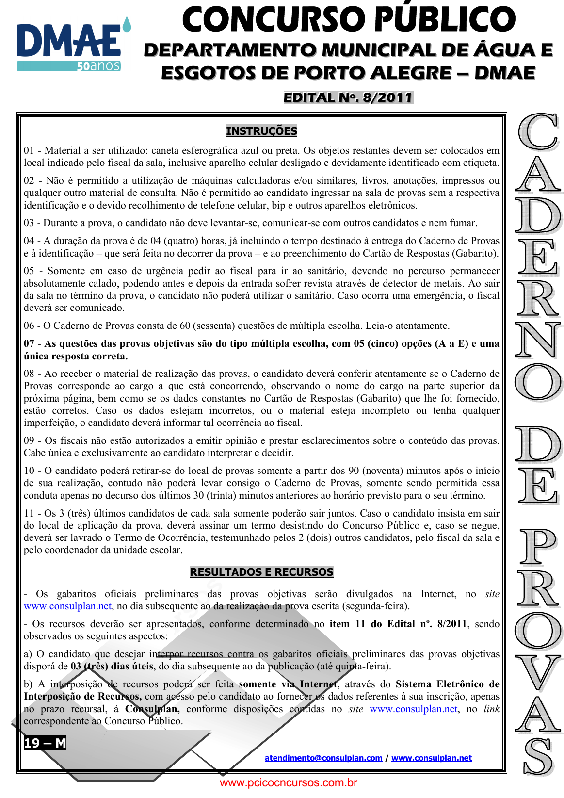 pcimarkpci MDAwMDowMDAwOjAwMDA6MDAwMDowMDAwOmZmZmY6MzZlOTpjMjU5:U2F0LCAxOCBTZXAgMjAyMSAyMjoyNTozMCAtMDMwMA== INSTRUÇÕES 01 - Material a ser utilizado: caneta esferográfica azul ou preta. Os objetos restantes devem ser colocados em local indicado pelo fiscal da sala, inclusive aparelho celular desligado e devidamente identificado com etiqueta. 02 - Não é permitido a utilização de máquinas calculadoras e/ou similares, livros, anotações, impressos ou qualquer outro material de consulta. Não é permitido ao candidato ingressar na sala de provas sem a respectiva identificação e o devido recolhimento de telefone celular, bip e outros aparelhos eletrônicos. 03 - Durante a prova, o candidato não deve levantar-se, comunicar-se com outros candidatos e nem fumar. 04 - A duração da prova é de 04 (quatro) horas, já incluindo o tempo destinado à entrega do Caderno de Provas e à identificação – que será feita no decorrer da prova – e ao preenchimento do Cartão de Respostas (Gabarito). 05 - Somente em caso de urgência pedir ao fiscal para ir ao sanitário, devendo no percurso permanecer absolutamente calado, podendo antes e depois da entrada sofrer revista através de detector de metais. Ao sair da sala no término da prova, o candidato não poderá utilizar o sanitário. Caso ocorra uma emergência, o fiscal deverá ser comunicado. 06 - O Caderno de Provas consta de 60 (sessenta) questões de múltipla escolha. Leia-o atentamente. 07 - As questões das provas objetivas são do tipo múltipla escolha, com 05 (cinco) opções (A a E) e uma única resposta correta. 08 - Ao receber o material de realização das provas, o candidato deverá conferir atentamente se o Caderno de Provas corresponde ao cargo a que está concorrendo, observando o nome do cargo na parte superior da próxima página, bem como se os dados constantes no Cartão de Respostas (Gabarito) que lhe foi fornecido, estão corretos. Caso os dados estejam incorretos, ou o material esteja incompleto ou tenha qualquer imperfeição, o candidato deverá informar tal ocorrência ao fiscal. 09 - Os fiscais não estão autorizados a emitir opinião e prestar esclarecimentos sobre o conteúdo das provas. Cabe única e exclusivamente ao candidato interpretar e decidir. 10 - O candidato poderá retirar-se do local de provas somente a partir dos 90 (noventa) minutos após o início de sua realização, contudo não poderá levar consigo o Caderno de Provas, somente sendo permitida essa conduta apenas no decurso dos últimos 30 (trinta) minutos anteriores ao horário previsto para o seu término. 11 - Os 3 (três) últimos candidatos de cada sala somente poderão sair juntos. Caso o candidato insista em sair do local de aplicação da prova, deverá assinar um termo desistindo do Concurso Público e, caso se negue, deverá ser lavrado o Termo de Ocorrência, testemunhado pelos 2 (dois) outros candidatos, pelo fiscal da sala e pelo coordenador da unidade escolar. RESULTADOS E RECURSOS - Os gabaritos oficiais preliminares das provas objetivas serão divulgados na Internet, no site www.consulplan.net, no dia subsequente ao da realização da prova escrita (segunda-feira). - Os recursos deverão ser apresentados, conforme determinado no item 11 do Edital nº. 8/2011, sendo observados os seguintes aspectos: a) O candidato que desejar interpor recursos contra os gabaritos oficiais preliminares das provas objetivas disporá de 03 (três) dias úteis, do dia subsequente ao da publicação (até quinta-feira). b) A interposição de recursos poderá ser feita somente via Internet, através do Sistema Eletrônico de Interposição de Recursos, com acesso pelo candidato ao fornecer os dados referentes à sua inscrição, apenas no prazo recursal, à Consulplan, conforme disposições contidas no site www.consulplan.net, no link correspondente ao Concurso Público. 19 – M DDDEEEPPPAAARRRTTTAAAMMMEEENNNTTTOOO MMMUUUNNNIIICCCIIIPPPAAALLL DDDEEE ÁÁÁGGGUUUAAA EEE EEESSSGGGOOOTTTOOOSSS DDDEEE PPPOOORRRTTTOOO AAALLLEEEGGGRRREEE ––– DDDMMMAAAEEE EEEDDDIIITTTAAALLL NNNººº... 888///222000111111 atendimento@consulplan.com / www.consulplan.net www.pcicocncursos.com.br pcimarkpci MDAwMDowMDAwOjAwMDA6MDAwMDowMDAwOmZmZmY6MzZlOTpjMjU5:U2F0LCAxOCBTZXAgMjAyMSAyMjoyNTozMCAtMDMwMA== CCCOOONNNCCCUUURRRSSSOOO PPPÚÚÚBBBLLLIIICCCOOO ––– DDDEEEPPPAAARRRTTTAAAMMMEEENNNTTTOOO MMMUUUNNNIIICCCIIIPPPAAALLL DDDEEE ÁÁÁGGGUUUAAA EEE EEESSSGGGOOOTTTOOOSSS DDDEEE PPPOOORRRTTTOOO AAALLLEEEGGGRRREEE ––– DDDMMMAAAEEE OPERADOR DE SUBESTAÇÃO www.consulplan.net / atendimento@consulplan.com - 2 - CCAARRGGOO:: OOPPEERRAADDOORR DDEE SSUUBBEESSTTAAÇÇÃÃOO TEXTO I: Não deixe uma torneira pingando Esquecer uma torneira pingando ou adiar o conserto de um pinga-pinga são atitudes comuns. No entanto, uma torneira pingando pouco mais de uma gota por segundo, em média, pode desperdiçar em um dia 46 litros d'água. Em um ano, esse desperdício chega a 16.500 litros. Se 10.000 famílias evitassem deixar uma torneira da casa pingando, a água economizada em 1 ano poderia abastecer toda a população de São Luís, capital do Maranhão, durante 1 dia. (Disponível em: <http://www.akatu.org.br>) 01) O assunto principal do texto é A) o cotidiano das pessoas. D) o conserto de um pinga-pinga. B) o abastecimento de água. E) desperdício e economia de água. C) atitudes comuns do dia-a-dia. 02) A respeito do texto, é correto afirmar que A) traz informações importantes. D) trata-se de uma carta informativa. B) explica o tratamento da água. E) trata-se de uma propaganda de torneiras. C) provoca um efeito de humor. 03) No texto, é feita uma crítica ao A) tratamento da água. D) uso consciente da água. B) desperdício de água. E) consumo de água no Maranhão. C) abastecimento de água. 04) “Se 10.000 famílias evitassem deixar uma torneira da casa pingando, a água economizada em 1 ano poderia abastecer toda a população de São Luís, capital d