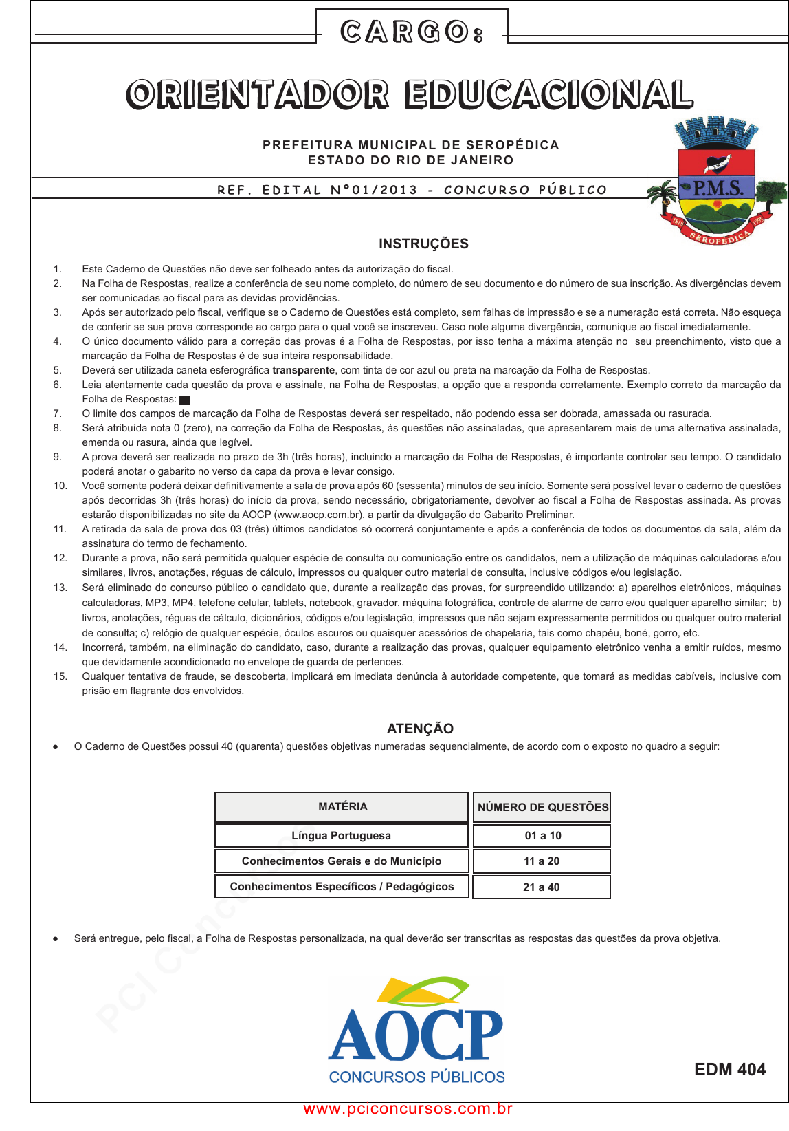 pcimarkpci MDAwMDowMDAwOjAwMDA6MDAwMDowMDAwOmZmZmY6MzZlOTpjMjU5:U2F0LCAxOCBTZXAgMjAyMSAyMzoxMjo1MCAtMDMwMA== C A R G O : PREFEITURA MUNICIPAL DE SEROPÉDICA ESTADO DO RIO DE JANEIRO R E F . E D I T A L N º 0 1 / 2 0 1 3 - C O N C U R S O P Ú B L I C O INSTRUÇÕES 1. Este Caderno de Questões não deve ser folheado antes da autorização do fiscal. 2. Na Folha de Respostas, realize a conferência de seu nome completo, do número de seu documento e do número de sua inscrição. As divergências devem ser comunicadas ao fiscal para as devidas providências. 3. Após ser autorizado pelo fiscal, verifique se o Caderno de Questões está completo, sem falhas de impressão e se a numeração está correta. Não esqueça de conferir se sua prova corresponde ao cargo para o qual você se inscreveu. Caso note alguma divergência, comunique ao fiscal imediatamente. 4. O único documento válido para a correção das provas é a Folha de Respostas, por isso tenha a máxima atenção no seu preenchimento, visto que a marcação da Folha de Respostas é de sua inteira responsabilidade. 5. Deverá ser utilizada caneta esferográfica transparente, com tinta de cor azul ou preta na marcação da Folha de Respostas. 6. Leia atentamente cada questão da prova e assinale, na Folha de Respostas, a opção que a responda corretamente. Exemplo correto da marcação da Folha de Respostas: 7. O limite dos campos de marcação da Folha de Respostas deverá ser respeitado, não podendo essa ser dobrada, amassada ou rasurada. 8. Será atribuída nota 0 (zero), na correção da Folha de Respostas, às questões não assinaladas, que apresentarem mais de uma alternativa assinalada, emenda ou rasura, ainda que legível. 9. A prova deverá ser realizada no prazo de 3h (três horas), incluindo a marcação da Folha de Respostas, é importante controlar seu tempo. O candidato poderá anotar o gabarito no verso da capa da prova e levar consigo. 10. Você somente poderá deixar definitivamente a sala de prova após 60 (sessenta) minutos de seu início. Somente será possível levar o caderno de questões após decorridas 3h (três horas) do início da prova, sendo necessário, obrigatoriamente, devolver ao fiscal a Folha de Respostas assinada. As provas estarão disponibilizadas no site da AOCP (www.aocp.com.br), a partir da divulgação do Gabarito Preliminar. 11. A retirada da sala de prova dos 03 (três) últimos candidatos só ocorrerá conjuntamente e após a conferência de todos os documentos da sala, além da assinatura do termo de fechamento. 12. Durante a prova, não será permitida qualquer espécie de consulta ou comunicação entre os candidatos, nem a utilização de máquinas calculadoras e/ou similares, livros, anotações, réguas de cálculo, impressos ou qualquer outro material de consulta, inclusive códigos e/ou legislação. 13. Será eliminado do concurso público o candidato que, durante a realização das provas, for surpreendido utilizando: a) aparelhos eletrônicos, máquinas calculadoras, MP3, MP4, telefone celular, tablets, notebook, gravador, máquina fotográfica, controle de alarme de carro e/ou qualquer aparelho similar; b) livros, anotações, réguas de cálculo, dicionários, códigos e/ou legislação, impressos que não sejam expressamente permitidos ou qualquer outro material de consulta; c) relógio de qualquer espécie, óculos escuros ou quaisquer acessórios de chapelaria, tais como chapéu, boné, gorro, etc. 14. Incorrerá, também, na eliminação do candidato, caso, durante a realização das provas, qualquer equipamento eletrônico venha a emitir ruídos, mesmo que devidamente acondicionado no envelope de guarda de pertences. 15. Qualquer tentativa de fraude, se descoberta, implicará em imediata denúncia à autoridade competente, que tomará as medidas cabíveis, inclusive com prisão em flagrante dos envolvidos. ATENÇÃO ● O Caderno de Questões possui 40 (quarenta) questões objetivas numeradas sequencialmente, de acordo com o exposto no quadro a seguir: EDM 404 ● Será entregue, pelo fiscal, a Folha de Respostas personalizada, na qual deverão ser transcritas as respostas das questões da prova objetiva. C A R G O : O R I E N T A D O R E D U C A C I O N A LO R I E N T A D O R E D U C A C I O N A L NÚMERO DE QUESTÕES MATÉRIA Língua Portuguesa Conhecimentos Gerais e do Município 01 a 10 11 a 20 Conhecimentos Específicos / Pedagógicos 21 a 40 www.pciconcursos.com.br www.pciconcursos.com.br pcimarkpci MDAwMDowMDAwOjAwMDA6MDAwMDowMDAwOmZmZmY6MzZlOTpjMjU5:U2F0LCAxOCBTZXAgMjAyMSAyMzoxMjo1MCAtMDMwMA== Gabarito Preliminar disponível em www.aocp.com.br ------------------------------------------------------------------------------------(destaque aqui)-------------------------------------------------------------------------- FOLHA PARA ANOTAÇÃO DAS RESPOSTAS DO CANDIDATO Questão Resp. 21 22 23 24 25 26 27 28 29 30 31 32 33 34 35 36 37 38 39 40 Questão Resp. 01 02 03 04 05 06 07 08 09 10 11 12 13 14 15 16 17 18 19 20 www.pciconcursos.com.br www.pciconcursos.com.br pcimarkpci MDAwMDowMDAwOjAwMDA6MDAwMDowMDAwOmZmZmY6MzZlOTpjMjU5:U2F0LCAxOCBTZXAgMjAyMSAyMzoxMjo1MCAtMDMwMA== 3 Cargo: Orientador Educacional não aprendem. Esse professor poderia entrar em crise, poderia buscar ajuda, poderia voltar a estudar, poderia ter planos de apoio de sua Secretaria de Educação. Mas nada disso costuma acontecer, porque não há sanção ao professor ineficaz, nem incentivo ao professor obstinado. O professor que fracassa continuará recebendo seu salário, pois tem estabilidade. O professor deixa de se preocupar em investir em si mesmo: 74% veem TV todos os dias, mas só 12% leem livros de ficção e 17% participam habitualmente de seminários de atualização. 7.§ Mesmo nesse sistema tão permissivo e ineficiente, persiste um problema: os professores sabem que seus alunos não estão aprendendo. E é extraordinariamente difícil a qualquer pessoa continuar em uma carreira, ind
