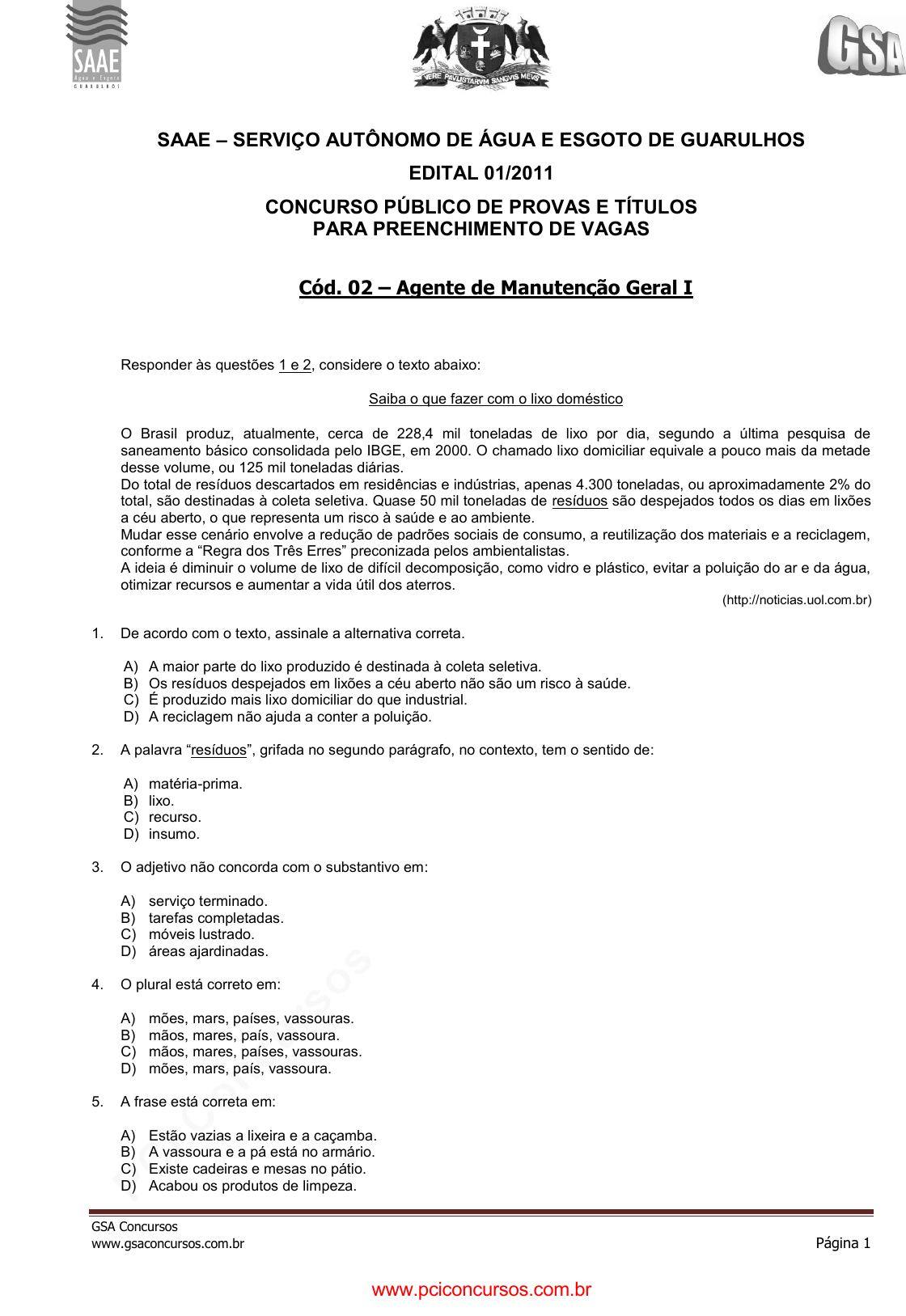 pcimarkpci MDAwMDowMDAwOjAwMDA6MDAwMDowMDAwOmZmZmY6MzZlOTpjMjU5:RnJpLCAxNyBTZXAgMjAyMSAwMzo1MDo1MSAtMDMwMA== GSA Concursos www.gsaconcursos.com.br Página 1 SAAE – SERVIÇO AUTÔNOMO DE ÁGUA E ESGOTO DE GUARULHOS EDITAL 01/2011 CONCURSO PÚBLICO DE PROVAS E TÍTULOS PARA PREENCHIMENTO DE VAGAS Cód. 02 – Agente de Manutenção Geral I Responder às questões 1 e 2, considere o texto abaixo: Saiba o que fazer com o lixo doméstico O Brasil produz, atualmente, cerca de 228,4 mil toneladas de lixo por dia, segundo a última pesquisa de saneamento básico consolidada pelo IBGE, em 2000. O chamado lixo domiciliar equivale a pouco mais da metade desse volume, ou 125 mil toneladas diárias. Do total de resíduos descartados em residências e indústrias, apenas 4.300 toneladas, ou aproximadamente 2% do total, são destinadas à coleta seletiva. Quase 50 mil toneladas de resíduos são despejados todos os dias em lixões a céu aberto, o que representa um risco à saúde e ao ambiente. Mudar esse cenário envolve a redução de padrões sociais de consumo, a reutilização dos materiais e a reciclagem, conforme a “Regra dos Três Erres” preconizada pelos ambientalistas. A ideia é diminuir o volume de lixo de difícil decomposição, como vidro e plástico, evitar a poluição do ar e da água, otimizar recursos e aumentar a vida útil dos aterros. (http://noticias.uol.com.br) 1. De acordo com o texto, assinale a alternativa correta. A) A maior parte do lixo produzido é destinada à coleta seletiva. B) Os resíduos despejados em lixões a céu aberto não são um risco à saúde. C) É produzido mais lixo domiciliar do que industrial. D) A reciclagem não ajuda a conter a poluição. 2. A palavra “resíduos”, grifada no segundo parágrafo, no contexto, tem o sentido de: A) matéria-prima. B) lixo. C) recurso. D) insumo. 3. O adjetivo não concorda com o substantivo em: A) serviço terminado. B) tarefas completadas. C) móveis lustrado. D) áreas ajardinadas. 4. O plural está correto em: A) mões, mars, países, vassouras. B) mãos, mares, país, vassoura. C) mãos, mares, países, vassouras. D) mões, mars, país, vassoura. 5. A frase está correta em: A) Estão vazias a lixeira e a caçamba. B) A vassoura e a pá está no armário. C) Existe cadeiras e mesas no pátio. D) Acabou os produtos de limpeza. www.pciconcursos.com.br pcimarkpci MDAwMDowMDAwOjAwMDA6MDAwMDowMDAwOmZmZmY6MzZlOTpjMjU5:RnJpLCAxNyBTZXAgMjAyMSAwMzo1MDo1MSAtMDMwMA== GSA Concursos www.gsaconcursos.com.br Página 2 6. A frase que está correta é:. A) As pessoas entrou no prédio sem a crachá. B) José e Carlos recebeu o salário dia dez. C) Carlos e seu chefe inspecionou o local onde seria a reunião. D) Zelar pelo patrimônio é dever de todo cidadão. 7. Observe as frases abaixo. 1 - Quem esqueceu de tampar o lixo? 2 - Que situação desagradável! Foi usada pontuação correta: A) apenas na primeira frase. B) nas duas frases. C) apenas na segunda frase. D) em nenhuma das frases. 8. O plural de lixo reciclável é: A) lixos reciclável. B) lixo recicláveis. C) lixos recicláveis. D) lixos reciclávels. 9. Uma fábrica de sabão em pedra embala seus produtos em caixas com três dúzias e meia de unidades. A produção de um dia foi suficiente para ser colocada em 219 caixas. Nesse dia foram produzidas ______ pedras de sabão. A) 9.198 B) 8.198 C) 8.888 D) 6.570 10. Para percorrer uma certa distância, um carro à gasolina gasta 12 litros e um carro a álcool gasta 16 litros. Se o preço da gasolina é R$ 2,36 e do álcool é R$ 1,64, para fazer esse percurso é mais vantajoso fazer com o carro _________, pois a viagem fica _______ mais barata. A) à gasolina – R$ 1,32 B) a álcool – R$ 2,18 C) a álcool – R$ 2,08 D) à gasolina – R$ 0,98 11. Para fazer a compra do mês no supermercado gastei 2 horas e 18 minutos, tempo que corresponde a: A) 108 minutos. B) 138 minutos. C) 78 minutos. D) 118 minutos. 12. O salário de um agente de manutenção é de R$ 897,00. Todo mês ele coloca 2/13 do seu salário na poupança. Para comprar um televisor que custa R$ 1.242,00 ele deverá guardar essa quantia por: A) 9 meses. B) 8 meses. C) 10 meses. D) 7 meses. 13. Se um agente de manutenção varrer mais 48 m² terá completado seu trabalho que é varrer um pátio quadrado que mede 15 m de lado. Ele já varreu: A) 287 m². B) 187 m². C) 178 m². D) 177 m². www.pciconcursos.com.br pcimarkpci MDAwMDowMDAwOjAwMDA6MDAwMDowMDAwOmZmZmY6MzZlOTpjMjU5:RnJpLCAxNyBTZXAgMjAyMSAwMzo1MDo1MSAtMDMwMA== GSA Concursos www.gsaconcursos.com.br Página 3 14. José foi participar de uma corrida. Iniciou a prova pesando 80kg e terminou a prova pesando 78,250 kg. Perdeu, na corrida. A) 2,85 kg. B) 1,85 kg. C) 2,75 kg. D) 1,75 kg. 15. Na malha abaixo estão identificadas as figuras A – B – C – D, compostas por quadrados que medem 1cm de lado. Sobre as figuras podemos afirmar que: 1 - a figura B tem o maior perímetro. 2 - as figuras A e D têm perímetros iguais. 3 - as figuras A e C têm perímetros iguais. É correto o que se afirma em: A) 1 e 2, apenas. B) 2 e 3, apenas. C) 1 e 3, apenas. D) 1, 2 e 3. 16. Sobre o armazenamento de material de construção é incorreto afirmar que: A) As madeiras a serem usadas em telhados podem ficar em espaço descoberto. B) As telhas devem ser manuseadas com muito cuidado porque são frágeis, mas podem ficar em local sem cobertura. C) Os tubos de PVC não devem ser deixados ao tempo, porque o sol, o sereno e a umidade podem ressecá-los e inutilizá-los com rachaduras. D) Os fios e cabos elétricos devem ser conservados enrolados, em local seco e coberto. 17. Ao armazenar sacos de cal e de cimento deve-se: 1 - armazená-los em local abrigado do mau tempo e protegidos da umidade do solo. 2 - conservar o cimento na sua embalagem original até o momento de ser utilizado. 3 - colocar em pilhas separadas os lotes de materiais recebidos em épocas diferentes, para que os mais velhos sejam usados em pr