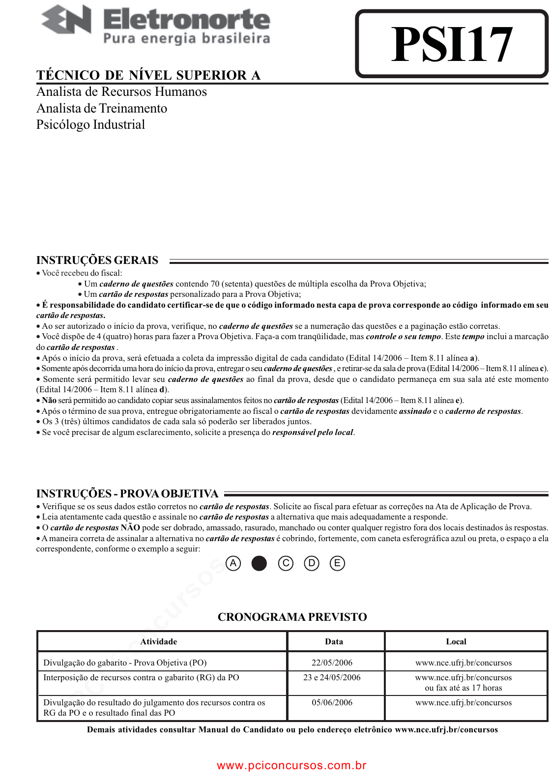 pcimarkpci MDAwMDowMDAwOjAwMDA6MDAwMDowMDAwOmZmZmY6MzZlOTpjMjU5:RnJpLCAxNyBTZXAgMjAyMSAxMjowMDo1OSAtMDMwMA== TÉCNICO DE NÍVEL SUPERIOR A Analista de Recursos Humanos Analista de Treinamento Psicólogo Industrial PSI17 CRONOGRAMA PREVISTO Atividade Data Local Divulgação do gabarito - Prova Objetiva (PO) 22/05/2006 www.nce.ufrj.br/concursos Interposição de recursos contra o gabarito (RG) da PO 23 e 24/05/2006 www.nce.ufrj.br/concursos ou fax até as 17 horas Divulgação do resultado do julgamento dos recursos contra os 05/06/2006 www.nce.ufrj.br/concursos RG da PO e o resultado final das PO Demais atividades consultar Manual do Candidato ou pelo endereço eletrônico www.nce.ufrj.br/concursos INSTRUÇÕES GERAIS • Você recebeu do fiscal: • Um caderno de questões contendo 70 (setenta) questões de múltipla escolha da Prova Objetiva; • Um cartão de respostas personalizado para a Prova Objetiva; • É responsabilidade do candidato certificar-se de que o código informado nesta capa de prova corresponde ao código informado em seu cartão de respostas. • Ao ser autorizado o início da prova, verifique, no caderno de questões se a numeração das questões e a paginação estão corretas. • Você dispõe de 4 (quatro) horas para fazer a Prova Objetiva. Faça-a com tranqüilidade, mas controle o seu tempo. Este tempo inclui a marcação do cartão de respostas . • Após o início da prova, será efetuada a coleta da impressão digital de cada candidato (Edital 14/2006 – Item 8.11 alínea a). • Somente após decorrida uma hora do início da prova, entregar o seu caderno de questões , e retirar-se da sala de prova (Edital 14/2006 – Item 8.11 alínea c). • Somente será permitido levar seu caderno de questões ao final da prova, desde que o candidato permaneça em sua sala até este momento (Edital 14/2006 – Item 8.11 alínea d). • Não será permitido ao candidato copiar seus assinalamentos feitos no cartão de respostas (Edital 14/2006 – Item 8.11 alínea e). • Após o término de sua prova, entregue obrigatoriamente ao fiscal o cartão de respostas devidamente assinado e o caderno de respostas. • Os 3 (três) últimos candidatos de cada sala só poderão ser liberados juntos. • Se você precisar de algum esclarecimento, solicite a presença do responsável pelo local. INSTRUÇÕES - PROVA OBJETIVA • Verifique se os seus dados estão corretos no cartão de respostas. Solicite ao fiscal para efetuar as correções na Ata de Aplicação de Prova. • Leia atentamente cada questão e assinale no cartão de respostas a alternativa que mais adequadamente a responde. • O cartão de respostas NÃO pode ser dobrado, amassado, rasurado, manchado ou conter qualquer registro fora dos locais destinados às respostas. • A maneira correta de assinalar a alternativa no cartão de respostas é cobrindo, fortemente, com caneta esferográfica azul ou preta, o espaço a ela correspondente, conforme o exemplo a seguir: A C D E www.pciconcursos.com.br pcimarkpci MDAwMDowMDAwOjAwMDA6MDAwMDowMDAwOmZmZmY6MzZlOTpjMjU5:RnJpLCAxNyBTZXAgMjAyMSAxMjowMDo1OSAtMDMwMA== 2 Concurso Público - 2006 LÍNGUA PORTUGUESA TEXTO CONSUMO ENERGÉTICO E IMPACTOS AMBIENTAIS Demétrio Magnoli e Regina Araújo Atualmente, os recursos energéticos mais utilizados no mundo são o carvão, o petróleo e o gás natural, a água e os minerais radioativos: juntos, eles correspondem à cerca de 90% do consumo energético mundial. A utilização de qualquer um deles acarreta danos ambientais. As fontes de energias limpas e renováveis, tais como a energia solar, a eólica e a geotérmica, ainda constituem parcelas desprezíveis no balanço energético mundial, em que pese os grandes investimentos em pesquisa realizados para torná-las mais eficientes e menos caras. A queima do petróleo, do carvão e, em menor escala, do gás natural, libera gases poluentes na atmosfera, inclusive os gases de estufa. No caso do carvão, os impactos ambientais começam já nos procedimentos de extração – a exploração das grandes minas carboníferas devasta a cobertura vegetal. O transporte marítimo do petróleo é outra atividade potencialmente impactante, devido aos riscos de vazamento. As grandes usinas hidrelétricas exigem a inundação de vastas áreas, causando alterações profundas nos ecossistemas. Também a fauna aquática dos rios pode ser seriamente afetada pela construção de barragens, que muitas vezes impossibilitam a migração sazonal, necessária para a reprodução de muitas espécies de peixes. Nas regiões onde a pesca é uma atividade econômica importante, o problema se torna ainda maior. A energia nuclear, além do risco de acidentes, gera resíduos com grande poder de contaminação. A água aquecida pelos reatores transfere calor para os rios, mares e depósitos subterrâneos pelos quais circula, causando um tipo especial de poluição térmica capaz de comprometer os ecossistemas. Certas correntes do pensamento ambientalista sustentam que despoluir o planeta implica diminuir a utilização desses recursos, ou, pelo menos, mantê-la em níveis próximos aos atuais. Entretanto os níveis de consumo vigentes nos países ricos são muitas vezes superiores aos dos países pobres. Assim, os patamares atuais excluem grande parte da humanidade não apenas da condição de poluidores, mas, principalmente, do consumo de bens e serviços considerados essenciais, e que precisam de energia para ser produzidos e distribuídos. Por isso, outras correntes defendem que a solução mais correta seria a adoção de padrões de consumo compatíveis com a sustentabilidade ambiental dos países ricos. 01 – A relação estabelecida entre os dois termos presentes no título do texto é de: (A) causa/conseqüência; (B) conseqüência/causa; (C) comparação; (D) afirmação/explicação; (E) afirmação/conclusão. 02 – A palavra “atualmente”, colocada ao início do texto, tem seu sentido dependent