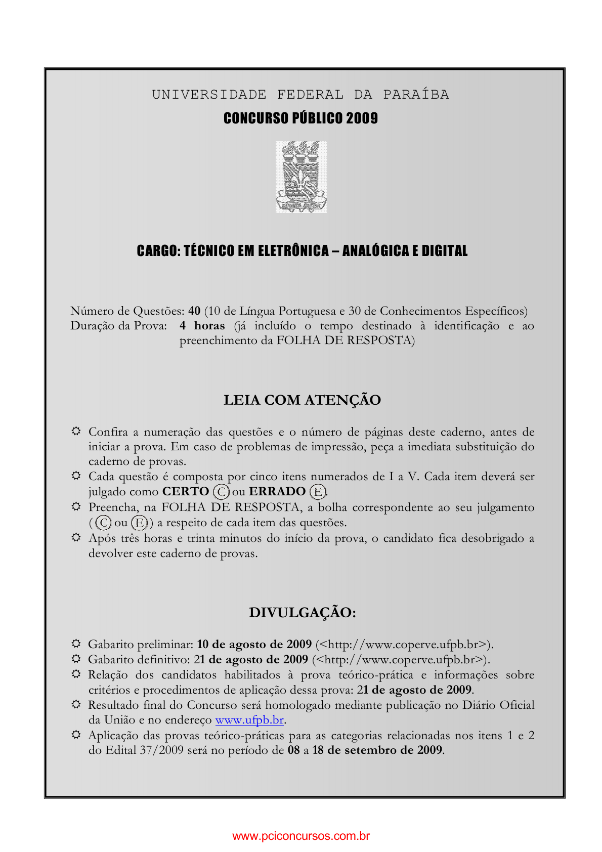 pcimarkpci MDAwMDowMDAwOjAwMDA6MDAwMDowMDAwOmZmZmY6MzZlOTpjMjU5:U2F0LCAxMSBTZXAgMjAyMSAxMDozNzozOCAtMDMwMA== 1 UNIVERSIDADE FEDERAL DA PARAÍBA CONCURSO PÚBLICO 2009 CARGO: TÉCNICO EM ELETRÔNICA – ANALÓGICA E DIGITAL Número de Questões: 40 (10 de Língua Portuguesa e 30 de Conhecimentos Específicos) Duração da Prova: 4 horas (já incluído o tempo destinado à identificação e ao preenchimento da FOLHA DE RESPOSTA) LEIA COM ATENÇÃO Confira a numeração das questões e o número de páginas deste caderno, antes de iniciar a prova. Em caso de problemas de impressão, peça a imediata substituição do caderno de provas. Cada questão é composta por cinco itens numerados de I a V. Cada item deverá ser julgado como CERTO ou ERRADO . Preencha, na FOLHA DE RESPOSTA, a bolha correspondente ao seu julgamento ( ou ) a respeito de cada item das questões. Após três horas e trinta minutos do início da prova, o candidato fica desobrigado a devolver este caderno de provas. DIVULGAÇÃO: Gabarito preliminar: 10 de agosto de 2009 (<http://www.coperve.ufpb.br>). Gabarito definitivo: 21 de agosto de 2009 (<http://www.coperve.ufpb.br>). Relação dos candidatos habilitados à prova teórico-prática e informações sobre critérios e procedimentos de aplicação dessa prova: 21 de agosto de 2009. Resultado final do Concurso será homologado mediante publicação no Diário Oficial da União e no endereço www.ufpb.br. Aplicação das provas teórico-práticas para as categorias relacionadas nos itens 1 e 2 do Edital 37/2009 será no período de 08 a 18 de setembro de 2009. www.pciconcursos.com.br pcimarkpci MDAwMDowMDAwOjAwMDA6MDAwMDowMDAwOmZmZmY6MzZlOTpjMjU5:U2F0LCAxMSBTZXAgMjAyMSAxMDozNzozOCAtMDMwMA== 2 www.pciconcursos.com.br pcimarkpci MDAwMDowMDAwOjAwMDA6MDAwMDowMDAwOmZmZmY6MzZlOTpjMjU5:U2F0LCAxMSBTZXAgMjAyMSAxMDozNzozOCAtMDMwMA== UFPB CONCURSO PÚBLICO 2009 1 II –– LLÍÍNNGGUUAA PPOORRTTUUGGUUEESSAA Para responder às questões de 1 a 10, leia o TEXTO abaixo. Falando difícil 1 4 8 12 16 20 24 28 32 36 40 44 48 Quando começam a ser ouvidas quase todo dia palavras que ninguém ouvia antes, é bom prestar atenção — estão criando confusão na língua portuguesa e raramente isso resulta em alguma coisa boa. No mundo dos três poderes e da política em geral, por exemplo, fala-se cada vez mais um idioma que tem cada vez menos semelhança com a linguagem de utilização corrente pelo público. As preferências, aí, variam de acordo com quem está falando. A ministra da Casa Civil, Dilma Rousseff, colocou no mapa a palavra “escandalização”, à qual acrescentou um “do nada”, para escrever o noticiário sobre o dossiê (ou banco de dados, como ela prefere) feito na Casa Civil com informações incômodas para o governo anterior. Mais recentemente, o ministro Gilmar Mendes, presidente do Supremo Tribunal Federal, contribuiu com o seu “espetacularização”; foi a palavra, vinda de uma língua desconhecida, que selecionou para manifestar seu desagrado quanto à colocação de algemas no banqueiro Daniel Dantas, durante as operações da Polícia Federal, que lhe valeram o desconforto de algumas horas na prisão. “Obstaculização”, “fulanização” ou “desconstitucionalização” são outras das preferidas do momento — sendo certo que existe, por algum motivo, uma atração especial por palavras que acabam em “zação”. O ministro Tarso Genro, da Justiça, parece ser o praticante mais entusiasmado desse tipo de linguagem entre as autoridades do governo. Poucas coisas, hoje em dia, são tão difíceis quanto pegar o ministro Genro falando naquilo que antigamente se chamava “português claro”. Ele já falou em “referência fundante”, “foco territorial etário”, “escuta social orgânica articulada”, entre outras coisas igualmente alarmantes; na semana passada, a propósito da influência do crime organizado nas eleições municipais do Rio de Janeiro, observou que “a insegurança já transgrediu para a questão eleitoral”. É curioso, uma vez que, como alto dirigente do Partido dos Trabalhadores, deveria se expressar com palavras que a média dos trabalhadores brasileiros conseguisse entender. Que trabalhador, por exemplo, saberia o que quer dizer “referência fundante”? Mas também o PT, e não só o ministro Genro, gosta de falar enrolado. Seus líderes vivem se referindo a “políticas”, que em geral são “estruturantes”; dizem que isso ou aquilo é “pontual”, e assim por diante. “Políticas”, no entendimento comum da população, são mulheres que se dedicam à política; a senadora Ideli Salvatti ou a ex-prefeita Marta Suplicy, por exemplo, são políticas. “Pontual”, da mesma forma, é o cidadão que chega na hora certa aos seus compromissos. Fazer o quê’? As pessoas acham que esse palavreado as torna mais inteligentes, ou mais profissionais. Conseguem, apenas, tornar-se confusas, ou simplesmente bobas. As coisas até que não estariam de todo mal se só os habitantes do mundo oficial falassem nesse patoá. Mas a história envolve muito mais gente boa, e muito mais do que apenas falar complicado — o que ela mostra, na verdade, é que o português está sendo tratado a pedradas no Brasil. O problema começa com a leitura. O presidente Luiz lnácio Lula da Silva, por exemplo, vive se orgulhando de não ler livros — algo que considera, além de chato, como um certificado de garantia de suas origens populares. Lula ficaria surpreso se soubesse quanta gente na elite brasileira também não lê livro nenhum — ou então lê pouco, lê livros ruins ou não entende o que lê. Muitos brasileiros ricos, como empresários, altos executivos e profissionais de sucesso, têm, sabidamente, problemas sérios na hora de escrever uma frase com mais de vinte palavras. Escrevem errado, escrevem mal ou não dá para entender o que escrevem — ou, mais simplesmente, não escrevem nada. No mesmo caminho vão professore