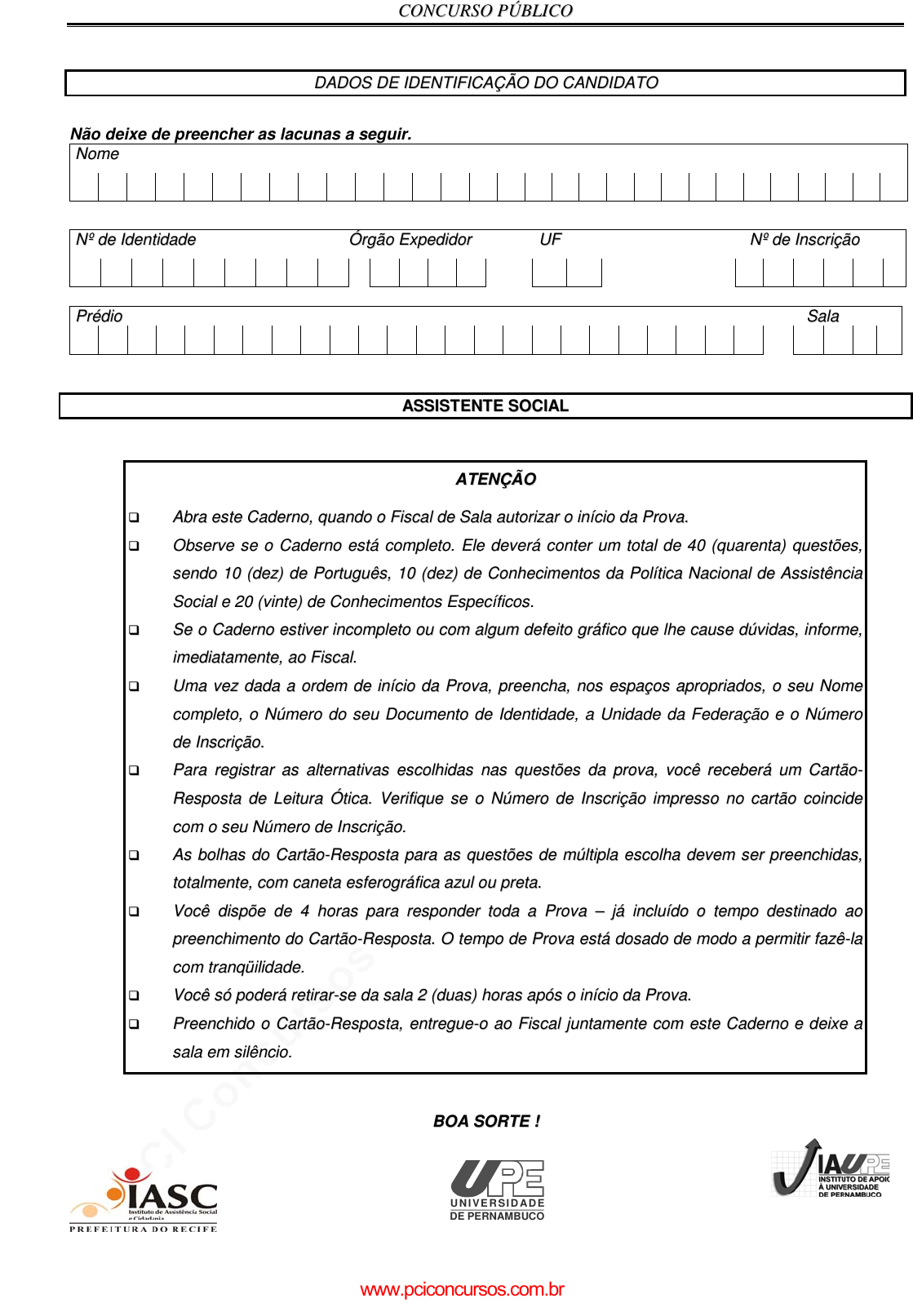 pcimarkpci MDAwMDowMDAwOjAwMDA6MDAwMDowMDAwOmZmZmY6MzZlOTpjMjU5:U2F0LCAxOCBTZXAgMjAyMSAwNDowNzoxNyAtMDMwMA== CCOONNCCUURRSSOO PPÚÚBBLLIICCOO DDAADDOOSS DDEE IIDDEENNTTIIFFIICCAAÇÇÃÃOO DDOO CCAANNDDIIDDAATTOO Não deixe de preencher as lacunas a seguir. NNoommee NNºº ddee IIddeennttiiddaaddee ÓÓrrggããoo EExxppeeddiiddoorr UUFF NNºº ddee IInnssccrriiççããoo PPrrééddiioo SSaallaa AASSSSIISSTTEENNTTEE SSOOCCIIAALL AATTEENNÇÇÃÃOO �� AAbbrraa eessttee CCaaddeerrnnoo,, qquuaannddoo oo FFiissccaall ddee SSaallaa aauuttoorriizzaarr oo iinníícciioo ddaa PPrroovvaa.. �� OObbsseerrvvee ssee oo CCaaddeerrnnoo eessttáá ccoommpplleettoo.. EEllee ddeevveerráá ccoonntteerr uumm ttoottaall ddee 4400 ((qquuaarreennttaa)) qquueessttõõeess,, sseennddoo 1100 ((ddeezz)) ddee PPoorrttuugguuêêss,, 1100 ((ddeezz)) ddee CCoonnhheecciimmeennttooss ddaa PPoollííttiiccaa NNaacciioonnaall ddee AAssssiissttêênncciiaa SSoocciiaall ee 2200 ((vviinnttee)) ddee CCoonnhheecciimmeennttooss EEssppeeccííffiiccooss.. �� SSee oo CCaaddeerrnnoo eessttiivveerr iinnccoommpplleettoo oouu ccoomm aallgguumm ddeeffeeiittoo ggrrááffiiccoo qquuee llhhee ccaauussee ddúúvviiddaass,, iinnffoorrmmee,, iimmeeddiiaattaammeennttee,, aaoo FFiissccaall.. �� UUmmaa vveezz ddaaddaa aa oorrddeemm ddee iinníícciioo ddaa PPrroovvaa,, pprreeeenncchhaa,, nnooss eessppaaççooss aapprroopprriiaaddooss,, oo sseeuu NNoommee ccoommpplleettoo,, oo NNúúmmeerroo ddoo sseeuu DDooccuummeennttoo ddee IIddeennttiiddaaddee,, aa UUnniiddaaddee ddaa FFeeddeerraaççããoo ee oo NNúúmmeerroo ddee IInnssccrriiççããoo.. �� PPaarraa rreeggiissttrraarr aass aalltteerrnnaattiivvaass eessccoollhhiiddaass nnaass qquueessttõõeess ddaa pprroovvaa,, vvooccêê rreecceebbeerráá uumm CCaarrttããoo-- RReessppoossttaa ddee LLeeiittuurraa ÓÓttiiccaa.. VVeerriiffiiqquuee ssee oo NNúúmmeerroo ddee IInnssccrriiççããoo iimmpprreessssoo nnoo ccaarrttããoo ccooiinncciiddee ccoomm oo sseeuu NNúúmmeerroo ddee IInnssccrriiççããoo.. �� AAss bboollhhaass ddoo CCaarrttããoo--RReessppoossttaa ppaarraa aass qquueessttõõeess ddee mmúúllttiippllaa eessccoollhhaa ddeevveemm sseerr pprreeeenncchhiiddaass,, ttoottaallmmeennttee,, ccoomm ccaanneettaa eessffeerrooggrrááffiiccaa aazzuull oouu pprreettaa.. �� VVooccêê ddiissppõõee ddee 44 hhoorraass ppaarraa rreessppoonnddeerr ttooddaa aa PPrroovvaa –– jjáá iinncclluuííddoo oo tteemmppoo ddeessttiinnaaddoo aaoo pprreeeenncchhiimmeennttoo ddoo CCaarrttããoo--RReessppoossttaa.. OO tteemmppoo ddee PPrroovvaa eessttáá ddoossaaddoo ddee mmooddoo aa ppeerrmmiittiirr ffaazzêê--llaa ccoomm ttrraannqqüüiilliiddaaddee.. �� VVooccêê ssóó ppooddeerráá rreettiirraarr--ssee ddaa ssaallaa 22 ((dduuaass)) hhoorraass aappóóss oo iinníícciioo ddaa PPrroovvaa.. �� PPrreeeenncchhiiddoo oo CCaarrttããoo--RReessppoossttaa,, eennttrreegguuee--oo aaoo FFiissccaall jjuunnttaammeennttee ccoomm eessttee CCaaddeerrnnoo ee ddeeiixxee aa ssaallaa eemm ssiillêênncciioo.. BBOOAA SSOORRTTEE !! UNIVE RSIDADE DE PERNAMBUCO www.pciconcursos.com.br pcimarkpci MDAwMDowMDAwOjAwMDA6MDAwMDowMDAwOmZmZmY6MzZlOTpjMjU5:U2F0LCAxOCBTZXAgMjAyMSAwNDowNzoxNyAtMDMwMA== CCOONNCCUURRSSOO PPÚÚBBLLIICCOO 2 PPOORRTTUUGGUUÊÊSS TEXTO 2006 é o ano em que todo o Brasil se reúne para comemorar uma grande conquista: a auto-suficiência em petróleo Este ano vai entrar para a história. Com o início da operação da plataforma P-50, a Petrobras fez do Brasil um dos poucos países do mundo auto-suficientes em petróleo. Uma conquista importante para o País porque garante a estabilidade na produção de energia, atraindo mais investimentos estrangeiros, aquecendo a economia e gerando mais empregos. É uma conquista importante para a Petrobras porque é garantia de mais recursos para continuar investindo em tecnologia, capacitação técnica e preparação para novos desafios. Desafios como pesquisa e desenvolvimento de fontes de energias renováveis, como o diesel. Tudo para garantir a auto-suficiência daqui para frente. Auto-suficiência. É a Petrobras se preocupando, cada vez mais, com o futuro do País. Revista Época. 01 de maio de 2006. p. 78. 01. Ao declarar no início do texto, “Este ano vai entrar para a história”, o autor faz referência ao A) ano passado como momentos de grandes registros e lembranças. B) ano letivo que rege o calendário escolar da rede oficial de ensino. C) ano que está sendo vivenciado e que marcará os anais da história brasileira. D) período que compreende o surgimento da Petrobras. E) ano em que a Petrobras deverá recuar diante dos múltiplos desafios. 02. Através do período “ ... a Petrobras fez do Brasil um dos poucos países do mundo auto-suficientes em petróleo.”, conclui-se que A) pouca importância deve ser dada à Petrobras no cenário da economia brasileira. B) inegavelmente, a Petrobras prejudicou a exportação do petróleo brasileiro. C) são infindáveis os países independentes em termos de petróleo. D) graças à Petrobras, a auto-suficiência de nosso país em termos de petróleo é atualmente uma realidade. E) ser auto-suficiente em petróleo é abrir mão em favor dos países vizinhos. 03. A conquista da auto-suficiência gerou uma série de benefícios ao nosso Brasil. Abaixo, apenas, uma alternativa elenca corretamente alguns desses benefícios. Assinale-a. A) Aquece a economia e desestabiliza a produção de energia. B) Investe em capacitação técnica e reduz a produção de energia. C) Investe em tecnologia e repudia os investimentos do exterior. D) Gera novos empregos e estabiliza a produção de energia. E) Reduz o número de empregos e aquece a economia. 04. Em “Tudo para garantir a auto-suficiência daqui para frente.”, percebe-se A) a necessidade de relaxar face os ditames que regem a auto-suficiência do petróleo. B) o desejo de que no futuro a auto-suficiência decline em seus princ