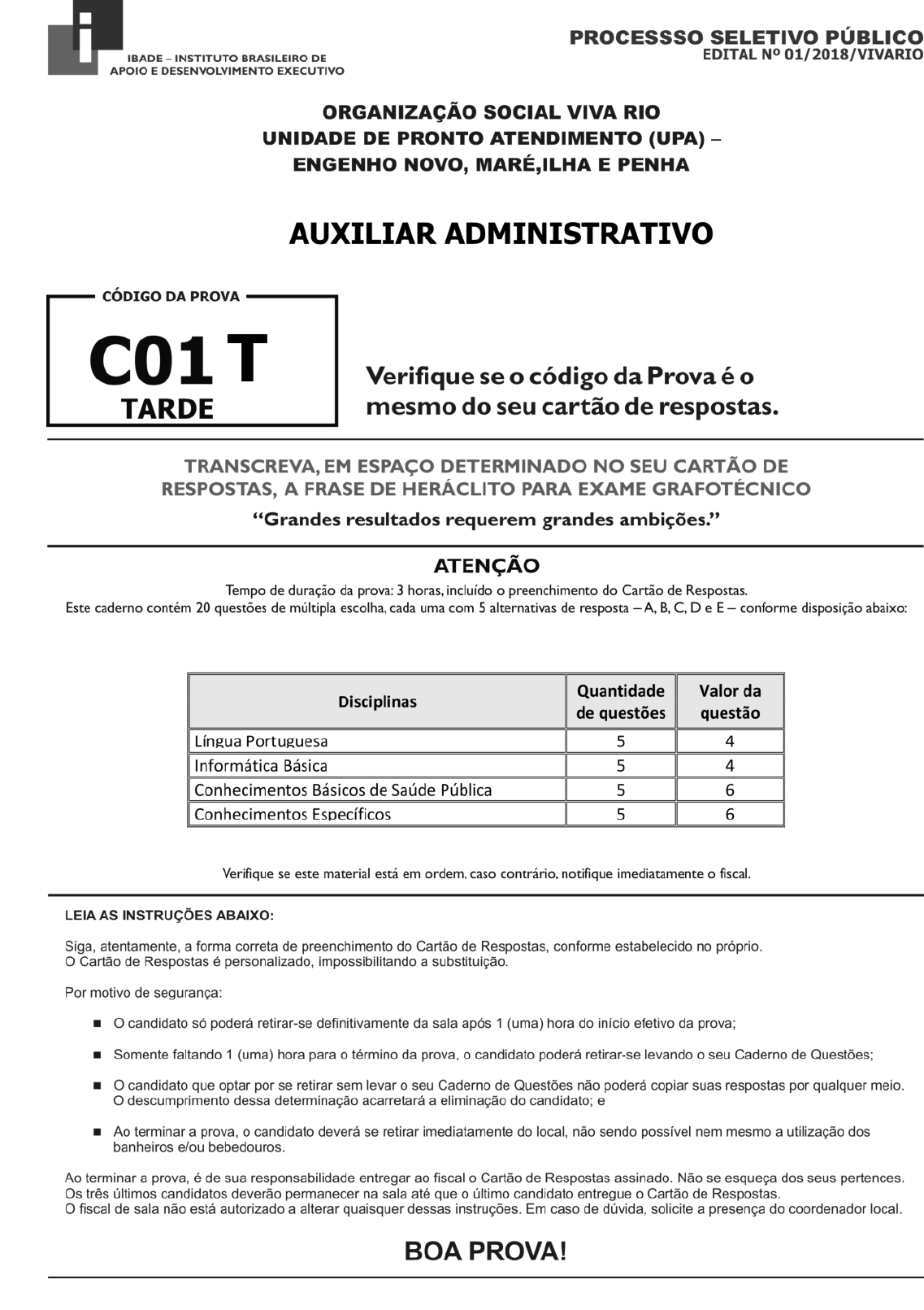 pcimarkpci MDAwMDowMDAwOjAwMDA6MDAwMDowMDAwOmZmZmY6MzZlOTpjMjU5:U2F0LCAxOCBTZXAgMjAyMSAwNzoxNTo0NSAtMDMwMA== T pcimarkpci MDAwMDowMDAwOjAwMDA6MDAwMDowMDAwOmZmZmY6MzZlOTpjMjU5:U2F0LCAxOCBTZXAgMjAyMSAwNzoxNTo0NSAtMDMwMA== 02 LÍNGUA PORTUGUESA Questão 01 A) B) C) D) E) Questão 02 A) B) C) D) E) Questão 03 A) B) C) D) E) pcimarkpci MDAwMDowMDAwOjAwMDA6MDAwMDowMDAwOmZmZmY6MzZlOTpjMjU5:U2F0LCAxOCBTZXAgMjAyMSAwNzoxNTo0NSAtMDMwMA== 03 Questão 04 A) B) C) D) E) Questão 05 A) B) C) D) E) INFORMÁTICA BÁSICA Questão 06 A) B) C) D) E) Questão 07 A) B) C) D) E) Questão 08 A) B) C) D) E) Questão 09 A) B) C) D) E) Questão 10 A) B) C) D) E) pcimarkpci MDAwMDowMDAwOjAwMDA6MDAwMDowMDAwOmZmZmY6MzZlOTpjMjU5:U2F0LCAxOCBTZXAgMjAyMSAwNzoxNTo0NSAtMDMwMA== 04 CONHECIMENTOS BÁSICOS DE SAÚDE PÚBLICA Questão 11 A) B) C) D) E) Questão 12 A) B) C) D) E) Questão 13 A) B) C) D) E) Questão 14 A) B) C) D) E) Questão 15 A) B) C) D) E) CONHECIMENTOS ESPECÍFICOS Questão 16 A) B) C) D) E) Questão 17 A) B) C) D) E) pcimarkpci MDAwMDowMDAwOjAwMDA6MDAwMDowMDAwOmZmZmY6MzZlOTpjMjU5:U2F0LCAxOCBTZXAgMjAyMSAwNzoxNTo0NSAtMDMwMA== 05 Questão 18 A) B) C) D) E) Questão 19 A) B) C) D) E) Questão 20 A) B) C) D) E) pcimarkpci MDAwMDowMDAwOjAwMDA6MDAwMDowMDAwOmZmZmY6MzZlOTpjMjU5:U2F0LCAxOCBTZXAgMjAyMSAwNzoxNTo0MSAtMDMwMA== Cargo: A01 - COPEIRO Prova: T (Data da Prova: 8/4/2018) Língua Portuguesa 1 2 3 4 5 6 7 C A C A E C C Conhecimentos Básicos de Saúde Pública 8 9 10 11 12 13 C C A D C E Conhecimentos Específicos 14 15 16 17 18 19 20 A C D B A A E Cargo: A01 - COPEIRO Prova: V (Data da Prova: 8/4/2018) Língua Portuguesa 1 2 3 4 5 6 7 A A B C E A D Conhecimentos Básicos de Saúde Pública 8 9 10 11 12 13 E E E A B D Conhecimentos Específicos 14 15 16 17 18 19 20 B D D C A D A Cargo: A01 - COPEIRO Prova: W (Data da Prova: 8/4/2018) Língua Portuguesa 1 2 3 4 5 6 7 C E C E E B D Conhecimentos Básicos de Saúde Pública 8 9 10 11 12 13 D B D E A B Conhecimentos Específicos 14 15 16 17 18 19 20 E E A C B B C Legenda: Questão Anulada - Questão Alterada PSP VIVA RIO – UPA'S ENGENHO NOVO, ILHA, MARÉ E PENHA Gabarito Final da Prova Objetiva Página 1 de 7 pcimarkpci MDAwMDowMDAwOjAwMDA6MDAwMDowMDAwOmZmZmY6MzZlOTpjMjU5:U2F0LCAxOCBTZXAgMjAyMSAwNzoxNTo0MSAtMDMwMA== Cargo: A02 - MAQUEIRO Prova: T (Data da Prova: 8/4/2018) Língua Portuguesa 1 2 3 4 5 6 7 C D A D D B E Conhecimentos Básicos de Saúde Pública 8 9 10 11 12 13 A E B C B A Conhecimentos Específicos 14 15 16 17 18 19 20 A E C D D B * Cargo: A02 - MAQUEIRO Prova: V (Data da Prova: 8/4/2018) Língua Portuguesa 1 2 3 4 5 6 7 A C D C D C C Conhecimentos Básicos de Saúde Pública 8 9 10 11 12 13 B A B B A C Conhecimentos Específicos 14 15 16 17 18 19 20 B E D E B E * Cargo: A02 - MAQUEIRO Prova: W (Data da Prova: 8/4/2018) Língua Portuguesa 1 2 3 4 5 6 7 C D B D E D E Conhecimentos Básicos de Saúde Pública 8 9 10 11 12 13 B A E C B B Conhecimentos Específicos 14 15 16 17 18 19 20 C E A A D C * Cargo: B01 - TÉCNICO DE ENFERMAGEM Prova: T (Data da Prova: 8/4/2018) Conhecimentos Básicos de Saúde Pública 1 2 3 4 5 6 7 8 9 10 E C B C E A D C A D CONHECIMENTOS ESPECÍFICOS 11 12 13 14 15 16 17 18 19 20 E E E A B B E A C E Legenda: Questão Anulada - Questão Alterada PSP VIVA RIO – UPA'S ENGENHO NOVO, ILHA, MARÉ E PENHA Gabarito Final da Prova Objetiva Página 2 de 7 pcimarkpci MDAwMDowMDAwOjAwMDA6MDAwMDowMDAwOmZmZmY6MzZlOTpjMjU5:U2F0LCAxOCBTZXAgMjAyMSAwNzoxNTo0MSAtMDMwMA== Cargo: B01 - TÉCNICO DE ENFERMAGEM Prova: V (Data da Prova: 8/4/2018) Conhecimentos Básicos de Saúde Pública 1 2 3 4 5 6 7 8 9 10 C E C A C E D D B A CONHECIMENTOS ESPECÍFICOS 11 12 13 14 15 16 17 18 19 20 E B A C C B C E B E Cargo: B01 - TÉCNICO DE ENFERMAGEM Prova: W (Data da Prova: 8/4/2018) Conhecimentos Básicos de Saúde Pública 1 2 3 4 5 6 7 8 9 10 E D C E A D E E C D CONHECIMENTOS ESPECÍFICOS 11 12 13 14 15 16 17 18 19 20 A C A C D D A C D A Cargo: B02 - TÉCNICO DE LABORATÓRIO Prova: T (Data da Prova: 8/4/2018) Conhecimentos Básicos de Saúde Pública 1 2 3 4 5 6 7 8 9 10 A C B E D A B C E D CONHECIMENTOS ESPECÍFICOS 11 12 13 14 15 16 17 18 19 20 E D C A D E A E C B Cargo: B03 - TÉCNICO EM RADIOLOGIA Prova: T (Data da Prova: 8/4/2018) Conhecimentos Básicos de Saúde Pública 1 2 3 4 5 6 7 8 9 10 A A C D A E C E A B CONHECIMENTOS ESPECÍFICOS 11 12 13 14 15 16 17 18 19 20 B A B C E E C C C B Cargo: B03 - TÉCNICO EM RADIOLOGIA Prova: V (Data da Prova: 8/4/2018) Conhecimentos Básicos de Saúde Pública 1 2 3 4 5 6 7 8 9 10 E D A D D A C B A D CONHECIMENTOS ESPECÍFICOS 11 12 13 14 15 16 17 18 19 20 B C D B C C A C C C Legenda: Questão Anulada - Questão Alterada PSP VIVA RIO – UPA'S ENGENHO NOVO, ILHA, MARÉ E PENHA Gabarito Final da Prova Objetiva Página 3 de 7 pcimarkpci MDAwMDowMDAwOjAwMDA6MDAwMDowMDAwOmZmZmY6MzZlOTpjMjU5:U2F0LCAxOCBTZXAgMjAyMSAwNzoxNTo0MSAtMDMwMA== Cargo: B03 - TÉCNICO EM RADIOLOGIA Prova: W (Data da Prova: 8/4/2018) Conhecimentos Básicos de Saúde Pública 1 2 3 4 5 6 7 8 9 10 B A B E A B B A B C CONHECIMENTOS ESPECÍFICOS 11 12 13 14 15 16 17 18 19 20 A D B A E D D B C A Cargo: C01 - AUXILIAR ADMINISTRATIVO Prova: T (Data da Prova: 8/4/2018) Língua Portuguesa 1 2 3 4 5 C A E E A Informática Básica 6 7 8 9 10 C E C A B Conhecimentos Básicos de Saúde Pública 11 12 13 14 15 A B D A E Conhecimentos Específicos 16 17 18 19 20 E A B E C Cargo: C01 - AUXILIAR ADMINISTRATIVO Prova: V (Data da Prova: 8/4/2018) Língua Portuguesa 1 2 3 4 5 D B B B C Informática Básica 6 7 8 9 10 D A B D E Conhecimentos Básicos de Saúde Pública 11 12 13 14 15 E E E E A Conhecimentos Específicos 16 17 18 19 20 B A E C B Legenda: Questão Anulada - Questão Alterada PSP VIVA RIO – UPA'S ENGENHO NOVO, ILHA, MARÉ E PENHA Gabarito Final da Prova Objetiva Página 4 de 7 pcimarkpci MDAwMDowMDAwOjAwMDA6MDAwMDowMDAwOmZmZmY6MzZlOTpjMjU5:U2F0LCAxOCBTZXAgMjAyMSAwNzoxNTo0MSAtMDMwMA== Cargo: C01 - AUXILIAR ADMINISTRATIVO Prova: W (Data da Prova: 8/4/2