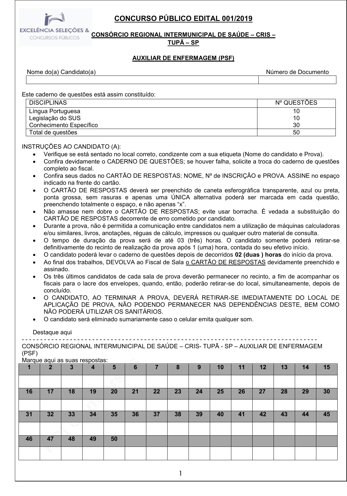 pcimarkpci MDAwMDowMDAwOjAwMDA6MDAwMDowMDAwOmZmZmY6MzZlOTpjMjU5:U2F0LCAxOCBTZXAgMjAyMSAxMDoxMzo1NiAtMDMwMA== 1 CONCURSO PÚBLICO EDITAL 001/2019 CONSÓRCIO REGIONAL INTERMUNICIPAL DE SAÚDE – CRIS – TUPÃ – SP AUXILIAR DE ENFERMAGEM (PSF) Nome do(a) Candidato(a) Número de Documento Este caderno de questões está assim constituído: INSTRUÇÕES AO CANDIDATO (A): Verifique se está sentado no local correto, condizente com a sua etiqueta (Nome do candidato e Prova). Confira devidamente o CADERNO DE QUESTÕES; se houver falha, solicite a troca do caderno de questões completo ao fiscal. Confira seus dados no CARTÃO DE RESPOSTAS: NOME, Nº de INSCRIÇÃO e PROVA. ASSINE no espaço indicado na frente do cartão. O CARTÃO DE RESPOSTAS deverá ser preenchido de caneta esferográfica transparente, azul ou preta, ponta grossa, sem rasuras e apenas uma ÚNICA alternativa poderá ser marcada em cada questão, preenchendo totalmente o espaço, e não apenas “x”. Não amasse nem dobre o CARTÃO DE RESPOSTAS; evite usar borracha. É vedada a substituição do CARTÃO DE RESPOSTAS decorrente de erro cometido por candidato. Durante a prova, não é permitida a comunicação entre candidatos nem a utilização de máquinas calculadoras e/ou similares, livros, anotações, réguas de cálculo, impressos ou qualquer outro material de consulta. O tempo de duração da prova será de até 03 (três) horas. O candidato somente poderá retirar-se definitivamente do recinto de realização da prova após 1 (uma) hora, contada do seu efetivo início. O candidato poderá levar o caderno de questões depois de decorridos 02 (duas ) horas do início da prova. Ao final dos trabalhos, DEVOLVA ao Fiscal de Sala o CARTÃO DE RESPOSTAS devidamente preenchido e assinado. Os três últimos candidatos de cada sala de prova deverão permanecer no recinto, a fim de acompanhar os fiscais para o lacre dos envelopes, quando, então, poderão retirar-se do local, simultaneamente, depois de concluído. O CANDIDATO, AO TERMINAR A PROVA, DEVERÁ RETIRAR-SE IMEDIATAMENTE DO LOCAL DE APLICAÇÃO DE PROVA, NÃO PODENDO PERMANECER NAS DEPENDÊNCIAS DESTE, BEM COMO NÃO PODERÁ UTILIZAR OS SANITÁRIOS. O candidato será eliminado sumariamente caso o celular emita qualquer som. Destaque aqui - - - - - - - - - - - - - - - - - - - - - - - - - - - - - - - - - - - - - - - - - - - - - - - - - - - - - - - - - - - - - - - - - - - - - - - - - - - - - - - - CONSÓRCIO REGIONAL INTERMUNICIPAL DE SAÚDE – CRIS- TUPÃ - SP – AUXILIAR DE ENFERMAGEM (PSF) Marque aqui as suas respostas: 1 2 3 4 5 6 7 8 9 10 11 12 13 14 15 16 17 18 19 20 21 22 23 24 25 26 27 28 29 30 31 32 33 34 35 36 37 38 39 40 41 42 43 44 45 46 47 48 49 50 DISCIPLINAS Nº QUESTÕES Língua Portuguesa Legislação do SUS Conhecimento Específico 10 10 30 Total de questões 50 pcimarkpci MDAwMDowMDAwOjAwMDA6MDAwMDowMDAwOmZmZmY6MzZlOTpjMjU5:U2F0LCAxOCBTZXAgMjAyMSAxMDoxMzo1NiAtMDMwMA== 2 RASCUNHO RASCUNHO pcimarkpci MDAwMDowMDAwOjAwMDA6MDAwMDowMDAwOmZmZmY6MzZlOTpjMjU5:U2F0LCAxOCBTZXAgMjAyMSAxMDoxMzo1NiAtMDMwMA== 3 LÍNGUA PORTUGUESA Leia o texto abaixo e responda as questões de 1 a 9. Conclusões de Aninha Estavam ali parados. Marido e mulher. Esperavam o carro. E foi que veio aquela da roça tímida, humilde, sofrida. Contou que o fogo, lá longe, tinha queimado seu rancho, e tudo que tinha dentro. Estava ali no comércio pedindo um auxílio para levantar novo rancho e comprar suas pobrezinhas. O homem ouviu. Abriu a carteira tirou uma cédula, entregou sem palavra. A mulher ouviu. Perguntou, indagou, especulou, aconselhou, se comoveu e disse que Nossa Senhora havia de ajudar E não abriu a bolsa. Qual dos dois ajudou mais? Donde se infere que o homem ajuda sem participar e a mulher participa sem ajudar. Da mesma forma aquela sentença: "A quem te pedir um peixe, dá uma vara de pescar." Pensando bem, não só a vara de pescar, também a linhada, o anzol, a chumbada, a isca, apontar um poço piscoso e ensinar a paciência do pescador. Você faria isso, Leitor? Antes que tudo isso se fizesse o desvalido não morreria de fome? Conclusão: Na prática, a teoria é outra Cora Coralina 1) Sobre o texto de referência é CORRETO afirmar que: a) Marido e mulher vieram da roça pedir ajuda. b) Homem e mulher participam ajudando em dinheiro. c) O fogo consumiu o comércio daquela que veio da roça. d) A mulher comovida, não doou dinheiro, disse que Nossa Senhora haveria de ajudar. 2) O texto nos dá a entender que: a) A mulher ajudou mais devido as suas palavras de incentivo. b) O homem ajudou mais devido ao dinheiro doado. c) Nenhum dos dois ajudou de forma significativa. d) Ambos ajudaram da mesma forma e, com o mesmo impacto. 3) “Donde se infere que o homem ajuda sem participar e a mulher participa sem ajudar.” O texto em destaque foi utilizado no trecho com o sentido de expressar: a) Deduzir, concluir. b) Cotejar, examinar. c) Afilar, afinar. d) Desfrutar, apreciar. 4) “Pensando bem, não só a vara de pescar, também a linhada, o anzol, a chumbada, a isca, apontar um poço piscoso...” A palavra em destaque pode ser substituída, sem alterar o sentido do texto, por: a) Carduminoso. b) Destribalizado. c) Aquoso. d) Aglomerado. 5) "A quem te pedir um peixe, dá uma vara de pescar." O trecho acima traz uma figura de sintaxe do tipo: a) Zeugma. b) Hipérbato. c) Assíndeto. d)Anáfora. 6) Qual dos trechos a seguir representa a figura de sintaxe “Anacoluto”? a) Qual dos dois ajudou mais? b) ... o homem ajuda sem participar e a mulher participa sem ajudar. c) E não abriu a bolsa. d) Antes que tudo isso se fizesse o desvalido não morreria de fome? 7) “Estava ali no comércio pedindo um auxílio para levantar novo rancho e comprar suas pobrezinhas.” Com relação ao trecho acima, o sujeito é classificado como: a) Simples. b) Composto. c) Determinado. d) Indeterminado. 8) “Abriu a carteira tirou uma cédula, entregou sem palavra.” Com relação ao trecho aci