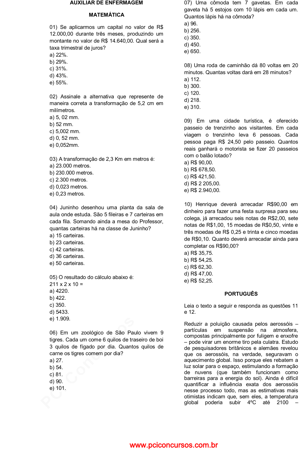pcimarkpci MDAwMDowMDAwOjAwMDA6MDAwMDowMDAwOmZmZmY6MzZlOTpjMjU5:U2F0LCAxOCBTZXAgMjAyMSAxMDoxODozNSAtMDMwMA== AUXILIAR DE ENFERMAGEM MATEMÁTICA 01) Se aplicarmos um capital no valor de R$ 12.000,00 durante três meses, produzindo um montante no valor de R$ 14.640,00. Qual será a taxa trimestral de juros? a) 22%. b) 29%. c) 31%. d) 43%. e) 55%. 02) Assinale a alternativa que represente de maneira correta a transformação de 5,2 cm em milímetros. a) 5, 02 mm. b) 52 mm. c) 5,002 mm. d) 0, 52 mm. e) 0,052mm. 03) A transformação de 2,3 Km em metros é: a) 23.000 metros. b) 230.000 metros. c) 2.300 metros. d) 0,023 metros. e) 0,23 metros. 04) Juninho desenhou uma planta da sala de aula onde estuda. São 5 fileiras e 7 carteiras em cada fila. Somando ainda a mesa do Professor, quantas carteiras há na classe de Juninho? a) 15 carteiras. b) 23 carteiras. c) 42 carteiras. d) 36 carteiras. e) 50 carteiras. 05) O resultado do cálculo abaixo é: 211 x 2 x 10 = a) 4220. b) 422. c) 350. d) 5433. e) 1.909. 06) Em um zoológico de São Paulo vivem 9 tigres. Cada um come 6 quilos de traseiro de boi 3 quilos de fígado por dia. Quantos quilos de carne os tigres comem por dia? a) 27. b) 54. c) 81. d) 90. e) 101. 07) Uma cômoda tem 7 gavetas. Em cada gaveta há 5 estojos com 10 lápis em cada um. Quantos lápis há na cômoda? a) 96. b) 256. c) 350. d) 450. e) 650. 08) Uma roda de caminhão dá 80 voltas em 20 minutos. Quantas voltas dará em 28 minutos? a) 112. b) 300. c) 120. d) 218. e) 310. 09) Em uma cidade turística, é oferecido passeio de trenzinho aos visitantes. Em cada viagem o trenzinho leva 6 pessoas. Cada pessoa paga R$ 24,50 pelo passeio. Quantos reais ganhará o motorista se fizer 20 passeios com o balão lotado? a) R$ 90,00. b) R$ 678,50. c) R$ 421,50. d) R$ 2 205,00. e) R$ 2.940,00. 10) Henrique deverá arrecadar R$90,00 em dinheiro para fazer uma festa surpresa para seu colega, já arrecadou seis notas de R$2,00, sete notas de R$1,00, 15 moedas de R$0,50, vinte e três moedas de R$ 0,25 e trinta e cinco moedas de R$0,10. Quanto deverá arrecadar ainda para completar os R$90,00? a) R$ 35,75. b) R$ 54,25. c) R$ 62,30. d) R$ 47,00. e) R$ 52,25. PORTUGUÊS Leia o texto a seguir e responda as questões 11 e 12. Reduzir a poluição causada pelos aerossóis – partículas em suspensão na atmosfera, compostas principalmente por fuligem e enxofre – pode virar um enorme tiro pela culatra. Estudo de pesquisadores britânicos e alemães revelou que os aerossóis, na verdade, seguravam o aquecimento global. Isso porque eles rebatem a luz solar para o espaço, estimulando a formação de nuvens (que também funcionam como barreiras para a energia do sol). Ainda é difícil quantificar a influência exata dos aerossóis nesse processo todo, mas as estimativas mais otimistas indicam que, sem eles, a temperatura global poderia subir 4ºC até 2100 – www.pciconcursos.com.br pcimarkpci MDAwMDowMDAwOjAwMDA6MDAwMDowMDAwOmZmZmY6MzZlOTpjMjU5:U2F0LCAxOCBTZXAgMjAyMSAxMDoxODozNSAtMDMwMA== as pessimistas falam em um aumento de até 10, o que nos colocaria “dentro” de uma churrasqueira. Como os aerossóis podem causar doenças respiratórias, o único jeito de lutar contra a alta dos termômetros é diminuir as emissões de gás carbônico, o verdadeiro vilão da história. (Superinteressante, dez. 2005, p. 16.) 11) Mediante os termos e fatos descritos no texto acima, “o verdadeiro vilão da história” descritos é (são): a) As barreiras para a energia do sol. b) O aquecimento global. c) Os aerossóis. d) As partículas em suspensão na atmosfera. e) As emissões de gás carbônico. 12) O termo em destaque no corpo do texto refere-se às: a) Estimativas. b) Partículas da atmosfera. c) Temperaturas. d) Nuvens. e) Luz solar. Leia o texto a seguir e responda as questões 13 a 20. NO DIA EM QUE O GATO FALOU Era uma vez uma dama gentil e idosa que tinha um gato siamês. Gato de raça, elegante, de ânimo cristão. Lindo gato, gato terno, amigo, pertencente a uma classe quase extinta de antigos deuses egípcios. Este gato só faltava falar. Manso e inteligente, seu olhar era humano. Mas falar não falava. E sua dona, triste, todo dia passava uma ou duas horas, repetindo sílabas e palavras para ele na esperança de que um dia aquela inteligência que via em seu olhar explodisse em sons compreensivos e claros. Mas, nada! A dama gentil e idosa era, naturalmente, incapaz de compreender o fenômeno. Tanto mais que ali mesmo à sua frente, preso a um poleiro de ferro, estava um outro ser, também animal, inferior até ao gato, pois era somente uma pobre ave, mas que falava! Falava mesmo, muito mais do que devia. Um papagaio, que falava pelas tripas do Judas. Curiosa natureza, pensava a mulher, que fazia um gato quase humano, sem fala, e um papagaio cretino, mas tagarela. E quanto mais meditava mais tempo gastava com o gato no colo, tentando métodos, repetindo sílabas, redobrando cuidados para ver se conseguia que seu miado virasse fala. Exatamente no dia 16 de maio de 1958 foi que teve a ideia genial. Quando a ideia iluminou seu cérebro, perguntou-se: “Mas, como não me ocorreu isso antes?” O papagaio viu no brilho do olhar da dona o seu terrível destino e tentou escapar, mas estava preso. Foi morto, depenado e cozinhado em menos de uma hora. Pois o raciocínio da mulher era lógico e científico: se desse ao gato o papagaio como alimentação, não era evidente que o gato começaria a falar? Não era? Veria. O gato, a princípio, não quis comer o companheiro. Temendo ver fracassado o seu experimento científico, a dama gentil e idosa procurou forçá-lo. Não conseguindo que o gato comesse o papagaio, bateu-lhe mesmo – horror! – pela primeira vez. Mas o gato se recusou. Duas horas depois, porém, vencido pela fome, aproximou-se do prato e engoliu o papagaio todo. Imediatamente subiu-lhe uma ânsia do estômago, ele olhou para a dona e, enquanto esta chorava de alegria, começou a gritar (n