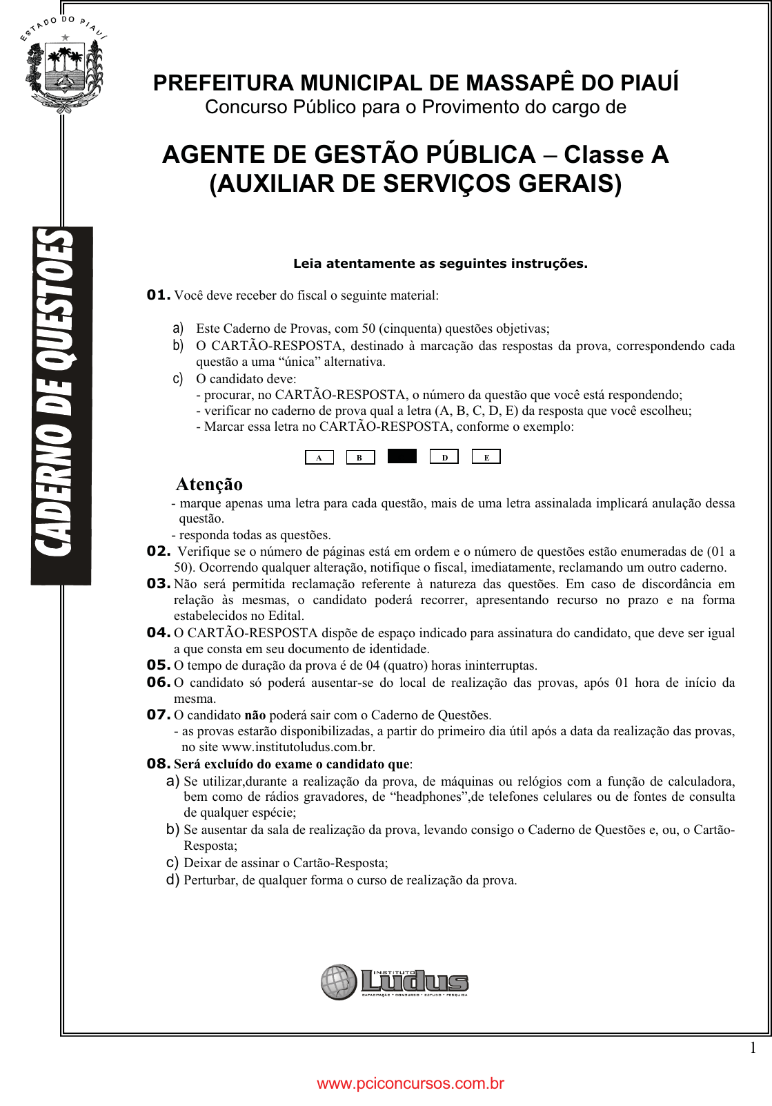 pcimarkpci MDAwMDowMDAwOjAwMDA6MDAwMDowMDAwOmZmZmY6MzZlOTpjMjU5:U2F0LCAxOCBTZXAgMjAyMSAxNDoyOToyMyAtMDMwMA== 1 Leia atentamente as seguintes instruções. 01. Você deve receber do fiscal o seguinte material: a) Este Caderno de Provas, com 50 (cinquenta) questões objetivas; b) O CARTÃO-RESPOSTA, destinado à marcação das respostas da prova, correspondendo cada questão a uma “única” alternativa. c) O candidato deve: - procurar, no CARTÃO-RESPOSTA, o número da questão que você está respondendo; - verificar no caderno de prova qual a letra (A, B, C, D, E) da resposta que você escolheu; - Marcar essa letra no CARTÃO-RESPOSTA, conforme o exemplo: Atenção - marque apenas uma letra para cada questão, mais de uma letra assinalada implicará anulação dessa questão. - responda todas as questões. 02. Verifique se o número de páginas está em ordem e o número de questões estão enumeradas de (01 a 50). Ocorrendo qualquer alteração, notifique o fiscal, imediatamente, reclamando um outro caderno. 03. Não será permitida reclamação referente à natureza das questões. Em caso de discordância em relação às mesmas, o candidato poderá recorrer, apresentando recurso no prazo e na forma estabelecidos no Edital. 04. O CARTÃO-RESPOSTA dispõe de espaço indicado para assinatura do candidato, que deve ser igual a que consta em seu documento de identidade. 05. O tempo de duração da prova é de 04 (quatro) horas ininterruptas. 06. O candidato só poderá ausentar-se do local de realização das provas, após 01 hora de início da mesma. 07. O candidato não poderá sair com o Caderno de Questões. - as provas estarão disponibilizadas, a partir do primeiro dia útil após a data da realização das provas, no site www.institutoludus.com.br. 08. Será excluído do exame o candidato que: a) Se utilizar,durante a realização da prova, de máquinas ou relógios com a função de calculadora, bem como de rádios gravadores, de “headphones”,de telefones celulares ou de fontes de consulta de qualquer espécie; b) Se ausentar da sala de realização da prova, levando consigo o Caderno de Questões e, ou, o Cartão- Resposta; c) Deixar de assinar o Cartão-Resposta; d) Perturbar, de qualquer forma o curso de realização da prova. D E A CB PREFEITURA MUNICIPAL DE MASSAPÊ DO PIAUÍ Concurso Público para o Provimento do cargo de AGENTE DE GESTÃO PÚBLICA – Classe A (AUXILIAR DE SERVIÇOS GERAIS) www.pciconcursos.com.br pcimarkpci MDAwMDowMDAwOjAwMDA6MDAwMDowMDAwOmZmZmY6MzZlOTpjMjU5:U2F0LCAxOCBTZXAgMjAyMSAxNDoyOToyMyAtMDMwMA== 2 LÍNGUA PORTUGUESA TEXTO O MESTRE E O ESCORPIÃO Um mestre do Oriente viu quando um escorpião estava se afogando e decidiu tirá-lo da água, mas, quando o fez, o escorpião o picou. Pela reação de dor, o mestre o soltou e o animal caiu novamente na água e começou a se afogar outra vez. O mestre tentou tirá-lo novamente e, de novo, o animal o picou. Alguém que estava observando se aproximou do mestre e lhe disse: - Desculpe-me, mas você é teimoso! Não entende que todas as vezes que tentar tirá-lo da água ele irá picá-lo? O mestre respondeu: - A natureza do escorpião é picar, e isto não vai mudar a minha, que é ajudar. Então, com a ajuda de uma folha, o mestre tirou o escorpião da água e salvou sua vida. Não mude sua natureza se alguém te faz algum mal; apenas tome precauções. Alguns perseguem a felicidade, outros a criam. Quando a vida te apresentar mil razões para chorar, mostre-lhe que tens mil e uma razões pelas quais sorrir. Preocupe-se mais com sua consciência do que com sua reputação. Porque sua consciência é o que você é, e sua reputação é o que os outros pensam de você. E o que os outros pensam, é problema deles. (Narrativa popular, autor desconhecido) 01. Pela leitura do texto, depreende-se que a natureza do mestre e a do escorpião são regidas, respectivamente, pela: A) fraternidade / indiferença; B) solidariedade / agressividade; C) bondade / mau-humor; D) corrupção / integridade; E) perfeição / insanidade. 02. Observe as afirmativas abaixo a respeito do sentido do texto. I. Movido por seus sentimentos, o mestre tentou duas vezes salvar o escorpião. II. Como era mestre, tinha aprendido a superar a dor e não sentiu a picada do animal. III. A natureza do escorpião não mudou a atitude do mestre. IV. O mestre, finalmente, encontrou a saída para salvar o escorpião e não ser picado de novo. Segundo o texto, estão corretas apenas as afirmativas: A) I, II, III; B) I, III, IV; C) III, IV; D) II, IV; E) I, II. 03. A frase do texto “Quando a vida te apresentar mil razões para chorar, mostre-lhe que tens mil e uma razões para sorrir”, apresenta uma lição de: A) prepotência; B) solidariedade; C) pessimismo; D) resignação; E) otimismo. 04. De acordo com o texto, “consciência” e “reputação” estão associadas, respectivamente: A) aos outros e a você; B) a você e a ninguém; C) a ninguém e aos outros; D) a você e aos outros; E) a ninguém e a você. 05. O observador que dirigiu a pergunta ao mestre é apresentado na narrativa pela palavra: A) teimoso; B) ele; C) você; D) alguém; E) lhe. 06. A palavra destacada em negrito no trecho “mostre- LHE que tens mil e uma” refere-se, no texto, à palavra: A) vida; B) felicidade; C) razões; D) consciência; E) reputação. 07. A palavra em negrito no trecho “ele IRÁ picá-lo?” é acentuada graficamente pela mesma razão que: A) baú; B) água; www.pciconcursos.com.br pcimarkpci MDAwMDowMDAwOjAwMDA6MDAwMDowMDAwOmZmZmY6MzZlOTpjMjU5:U2F0LCAxOCBTZXAgMjAyMSAxNDoyOToyMyAtMDMwMA== 3 C) pântano; D) guaraná; E) safári. 08. Assinale a alternativa na qual todas as palavras seguem a mesma regra de acentuação gráfica. A) é, têm, à. B) mínima, médicos, lógica. C) domínio, competência, aptidão. D) ascensão, lingüística, admissão. E) vocabulário, corporações, correlações. 09. Assinale a alternativa cujo grupo de vocáb