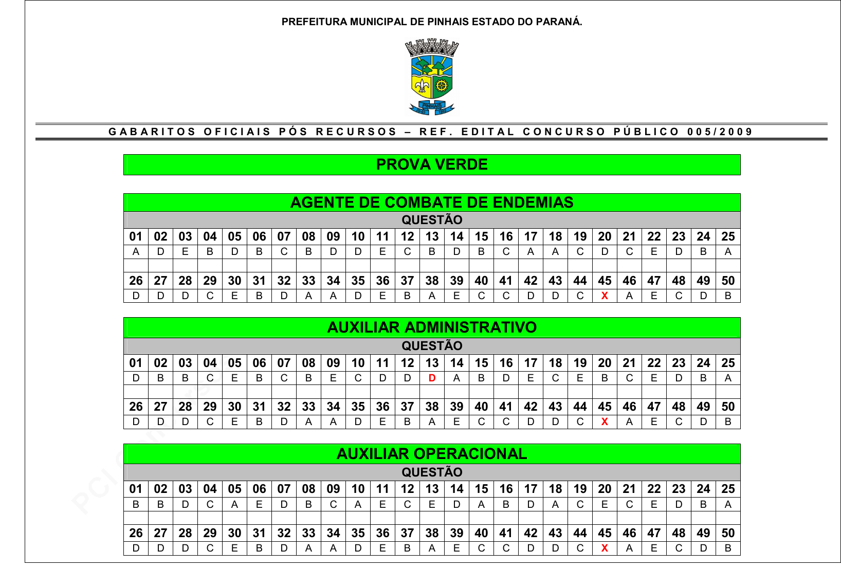 pcimarkpci MDAwMDowMDAwOjAwMDA6MDAwMDowMDAwOmZmZmY6MzZlOTpjMjU5:U2F0LCAxOCBTZXAgMjAyMSAxNjoxNzo0MyAtMDMwMA== PREFEITURA MUNICIPAL DE PINHAIS ESTADO DO PARANÁ. G A B A R I T O S O F I C I A I S P Ó S R E C U R S O S – R E F . E D I T A L C O N C U R S O P Ú B L I C O 0 0 5 / 2 0 0 9 PROVA VERDE AGENTE DE COMBATE DE ENDEMIAS QUESTÃO 01 02 03 04 05 06 07 08 09 10 11 12 13 14 15 16 17 18 19 20 21 22 23 24 25 A D E B D B C B D D E C B D B C A A C D C E D B A 26 27 28 29 30 31 32 33 34 35 36 37 38 39 40 41 42 43 44 45 46 47 48 49 50 D D D C E B D A A D E B A E C C D D C X A E C D B AUXILIAR ADMINISTRATIVO QUESTÃO 01 02 03 04 05 06 07 08 09 10 11 12 13 14 15 16 17 18 19 20 21 22 23 24 25 D B B C E B C B E C D D D A B D E C E B C E D B A 26 27 28 29 30 31 32 33 34 35 36 37 38 39 40 41 42 43 44 45 46 47 48 49 50 D D D C E B D A A D E B A E C C D D C X A E C D B AUXILIAR OPERACIONAL QUESTÃO 01 02 03 04 05 06 07 08 09 10 11 12 13 14 15 16 17 18 19 20 21 22 23 24 25 B B D C A E D B C A E C E D A B D A C E C E D B A 26 27 28 29 30 31 32 33 34 35 36 37 38 39 40 41 42 43 44 45 46 47 48 49 50 D D D C E B D A A D E B A E C C D D C X A E C D B pcimarkpci MDAwMDowMDAwOjAwMDA6MDAwMDowMDAwOmZmZmY6MzZlOTpjMjU5:U2F0LCAxOCBTZXAgMjAyMSAxNjoxNzo0MyAtMDMwMA== ELETRICISTA QUESTÃO 01 02 03 04 05 06 07 08 09 10 11 12 13 14 15 16 17 18 19 20 21 22 23 24 25 A C E B A B A E A C D C B C D E D D E B C E D B A 26 27 28 29 30 31 32 33 34 35 36 37 38 39 40 41 42 43 44 45 46 47 48 49 50 D D D C E B D A A D E B A E C C D D C X A E C D B X = QUESTÃO ANULADA. pcimarkpci MDAwMDowMDAwOjAwMDA6MDAwMDowMDAwOmZmZmY6MzZlOTpjMjU5:U2F0LCAxOCBTZXAgMjAyMSAxNjoxNzozOSAtMDMwMA== PREFEITURA MUNICIPAL DE PINHAIS ESTADO DO PARANÁ. REALIZAÇÃO R E F . E D I T A L N º 0 0 5 / 2 0 0 9 - C O N C U R S O P Ú B L I C O INSTRUÇÕES � Você está recebendo do fiscal um Caderno de Questões com 50 (cinquenta) questões numeradas sequencialmente que compõem a prova objetiva. � Você receberá, também, a Folha de Respostas personalizada para transcrever as respostas da prova objetiva. ATENÇÃO 1- É proibido folhear o Caderno de Questões antes da autorização do fiscal. 2- Após autorização, verifique se o Caderno de Questões está completo, sem falhas de impressão e se a numeração está correta. Confira também se sua prova corresponde ao cargo para o qual você se inscreveu. Caso haja qualquer divergência, comunique o fato ao fiscal imediatamente. 3- Confira seu nome completo, o número de seu documento e o número de sua inscrição na Folha de Respostas. Caso encontre alguma divergência, comunique o fato ao fiscal para as devidas providências. 4- Você deverá transcrever as respostas das questões objetivas para a Folha de Respostas, que será o único documento válido para a correção das provas. O preenchimento da Folha de Respostas é de inteira responsabilidade do candidato. 5- Leia atentamente cada questão da prova e assinale, na Folha de Respostas, a opção que a responda corretamente. 6- Assinale a cor que corresponda a sua prova na Folha de Respostas, caso o candidato não identifique a cor de sua prova, ou contenha mais de uma marcação neste campo o candidato estará automaticamente eliminado. 7- A Folha de Respostas não poderá ser dobrada, amassada, rasurada ou conter qualquer marcação fora dos campos destinados às respostas. 8- Na correção da Folha de Respostas, será atribuída nota 0 (zero) às questões não assinaladas, que contiverem mais de uma alternativa assinalada, emenda ou rasura, ainda que legível. 9- Você dispõe de 3h (três horas) para fazer a prova, incluindo a marcação da Folha de Respostas. Faça-a com tranquilidade, mas controle seu tempo. 10- Você somente poderá deixar definitivamente a sala de prova após 45 (quarenta e cinco) minutos de seu início. O candidato, ao encerrar a prova escrita objetiva, entregará ao fiscal de sua sala, a Folha de Resposta devidamente assinada e o caderno de provas, podendo reter para si, apenas o campo de marcação do seu gabarito que encontra-se no verso da capa da prova. As provas estarão disponibilizadas no site da FAFIPA (www.fafipa.org/concurso/), no primeiro dia útil subsequente a aplicação das provas. 11- Os 03 (três) últimos candidatos da sala só poderão sair juntos, após a conferência de todos os documentos da sala e assinatura da ata. 12- Durante a prova, não será permitida qualquer espécie de consulta ou comunicação entre os candidatos, nem a utilização de livros, códigos, manuais, impressos ou anotações, calculadoras, relógios, agendas eletrônicas, pagers, telefones celulares, BIP, Walkman, gravador ou qualquer outro equipamento eletrônico. A utilização desses objetos causará eliminação imediata do candidato. 13- Os objetos de uso pessoal, incluindo telefones celulares, deverão ser desligados e mantidos dessa forma até o término da prova e entrega da Folha de Respostas ao fiscal. 14- Qualquer tentativa de fraude, se descoberta, implicará em imediata denúncia à autoridade competente, que tomará as medidas cabíveis, inclusive com prisão em flagrante dos envolvidos. ED15 www.pciconcursos.com.br pcimarkpci MDAwMDowMDAwOjAwMDA6MDAwMDowMDAwOmZmZmY6MzZlOTpjMjU5:U2F0LCAxOCBTZXAgMjAyMSAxNjoxNzozOSAtMDMwMA== FOLHA PARA ANOTAÇÃO DAS RESPOSTAS DO CANDIDATO QUESTÃO 1 2 3 4 5 6 7 8 9 10 11 12 13 14 15 16 17 18 19 20 21 22 23 24 25 RESP. QUESTÃO 26 27 28 29 30 31 32 33 34 35 36 37 38 39 40 41 42 43 44 45 46 47 48 49 50 RESP. www.pciconcursos.com.br pcimarkpci MDAwMDowMDAwOjAwMDA6MDAwMDowMDAwOmZmZmY6MzZlOTpjMjU5:U2F0LCAxOCBTZXAgMjAyMSAxNjoxNzozOSAtMDMwMA== AUXILIAR OPERACIONAL 3 C O N H E C I M E N T O S E S P E C Í F I C O S Questão 01 Nas instalações residenciais, os condutores vivos dos circuitos terminais deverão ter seções iguais ou superiores à (A) aparelho de iluminação = 3,5 mm² (B) aparelho de iluminação = 1,5 mm² (C) aparelho de iluminação = 3,0 mm² (D) aparelho de ilumina