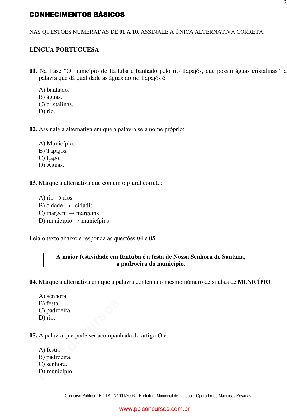 pcimarkpci MDAwMDowMDAwOjAwMDA6MDAwMDowMDAwOmZmZmY6MzZlOTpjMjU5:U2F0LCAxOCBTZXAgMjAyMSAyMTo1NToxMiAtMDMwMA== Concurso Público – EDITAL Nº 001/2006 – Prefeitura Municipal de Itaituba – Operador de Máquinas Pesadas 2 CONHECIMENTOS BÁSICOSCONHECIMENTOS BÁSICOSCONHECIMENTOS BÁSICOSCONHECIMENTOS BÁSICOS NAS QUESTÕES NUMERADAS DE 01 A 10, ASSINALE A ÚNICA ALTERNATIVA CORRETA. LÍNGUA PORTUGUESA 01. Na frase “O município de Itaituba é banhado pelo rio Tapajós, que possui águas cristalinas”, a palavra que dá qualidade às águas do rio Tapajós é: A) banhado. B) águas. C) cristalinas. D) rio. 02. Assinale a alternativa em que a palavra seja nome próprio: A) Município. B) Tapajós. C) Lago. D) Águas. 03. Marque a alternativa que contém o plural correto: A) rio → rios B) cidade → cidadis C) margem → margems D) município → municípius Leia o texto abaixo e responda as questões 04 e 05. A maior festividade em Itaituba é a festa de Nossa Senhora de Santana, a padroeira do município. 04. Marque a alternativa em que a palavra contenha o mesmo número de sílabas de MUNICÍPIO. A) senhora. B) festa. C) padroeira. D) rio. 05. A palavra que pode ser acompanhada do artigo O é: A) festa. B) padroeira. C) senhora. D) município. www.pciconcursos.com.br pcimarkpci MDAwMDowMDAwOjAwMDA6MDAwMDowMDAwOmZmZmY6MzZlOTpjMjU5:U2F0LCAxOCBTZXAgMjAyMSAyMTo1NToxMiAtMDMwMA== Concurso Público – EDITAL Nº 001/2006 – Prefeitura Municipal de Itaituba – Operador de Máquinas Pesadas 3 MATEMÁTICA 06. Rita foi ao supermercado e comprou 1 litro de óleo, meio quilo de farinha e 1 kg de feijão por R$ 5,20. Deu para pagamento uma cédula de R$ 10,00. Seu troco foi de: A) R$ 4,80 B) R$ 5,80 C) R$ 4,30 D) R$ 4,20 07. Dona Maria foi à feira e comprou 1 kg de carne de segunda por R$ 2,60 e 1 kg de arroz por R$ 1,40. O valor de sua compra foi: A) R$ 3,80 B) R$ 5,00 C) R$ 4,00 D) R$ 3,90 08. Itaituba está distante de Belém 898 Km. O algarismo da ordem da dezena é: A) menor que 8. B) menor que 9. C) par. D) ímpar. 09. Na primeira quinzena de julho comemora-se a Festa de Nossa Senhora de Santana, em Itaituba. O termo quinzena refere-se a um conjunto de: A) 15 semanas. B) 15 dias. C) 15 horas. D) 15 minutos. 10. A população do município de Itaituba é de aproximadamente 97.630 habitantes. A escrita correta deste numeral é: A) noventa e seis mil, setecentos e trinta. B) novecentos e setenta e seis mil e trinta. C) nove milhões, setecentos e sessenta e três mil. D) noventa e sete mil, seiscentos e trinta. www.pciconcursos.com.br pcimarkpci MDAwMDowMDAwOjAwMDA6MDAwMDowMDAwOmZmZmY6MzZlOTpjMjU5:U2F0LCAxOCBTZXAgMjAyMSAyMTo1NToxMiAtMDMwMA== Concurso Público – EDITAL Nº 001/2006 – Prefeitura Municipal de Itaituba – Operador de Máquinas Pesadas 4 CCCCONHECIMENTOS ONHECIMENTOS ONHECIMENTOS ONHECIMENTOS ESPECÍFIESPECÍFIESPECÍFIESPECÍFICOSCOSCOSCOS NAS QUESTÕES NUMERADAS DE 11 A 20, ASSINALE A ÚNICA ALTERNATIVA CORRETA. 11. Qual a importância da “Manutenção Preventiva” em máquinas pesadas? A) Evitar uma sobre-carga sobre as peças das máquinas. B) Facilitar ao operador o desempenho da máquina. C) Proporcionar maior vida útil ao equipamento. D) Manter um equilíbrio entre a máquina e a capacidade de carga. 12. Quais dos itens, abaixo, são aplicados durante uma “Manutenção Preventiva”? A) Regulagem de válvulas, limpeza no filtro de ar e calibragem de pneus. B) Troca do filtro de óleo lubrificante, filtro de combustível e filtro de ar. C) Troca da água do radiador, troca do óleo de freio e troca das mangueiras hidráulicas. D) Reaberto geral no cabeçote, regulagem de válvulas e regulagem da embreagem. 13. O sistema de freio a disco aplicado nas máquinas pesadas, é acionado: A) Eletronicamente. B) Mecanicamente. C) Fisicamente. D) Hidraulicamente. 14. Qual dos sistemas, abaixo, é responsável em comandar a direção da máquina? A) Hidráulico. B) Multidirecional. C) de Direção Defensiva. D) Mecatrônico. 15. A “Caixa de Mudança” tem como principal função transmitir os movimentos do (a): A) motor para as rodas. B) cardam para as rodas. C) cruzeta para as rodas. D) caixa de marcha para as rodas. 16. Qual a máquina pesada que é usada para serviços em desmatamento? A) Valetadeira. B) Desmatadeira. C) Escavadeira. D) Trator de esteira. www.pciconcursos.com.br pcimarkpci MDAwMDowMDAwOjAwMDA6MDAwMDowMDAwOmZmZmY6MzZlOTpjMjU5:U2F0LCAxOCBTZXAgMjAyMSAyMTo1NToxMiAtMDMwMA== Concurso Público – EDITAL Nº 001/2006 – Prefeitura Municipal de Itaituba – Operador de Máquinas Pesadas 5 17. Qual a máquina pesada que é usada, exclusivamente, em terraplenagem ? A) Motoniveladora. B) Escavadeira. C) Valetadeira. D) Carregadeira de rodas. 18. Qual a máquina pesada que é usada para serviços de deslocamento de aterro? A) Escavadeira. B) Rolo compactador. C) Motoescreiper. D) Valetadeira. 19. Quais os Equipamentos de Proteção Individual (EPI’s) usados pelo Operador de Máquinas Pesadas? A) Capacete, luva, bota e abafador. B) Bota, luva, avental e viseira. C) Bota, abafador, luva e avental. D) Bota, luva, máscara e abafador. 20. Se a correia do motor estiver, extremamente, folgada, o motor apresentará qual problema? A) Vazamento de óleo. B) Falhamento na bomba injetora. C) Super aquecimento. D) Parada imediata. www.pciconcursos.com.br pcimarkpci MDAwMDowMDAwOjAwMDA6MDAwMDowMDAwOmZmZmY6MzZlOTpjMjU5:U2F0LCAxOCBTZXAgMjAyMSAyMTo1NToxNyAtMDMwMA== G A B A R I T O CÓD. 80 AGENTE DE PORTARIA Nº DA QUESTÃO ALTERNATIVA CORRETA 01 C 02 B 03 A 04 C 05 D 06 A 07 C 08 D 09 B 10 D 11 C 12 A 13 B 14 D 15 A 16 C 17 D 18 C 19 A 20 B http://www.unama.br/concurso_publico/provas_gabaritos/gabarito_itai... 1 de 1 09/10/2012 08:00 www.pciconcursos.com.br pcimarkpci MDAwMDowMDAwOjAwMDA6MDAwMDowMDAwOmZmZmY6MzZlOTpjMjU5:U2F0LCAxOCBTZXAgMjAyMSAyMTo1NToxNyAtMDMwMA== G A B A R I T O CÓD. 77 AUXILIAR ADMINISTRATIVO Nº DA QUESTÃO ALTERNATIVA CORRETA 01 C 02 B 03 C 04 D 05 