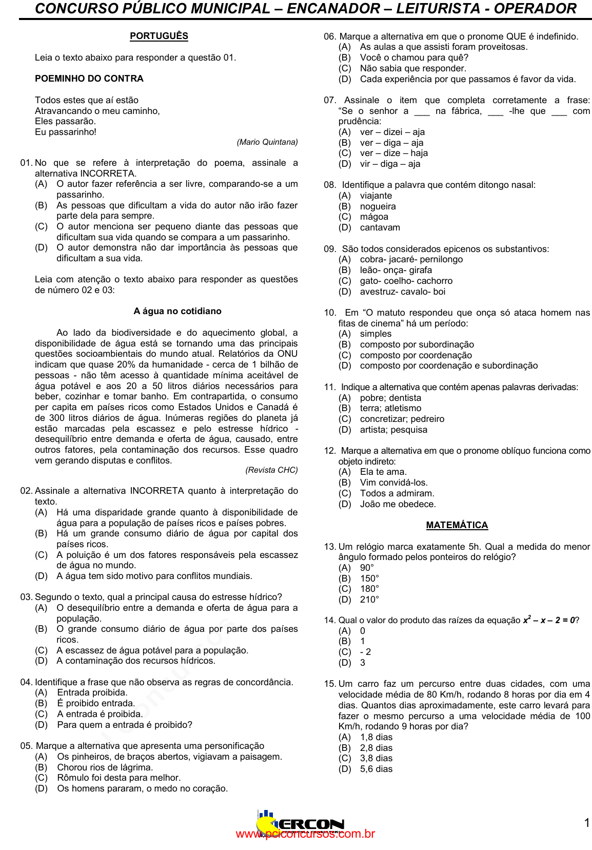 CONCURSO PÚBLICO MUNICIPAL – ENCANADOR – LEITURISTA - OPERADOR