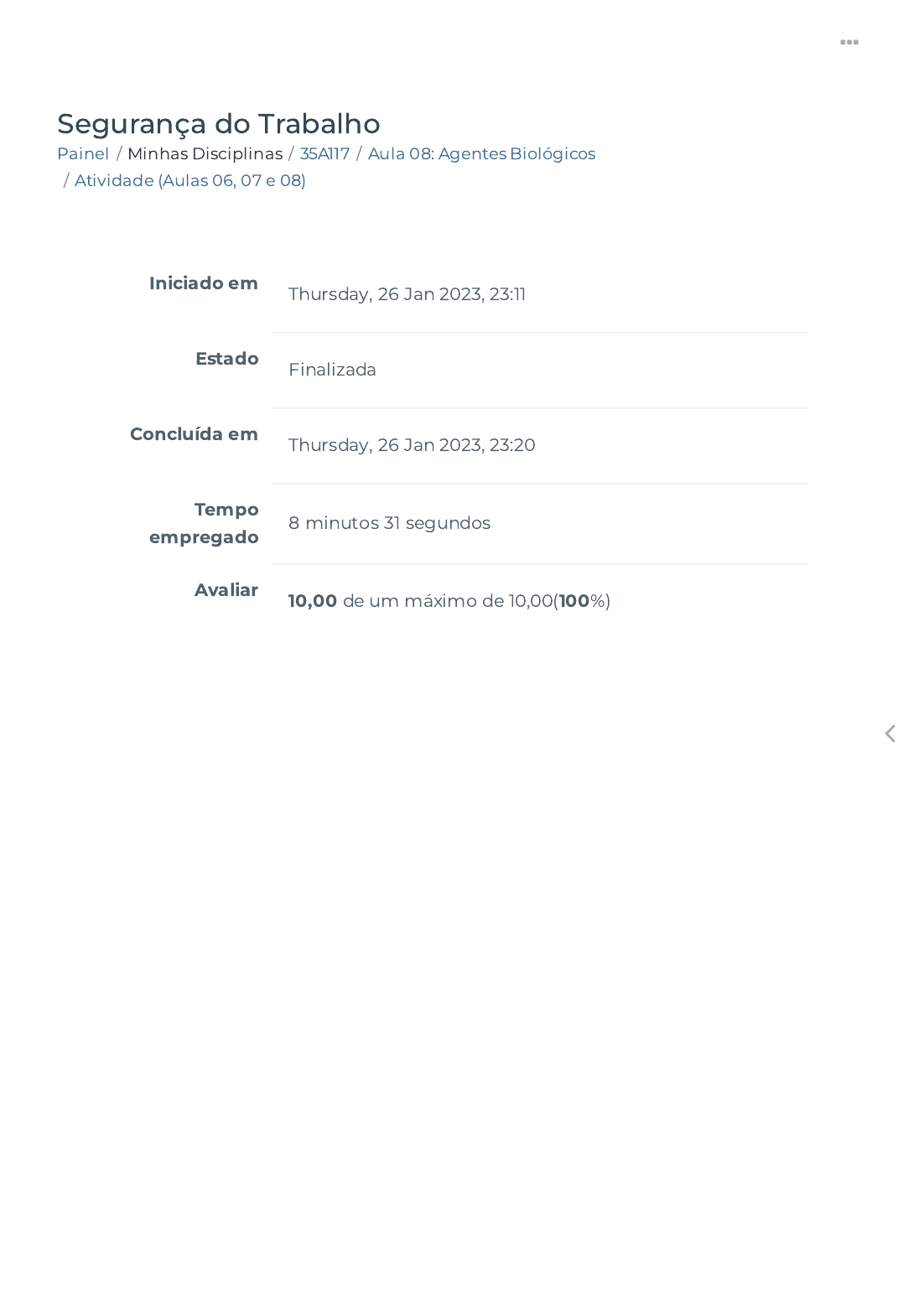 26/01/2023 23:20 Atividade (Aulas 06, 07 e 08) https://ava.politecnicabr.com.br/mod/quiz/review.php?attempt=4268713 1/12 Painel / Minhas Disciplinas / 35A117 / Aula 08: Agentes Biológicos / Atividade (Aulas 06, 07 e 08) Segurança do Trabalho Iniciado em Thursday, 26 Jan 2023, 23:11 Estado Finalizada Concluída em Thursday, 26 Jan 2023, 23:20 Tempo empregado 8 minutos 31 segundos Avaliar 10,00 de um máximo de 10,00(100%) https://ava.politecnicabr.com.br/my/ https://ava.politecnicabr.com.br/course/view.php?id=1039 https://ava.politecnicabr.com.br/course/view.php?id=1039#section-10 https://ava.politecnicabr.com.br/mod/quiz/view.php?id=25513 https://ava.politecnicabr.com.br/ 26/01/2023 23:20 Atividade (Aulas 06, 07 e 08) https://ava.politecnicabr.com.br/mod/quiz/review.php?attempt=4268713 2/12 Questão 1 Correto Atingiu 1,00 de 1,00 Marque (V) Verdadeiro ou (F) Falso: Se o colaborador não estiver usando os EPIs adequados, poderá sofrer de hipotermia. Nosso corpo tem um termômetro regulador, que é a homeostase. Vejamos algo interessante quando está frio: nosso corpo começa a tremer involuntariamente se não estivermos agasalhados, esse fenômeno do “bater dos ossos” é uma forma de regular a temperatura interna do nosso corpo. ( ) a hipotermia ocorre quando a temperatura corpórea chega a 35°C, estágio no qual podem ocorrer alguns sintomas, como fraqueza muscular e adormecimento, percepção reduzida, e, se nenhuma providência for tomada, pode ser fatal. Escolha uma opção: Verdadeiro Falso https://ava.politecnicabr.com.br/ 26/01/2023 23:20 Atividade (Aulas 06, 07 e 08) https://ava.politecnicabr.com.br/mod/quiz/review.php?attempt=4268713 3/12 Questão 2 Correto Atingiu 1,00 de 1,00 Marque a alternativa correta quanto a Classe dos Riscos Biológicos. Escolha uma opção: a. Classe de risco 1: risco moderado para o trabalhador e baixa probabilidade de disseminação para a coletividade. b. Classe de risco 2: risco potencial para o trabalhador e probabilidade elevada de disseminação para a coletividade. Apresenta grande poder de transmissibilidade de um trabalhador a outro. c. Classe de risco 3: risco elevado para o trabalhador e probabilidade de disseminação para a coletividade. Pode causar doenças e infecções graves ao ser humano, para as quais nem sempre existem meios e�cazes de pro�laxia. d. Todas as alternativas estão corretas. e. Classe de risco 4: baixo risco para o trabalhador e para a coletividade, com baixa probabilidade de causar doenças ao ser humano. https://ava.politecnicabr.com.br/ 26/01/2023 23:20 Atividade (Aulas 06, 07 e 08) https://ava.politecnicabr.com.br/mod/quiz/review.php?attempt=4268713 4/12 Questão 3 Correto Atingiu 1,00 de 1,00 CLT - Decreto-Lei nº 5.452, de 1º de maio de 1943. Aprova a Consolidação das Leis do Trabalho em seu art. 253, marque a alternativa correta. Escolha uma opção: a. Para os empregados que trabalham no interior das câmaras frigorí�cas e para os que movimentam mercadorias do ambiente quente ou normal para o frio e vice-versa, depois de 1 (uma) hora e 40 (quarenta) minutos de trabalho contínuo, será assegurado um período de 30 (trinta) minutos de repouso, computado esse intervalo como de trabalho efetivo. b. Para os empregados que trabalham no interior das câmaras frigorí�cas e para os que movimentam mercadorias do ambiente quente ou normal para o frio e vice-versa, depois de 1 (uma) hora e 50 (cinquenta) minutos de trabalho contínuo, será assegurado um período de 20 (vinte) minutos de repouso, computado esse intervalo como de trabalho efetivo. c. Todas as alternativas estão incorretas. d. Para os empregados que trabalham no interior das câmaras frigorí�cas e para os que movimentam mercadorias do ambiente quente ou normal para o frio e vice-versa, depois de 2 (duas) horas e 40 (quarenta) minutos de trabalho contínuo, será assegurado um período de 20 (vinte) minutos de repouso, computado esse intervalo como de trabalho efetivo. https://ava.politecnicabr.com.br/ 26/01/2023 23:20 Atividade (Aulas 06, 07 e 08) https://ava.politecnicabr.com.br/mod/quiz/review.php?attempt=4268713 5/12 Questão 4 Correto Atingiu 1,00 de 1,00 Assinale (V) Verdadeiro ou (F) Falso, referente a exposição aos agentes ambientais. ( ) Todo agente químico pode reagir de forma instantânea e volátil e gerar no ambiente uma concentração que, sendo absorvida pelo organismo do trabalhador, irá provocar danos se acima dos limites de tolerância. ( ) Agentes químicos podem ser encontrados apenas nas formas liquida ou gasosa. ( ) Todo produto químico tem uma �cha que é controlada pela Associação Brasileira da Indústria Química (ABIQUIM) e leva o nome de Ficha de Informação de Segurança do Produto Químico (FISPQ). Com ela você pode consultar todos os parâmetros relativos ao produto desejado. ( ) Uma patologia muito comum em época de frio é denominada pelos dermatologistas como eritema pérnio ou perniose - vermelhidão das mãos e pés acompanhada de coceira e ardor cutâneos. Escolha uma opção: a. F, V, V, V. b. V, V, F, F. c. V, F, F, V. d. F, V, F, V. e. V, F, V, V. https://ava.politecnicabr.com.br/ 26/01/2023 23:20 Atividade (Aulas 06, 07 e 08) https://ava.politecnicabr.com.br/mod/quiz/review.php?attempt=4268713 6/12 Questão 5 Correto Atingiu 1,00 de 1,00 Assinale (V) Verdadeiro ou (F) Falso, referente a exposição ao calor. ( ) Com relação a epiderme, a corrente sanguínea contribui para promover a passagem de calor entre as células, com isso pode ocorrer a perda perspiração ou a retenção de carlor. ( ) Sobre a �siologia humana, a referência de temperatura corpórea do homem é de 36 °C a 37 °C, não podendo suportar temperaturas ambientais acima de 40 °C, em que já se torna insuportável e o corpo não consegue amenizar o calor fazendo a troca com o ambiente, pois a evaporação não é realizada adequadamente e seu bem-estar �ca comprometido. Escolha uma opção: a. V, V. b. F, V. c