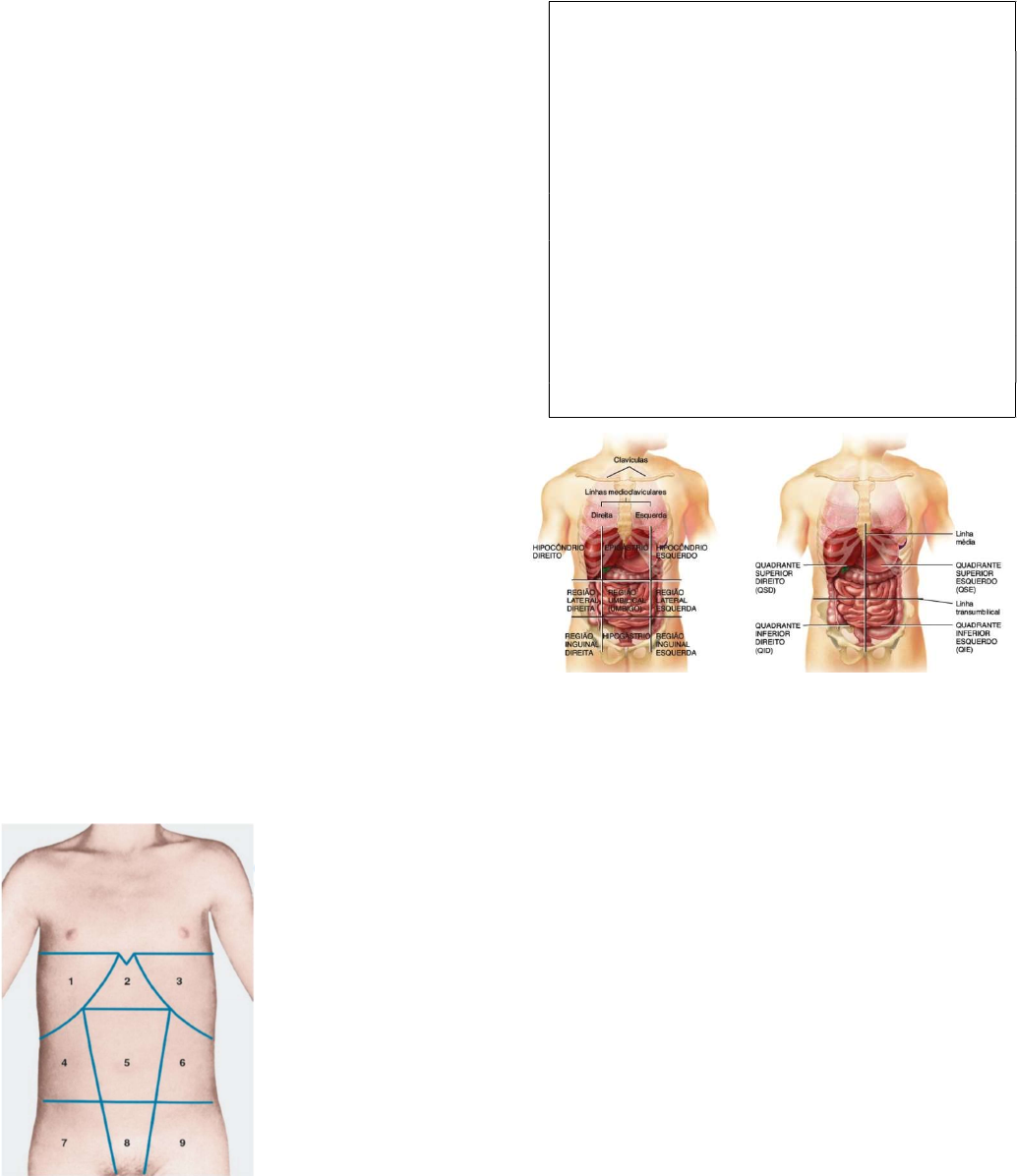 HP2: habilidades profissionais 2 Clínica e comunicação: Semiologia do abdômen: regras básicas: conforto segurança e respeito cooperação e relaxamento muscular porque se estiver contraído só vai conseguir apalpar a musculatura sala aquecida porque o frio deixa a musculatura rígida, com privacidade iluminação para inspecção a cama não pode ser rígida e nem fria as mãos devem estar aquecidas e higienizadas Cabeceiras com 15° de elevação porque se tiver reta você não vai conseguir hiper estender e se estiver muito elevada não acha os órgãos decúbito dorsal exceto para a palpação do baço que vai usar decúbito lateral esquerdo expor somente a região abdominal que será feita inspeção no momento divisões do abdômen: pode ser em 4 quadrantes ou em 9 quadrantes. a primeira de visão delimita as regiões de quadrante superior direito esquerdo e quadrante inferior direito esquerdo. já a segunda de limite em: 1. Hipocôndrio direito 2. Epigástrico 3. hipocôndrio esquerdo 4. flanco direito 5. região umbilical 6. flanco esquerdo 7. fossa ilíaca direita 8. hipogástrico 9. fossa ilíaca esquerda Inspeção: são observadas forma, volume e alterações cutâneas do abdome (circulação colateral -> ver veia por causa de cirrose que aumenta a pressão da veia porta, hematomas, nodulação, cicatrizes etc. Forma: normal (simétrico e levemente abaulado), globoso (panículo adiposo líquido ascético -> líquido na cavidade abdominal por causa da baixa de albumina e aumento da pressão porta hepática), escavado (emagrecimento ou síndrome compulsiva) e pendular (gravidez). Inspeção cutânea: Lesões cutâneas: Sinal de Cullen: equimose periumbilical, resultante de hemorragia retroperitoneal. pode surgir na pancreatite aguda e na ruptura de gravidez ectópica sinal de Gray-Turner: equimose dos flancos. pode ocorrer na pancreatite necro- hemorrágica e indica grave comprometimento da víscera Abaulamento ou retrações localizadas: abdômen assimétrico e irregular, deve-se analisar a localização e ter em mente a projeção das vísceras na parede abdominal. demonstram que o peritônio parietal (aponeurose) está enfraquecido na parte central. a diástase dos músculos retos anteriores pode ser percebida quando o paciente está em decúbito dorsal e então pedisse para que ele contrai a musculatura abdominal elevando as 2 pernas estendidas ou levantando do Travesseiro à cabeça sem mover o tórax. é muito comum ocorrerem obesos, gestantes, em caso de desnutrição ou de idosos (sarcopenia) Movimentos: podem ser encontrados 3 tipos Movimentos respiratórios Pulsações: (não normal) podem ser observadas e palpadas no abdômen de pessoas magras e refletem as pulsações da aorta abdominal. os aneurismas da aorta abdominal provocam pulsações na área correspondente à dilatação movimentos peristálticos visíveis: podem ser visto em pessoas muito magras mas normalmente indicam obstrução em alguns segmentos do tubo digestivo ausculta: deve ser o primeiro elemento a ser avaliado após a inspeção, porque a palpação ou a percussão do abdômen pode alterar os movimentos peristálticos. deve ser realizada nos 4 quadrantes de forma superficial para avaliar os ruídos hidroaéreos, e para avaliar alterações do fluxo aórtico aprofunda se o estetoscópio ao longo do trajeto da aorta. As principais alterações a serem pesquisadas na ausculta são a presença de ruídos hidroaéreos (líquidos e gases contidos no trato gastrointestinal -frequência de 5 a 35 por minuto) e sopros (sugerem aneurismas e compreensões da artéria - pode ocorrer por má formação ou inflamação causada principalmente pelo tabagismo obesidade diabetes. Percussão: pode-se observar sons de timpanismo, hiper timpanismo, sub maciez e maciez. Timpânico: indica a presença de ar dentro de uma víscera oca. em condições normais é percebida em quase todo o abdômen, porém mais nítidos na área de projeção do fundo do estômago. espaço de traube se estiver, maciço isso é indicativo de esplenomegalia (baço aumentado ou rompido). Maciço: a ausência de ar pode ser observada nas áreas de projeção do fígado, baixo e útero gravídico, além de casos de ascite, os tumores e cistos contendo líquido. a percussão do abdômen tem por objetivo a determinação do limite superior do fígado e da área de maciez hepática, que servem para a pesquisa de ascite e a avaliação da sonoridade do abdome. Hepatimetria normal: dei início obtém-se som Claro pulmonar e em condições normais na altura do quinto ou sexto espaço intercostal observa-se som sub mas isso correspondendo ao limite superior do fígado, se estiver muito aumentado vai estar muito próximo do mamilo. exame do piparote: pesquisa de ascite de médio volume, quando o sinal de piparote é negativo torna-se necessário utilizar outra técnica denominada pesquisa de macicez móvel semicírculo de Skoda Sinal de Giordano: punho percussão das lojas renais, se o paciente sentir dor é positivo e pode indicar pielonefrite aguda (inflamação do rim ou cistite do trato urinário inferior) sinal de Jobert: percussão do hipocôndrio direito com detecção de timpanismo indicativo de pneumoperitônio (ar na cavidade abdominal) Palpação: é feita em decúbito dorsal (lateral- baço), inicialmente deve-se distrair o paciente, cuidar com as unhas, esquentar a mão, iniciar pelas áreas menos doloridas, se colocar a direita do paciente (padrão pela maioria ser destro) e usar uma ou duas mãos. Seu objetivo é avaliar o estado da parede abdominal, explorar a sensibilidade (provocando ou exacerbando uma dor relatada pelo paciente), reconhecer as condições anatômicas das vísceras e detectar alterações de sua consistência. Em condições normais, não se consegue distinguir pela palpação todos os órgãos intra-abdominais. Nas pessoas magras, se a parede abdominal estiver bem relaxada é possível reconhecer o fígado, o r