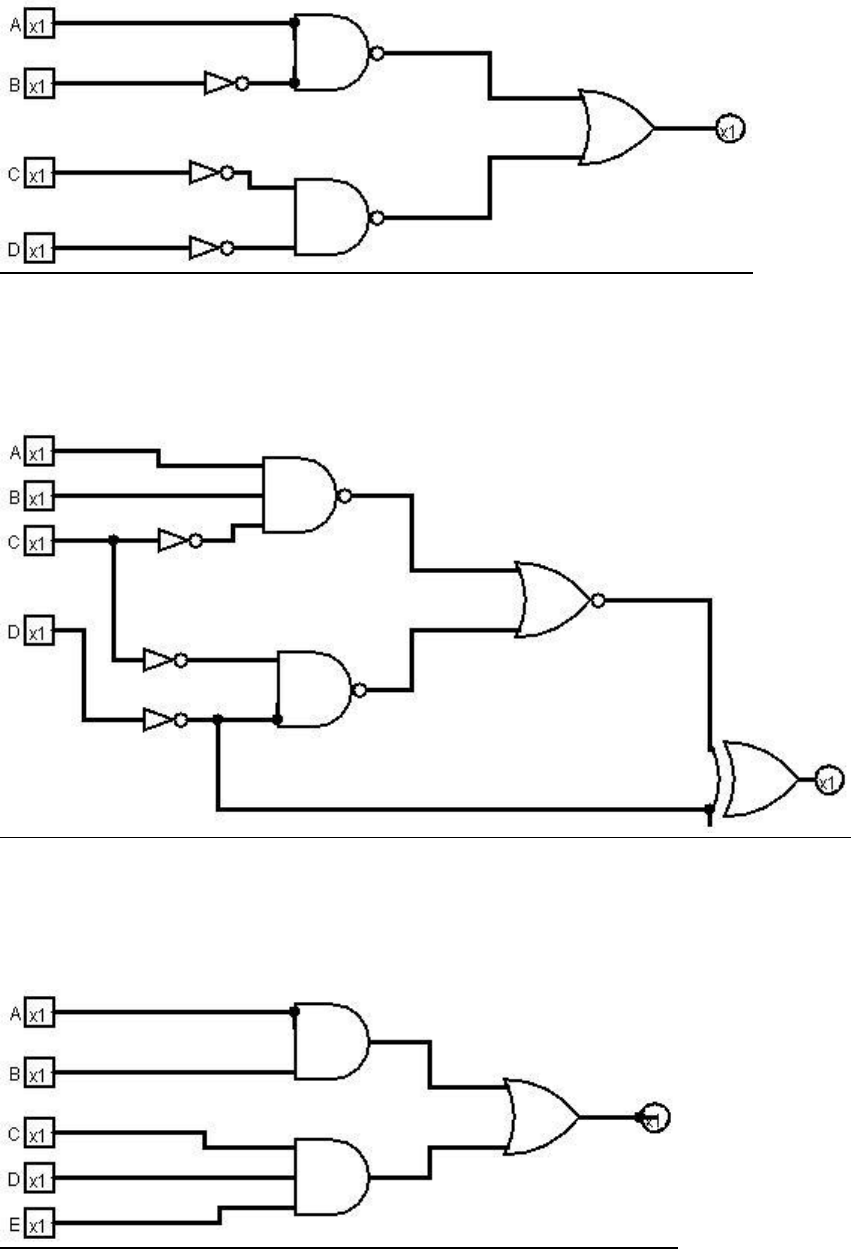1. Desenhe os circuitos que implementam as seguintes expressões booleanas. A) S = 𝐴�̅� + 𝐶𝐷̅̅ ̅̅̅̅ ̅̅ ̅̅ ̅̅ ̅̅ ̅̅ ̅ B) (𝐴𝐵𝐶̅ + 𝐶𝐷̅̅ ̅̅ ) ⊕ 𝐷̅̅ ̅̅ ̅̅ ̅̅ ̅̅ ̅̅ ̅̅ ̅̅ ̅̅ ̅̅ ̅̅ ̅̅ ̅ C) S = A B + (CD E) d) S = A + (B + C D)(B + A) 2°)Escreva a expressão booleana executada pelos circuitos abaixo. a) A B + C b) (A + A B) + C D c) (A B + C)+ D 3°)Desenvolva a tabela da verdade para as seguintes expressões. a) ABC + ABC A B C ABC ABC` S 0 0 0 0 0 1 0 0 1 0 1 1 0 1 0 0 1 1 0 1 1 0 1 1 1 0 0 0 1 1 1 0 1 0 1 1 1 1 0 0 1 1 1 1 1 1 0 1 b) A (C + B +D) A B C D A (C` + B D`) S 0 0 0 0 0 1 0 0 0 0 1 0 1 0 0 0 1 0 0 1 0 0 0 1 1 0 0 0 0 1 0 0 0 1 0 0 1 0 1 0 1 0 0 1 1 0 0 1 0 0 1 1 1 0 1 0 1 0 0 0 1 1 1 1 0 0 1 1 1 1 1 0 1 0 1 1 1 1 0 1 1 1 0 0 1 1 0 0 1 1 1 1 1 0 1 1 1 1 1 1 1 1 1 1 1 Aluno: Marcos Taylon Custodio Praia