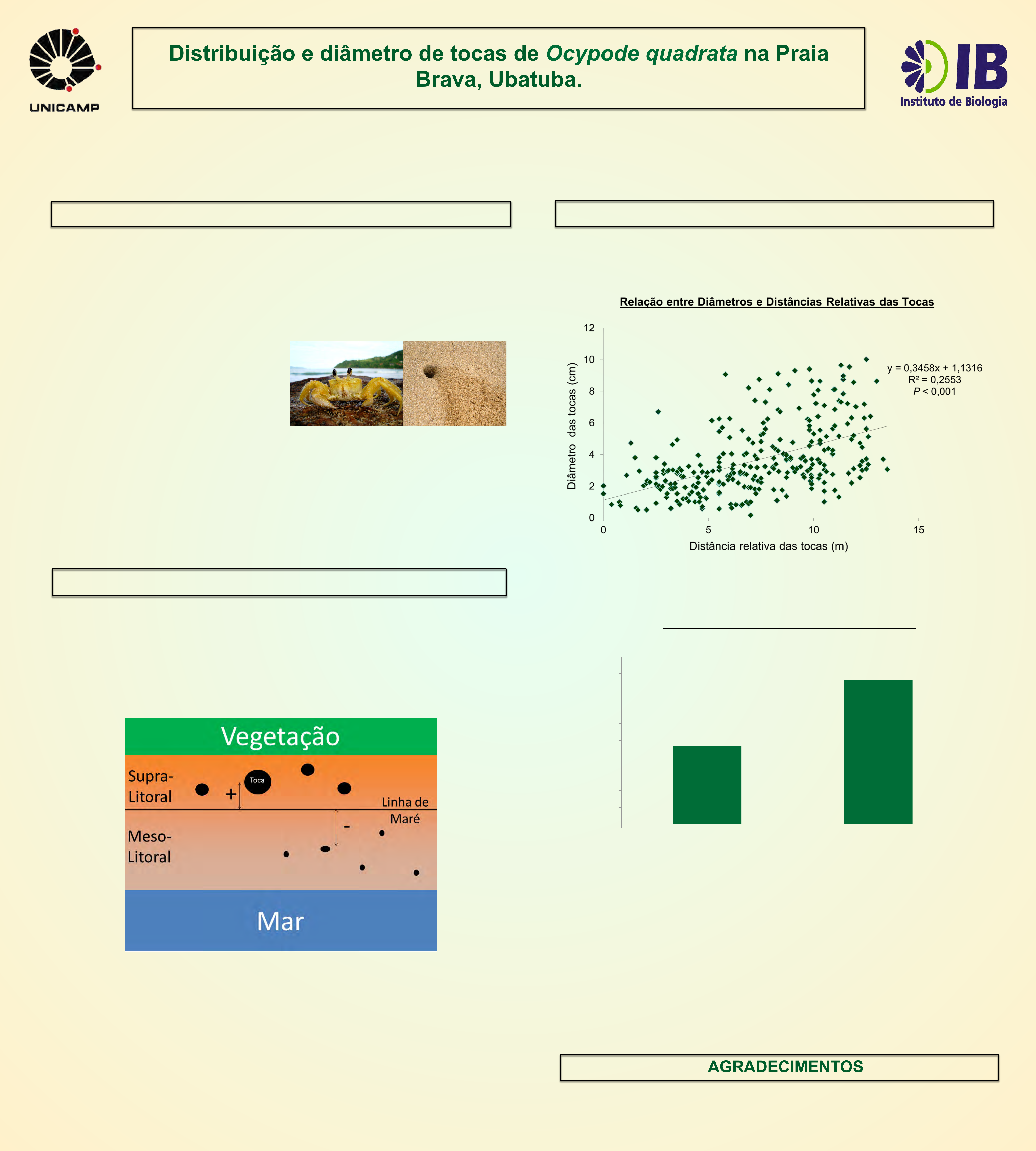 Distribuição e diâmetro de tocas de Ocypode quadrata na Praia Brava, Ubatuba. Hirata, M. Y.¹; Netto, P. H. M.¹; Oliveira, P. P. T.¹; Pfundstein, S. D.¹; Zuccoli, G.¹; Vieira, E. A.¹, 2 As diferentes linhas de maré e seus alcances máximos na praia determinam três regiões distintas: o infra-litoral, sempre inundada e raramente exposta; o meso-litoral, região entre-marés; e supra-litoral, raramente coberto pela água. Cada uma dessas regiões apresenta diferentes graus de compactação e disponibilidade de nutrientes. Estes fatores influenciam na distribuição espacial de seres que lá vivem. ÁREA DE ESTUDOS – A coleta de dados foi feita na Praia Brava de Ubatuba (23.509494 S 45.1734210 W), praia reflexiva, o que facilita a ocorrência de Ocypode quadrata, devido ao sedimento grosseiro e pouco compactado. COLETA DE DADOS – Medimos a distância da toca em relação à linha de maré, e seu diâmetro correspondente com um paquímetro. INTRODUÇÃO Ocypode quadrata MATERIAL E MÉTODOS RESULTADOS E DISCUSSÃO AGRADECIMENTOS • Ao Instituto de Biologia, professores e orientadores. ¹Curso de Graduação em Ciências Biológicas, Instituto de Biologia, UNICAMP. ²Departamento de Biologia Animal, IB, UNICAMP CP 6109, CEP 13083-970, Campinas, SP, Brasil. E-mail para contato: edinhovieira05@gmail.com; pedrotrevis@gmail.com O decápode Ocypode quadrata, popularmente conhecido como “maria- farinha”, habita ambientes como este, alimentando-se de detritos trazidos pelo mar, cavando tocas de diferentes d iâmet ros , co r responden tes a indivíduos de diferentes idades, ao longo da faixa de areia. Com isso, nosso objetivo foi verificar se existe relação entre o diâmetro da toca e a sua distância em relação ao mar, esperando que indivíduos mais jovens (tocas de diâmetros menores) estão mais próximos ao mar, devido à necessidade de ambientes mais úmidos, e indivíduos adultos, mais resistentes à dessecação, tendem a fazer tocas mais próximas à restinga, devido à maior disponibilidade de detritos. 0 0,5 1 1,5 2 2,5 3 3,5 4 4,5 5 Meso Supra Diâmetros das Tocas em Meso e Supra-Litoral D iâ m et ro (c m ) Dentre as 287 tocas encontradas, verificamos que quanto maior a distância, maiores as tocas, conforme linha de tendência indicando influência de aproximadamente 25% da distância no diâmetro. A hipótese foi confirmada, indicando relação entre a distância relativa ao mar e o diâmetro das tocas, o que pode ocorrer devido à necessidade de evitar desidratação. Desse modo, os mais jovens, que são mais susceptíveis à desidratação, tendem a fazer tocas na região de meso- litoral – fato evidenciado pelo diâmetro das tocas –, e alimentam-se de detritos trazidos pelo mar. Conforme os indivíduos crescem e desenvolvem, buscam detritos mais próximos à restinga, pois necessitam de mais energia, e fazem suas tocas (de maior diâmetro) na região do supra-litoral. Há a ressalva de que a relação, mesmo existindo e confirmando a hipótese, não foi alta. Provavelmente há indivíduos em transição da fase jovem para a fase adulta, e estes fazem tocas de diâmetros variados em ambas as regiões. Para tocas abaixo da linha da maré atribuímos valores negativos, e acima da linha, valores positivos, a fim de relativizar as distâncias. Posteriormente, a toca mais distante da linha da maré e mais próxima do mar foi dada como ponto zero. A área total coberta foi de aproximadamente 2000 m². ANÁLISE DE DADOS – Os dados de distâncias relativas foram correlacionadas com e diâmetros por uma regressão linear simples e os diâmetros médios foram comparados através de um teste Mann-Whitney. Esquema da obtenção de dados Adicionalmente, observamos que o diâmetro médio das tocas de supra-litoral é significativamente maior que aquele das tocas em meso- litoral (U = 4200; p < 0,001).