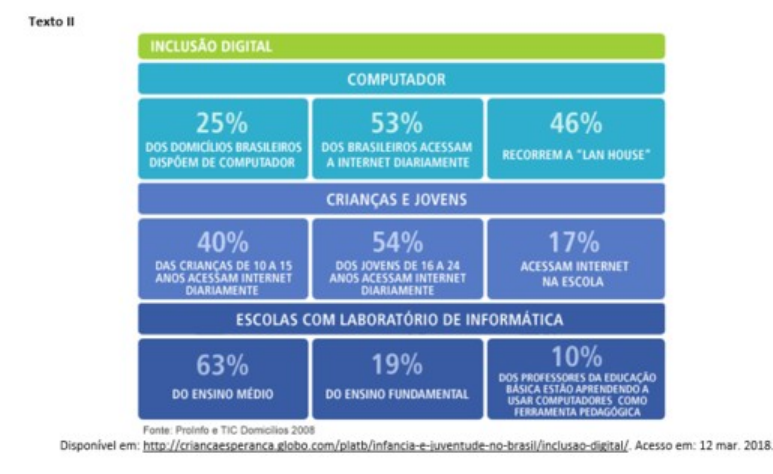 ENADE – INTRODUÇÃO AO SERVIÇO SOCIAL – SERVIÇO SOCIAL – 1° PERÍODO · LEIA OS TEXTOS A SEGUIR: TEXTO I A TECNOLOGIA TEM SE APRESENTADO COMO O PRINCIPAL FATOR DE PROGRESSO E DE DESENVOLVIMENTO. NO PARADIGMA ECONÔMICO VIGENTE, ELA É ASSUMIDA COMO UM BEM SOCIAL E, JUNTAMENTE COM A CIÊNCIA, É O MEIO PARA A AGREGAÇÃO DE VALORES AOS MAIS DIVERSOS PRODUTOS, TORNANDO-SE A CHAVE PARA A COMPETITIVIDADE ESTRATÉGICA E PARA O DESENVOLVIMENTO SOCIAL E ECONÔMICO DE UMA REGIÃO. FONTE: SILVEIRA, ROSEMARI; BAZZO, WALTER. CIÊNCIA, TECNOLOGIA E SUAS RELAÇÕES SOCIAIS: A PERCEPÇÃO DE GERADORES DE TECNOLOGIA E SUAS IMPLICAÇÕES NA EDUCAÇÃO TECNOLÓGICA. CIÊNCIA E EDUCAÇÃO. (BAURU) VOL.15 NO.3, 2009, P. 682. TEXTO II O ACESSO AO MUNDO DIGITAL É UM FATOR RELEVANTE PARA O MUNDO CONTEMPORÂNEO. ATRAVÉS DOS TEXTOS, ANALISE A INCLUSÃO DIGITAL NO BRASIL POR MEIO DO BINÔMIO INCLUSÃO/EXCLUSÃO: Resposta Marcada : O acesso às redes é um fator de inclusão, que não tem sido amplamente disseminado no Brasil e que gera a exclusão. PONTUAÇÃO TOTAL: 5PONTUAÇÃO OBTIDA 5 · HABILIDADE: IV – DOMINAR AS LINGUAGENS USADAS NOS PROCESSOS DE COMUNICAÇÃO, NOS ASPECTOS DA CRIAÇÃO E PRODUÇÃO HABILIDADES SECUNDÁRIAS: VII – DOMINAR O IDIOMA NACIONAL PARA ESCRITA E INTERPRETAÇÃO DE TEXTOS GERAIS E ESPECIALIZADOS NA ÁREA ASSUNTO: TECNOLOGIAS EM COMUNICAÇÃO/ SISTEMAS DE COMUNICAÇÃO/ COMPONENTE GERAL COMUNICAÇÃO SOCIAL UMA TECNOLOGIA QUE POSSIBILITA O ACESSO SEM FIO À INTERNET — POR ONDAS DE RÁDIO, MEDIANTE UM ADAPTADOR DE REDE PCI — EM BANDA LARGA, EM LOCAIS PÚBLICOS, TAIS COMO AEROPORTOS, HOTÉIS E CAFÉS, POR MEIO DE HOTSPOTS (PONTOS DE ACESSO), É REPRESENTADA PELA ABREVIATURA: Resposta Marcada : Wi-Fi. PONTUAÇÃO TOTAL: 5PONTUAÇÃO OBTIDA 5 · HABILIDADES:HABILIDADE: I – FAZER ESCOLHAS ÉTICAS, RESPONSABILIZANDO-SE POR SUAS CONSEQUÊNCIAS GOFFMAN REALIZOU UMA PESQUISA DE CAMPO NO STA. ELIZABETHS HOSPITAL, EM WASHINGTON D.C, EM 1955-1956, NOS ESTADOS UNIDOS, CUJO OBJETIVO ERA TENTAR CONHECER O MUNDO SOCIAL DO INTERNADO EM HOSPITAL, PROCURANDO CAPTAR A PERSPECTIVA SUBJETIVA DO INTERNADO. ELE PASSAVA OS DIAS COM OS PACIENTES E A DIREÇÃO DO HOSPITAL SABIA DOS SEUS OBJETIVOS. PARTINDO DESSA PESQUISA DE CAMPO E UTILIZANDO UMA AMPLA BIBLIOGRAFIA, O AUTOR ELABOROU O CONCEITO DE “INSTITUIÇÃO TOTAL”, CARACTERIZANDO-A PELO SEU “FECHAMENTO” MEDIANTE BARREIRAS QUE SÃO LEVANTADAS PARA SEGREGAR OS INTERNADOS DO CONTATO SOCIAL COM O MUNDO EXTERIOR. AS PROIBIÇÕES À SAÍDA ESTÃO MUITAS VEZES INCLUÍDAS NO PLANO FÍSICO E ARQUITETÔNICO DA MESMA. SEU TRAÇO PRINCIPAL É QUE ELA CONCENTRA TODOS OS DIFERENTES ASPECTOS DA VIDA DE UMA PESSOA (TRABALHO, LAZER, DESCANSO) NO MESMO LOCAL E SOB A AUTORIDADE DE UMA EQUIPE DIRIGENTE. FONTE: BENELLI, S.J. GOFFMAN E AS INSTITUIÇÕES TOTAIS EM ANÁLISE. IN: A LÓGICA DA INTERNAÇÃO: INSTITUIÇÕES TOTAIS E ASSUNTORES (DES)EDUCATIVAS.. SÃO PAULO: EDITORA UNESP, 2014, PP. 23-62. COM BASE NO TEXTO, ASSINALE A ALTERNATIVA CORRETA. Resposta Marcada : Essas instituições tiram do indivíduo seu sistema de apoio familiar e seu senso de identidade. PONTUAÇÃO TOTAL: 5PONTUAÇÃO OBTIDA 5 · Habilidades: I – fazer escolhas éticas, responsabilizando-se por suas consequências LEIA OS TEXTOS A SEGUIR. TEXTO I O ENSINO RELIGIOSO É MAIS DO QUE APARENTA SER, ISTO É, UM COMPONENTE CURRICULAR EM ESCOLAS. POR TRÁS DELE SE OCULTA UMA DIALÉTICA ENTRE SECULARIZAÇÃO E LAICIDADE NO INTERIOR DE CONTEXTOS HISTÓRICOS E CULTURAIS PRECISOS. O ESTADO SE TORNOU LAICO, VALE DIZER TORNOU-SE EQÜIDISTANTE DOS CULTOS RELIGIOSOS SEM ASSUMIR UM DELES COMO RELIGIÃO OFICIAL. A MODERNIDADE VAI SE DISTANCIANDO CADA VEZ MAIS DO CUJUS REGIO, EJUS RELIGIO [DO LATIM, “DE QUEM [É] A REGIÃO, DELE [SE SIGA] A RELIGIÃO”]. A LAICIDADE, AO CONDIZER COM A LIBERDADE DE EXPRESSÃO, DE CONSCIÊNCIA E DE CULTO, NÃO PODE CONVIVER COM UM ESTADO PORTADOR DE UMA CONFISSÃO. POR OUTRO LADO, O ESTADO LAICO NÃO ADOTA A RELIGIÃO DA IRRELIGIÃO OU DA ANTI-RELIGIOSIDADE. FONTE: CURY, C.R. ENSINO RELIGIOSO NA ESCOLA PÚBLICA: O RETORNO DE UMA POLÊMICA RECORRENTE. REVISTA BRASILEIRA DE EDUCAÇÃO, Nº 27. SÃO PAULO: 2004 (ADAPTADO). TEXTO II EM SESSÃO PLENÁRIA REALIZADA NA TARDE DESTA QUARTA-FEIRA (27), O SUPREMO TRIBUNAL FEDERAL (STF) JULGOU IMPROCEDENTE A AÇÃO DIRETA DE INCONSTITUCIONALIDADE (ADI) 4439 NA QUAL A PROCURADORIA-GERAL DA REPÚBLICA (PGR) QUESTIONAVA O MODELO DE ENSINO RELIGIOSO NAS ESCOLAS DA REDE PÚBLICA DE ENSINO DO PAÍS. POR MAIORIA DOS VOTOS (6 X 5), OS MINISTROS ENTENDERAM QUE O ENSINO RELIGIOSO NAS ESCOLAS PÚBLICAS BRASILEIRAS PODE TER NATUREZA CONFESSIONAL, OU SEJA, VINCULADO ÀS DIVERSAS RELIGIÕES. NA AÇÃO, A PGR PEDIA A INTERPRETAÇÃO CONFORME A CONSTITUIÇÃO FEDERAL AO DISPOSITIVO DA LEI DE DIRETRIZES E BASES DA EDUCAÇÃO – LDB (CAPUT E PARÁGRAFOS 1º E 2º, DO ARTIGO 33, DA LEI 9.394/1996) E AO ARTIGO 11, PARÁGRAFO 1º DO ACORDO FIRMADO ENTRE O BRASIL E A SANTA SÉ (PROMULGADO POR MEIO DO DECRETO 7.107/2010) PARA ASSENTAR QUE O ENSINO RELIGIOSO NAS ESCOLAS PÚBLICAS NÃO PODE SER VINCULADO A RELIGIÃO ESPECÍFICA E QUE FOSSE PROIBIDA A ADMISSÃO DE PROFESSORES NA QUALIDADE DE REPRESENTANTES DAS CONFISSÕES RELIGIOSAS. SUSTENTAVA QUE TAL ASSUNTO, CUJA MATRÍCULA É FACULTATIVA, DEVE SER VOLTADA PARA A HISTÓRIA E A DOUTRINA DAS VÁRIAS RELIGIÕES, ENSINADAS SOB UMA PERSPECTIVA LAICA. FONTE: STF CONCLUI JULGAMENTO SOBRE ENSINO RELIGIOSO NAS ESCOLAS PÚBLICAS, 27/09/2018. DISPONÍVEL EM: <HTTP://WWW.STF.JUS.BR/PORTAL/CMS/VERNOTICIADETALHE.ASP?IDCONTEUDO=357099>. ACESSO EM: 31 JUL. 2018. A PARTIR DA LEITURA DOS TEXTOS, ASSINALE A ALTERNATIVA CORRETA. Resposta Marcada : A decisão do STF conflita com o exposto no texto I, uma vez que a abertura para o ensino religioso confessional tende a priorizar religiões majoritárias. PONTUAÇÃO TOTAL: 5PONTUAÇÃO OBTIDA 5 Total20 / 20