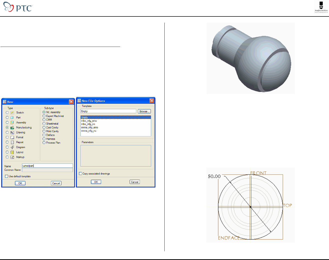 Tutorial de Torneamento D Cheshire 1 de 11 Este tutorial é uma tradução do texto do Prof. David Cheshire da Universidade de Staffordshire e apresenta os procedimentos para criação de processos de torneamento no ProE Wildifre 2.0, semelhantes aos utilizados para os pro- cessos de fresamento vistos no tutorial anterior. Para utilizá-lo deve-se descarregar o modelo Torneado.prt disponível no site da disciplina EM921. Setup do Torneamento Crie um novo arquivo para este tutorial através dos comandos FILE > NEW. Selecione MANUFACTURING e NC ASSEMBLY (Figura 1 esquerda) e dê o nome Torneamento, ou outro qualquer. Na caixa New File Options escolha EMPTY (Figura 1 direita). Figura 1 : Criando um novo arquivo Manufacturing O arquivo criado está pronto para armazenar todas as informações sobre os processos. Os primeiros dados a serem inseridos referem-se à peça a ser torneada, que será especificada pelos comandos no menu à direita na tela MFG MODEL � ASSEMBLE � REF MODEL escolhendo Torno.prt da lista de arquivos. Após a peça aparecer na tela do ProE escolha DONE/RETURN. Figura 2 : Peça a ser torneada Para auxiliar a visualização do processo, apesar de não ser essencial, pode- se definir o tarugo a partir do qual a peça será torneada. Para tanto, escolha MFG MODEL � CREATE � WORKPIECE e defina um nome, como por exemplo tarugo. Escolha PROTRUSION � EXTRUDE | SOLID | DONE para iniciar o modelo de estrusão . Se você já é usuário do ProE, não terá dificuldades com esses procedimentos. Inicie o sketch escolhendo PLACEMENT e DEFINE no menu à esquerda. Na peça, Escolha o plano RIGHT para ser o plano de sketching e então escolha o plano TOP como o plano d ereferência. No sketcher escolha os planos FRONT e TOP como referências. Desenhe um círculo com 50 mm de diâmetro para representar o tarugo do qual a peça será torneada. Figura 3 : Sketch do tarugo s s Torneamento D Cheshire 2 de 11 Saia do sketcher e defina um comprimento de 75 mm para a extrusão. Um cilindro de tamanho idêntico ao da barra do tarugo que será torneada será mostrado juntamente com a peça . Após clicar em Check para sair do modo de sketch, o tarugo será mostrado transparente. Figura 4: Peça e tarugo Para a usinagem é essencial que seja definida a origem (0,0,0) para processo. No tornemaento é comum usar-se o centro da extremidade da peça como zero-peça. No ProE isto é conseguido com o sistema de coordenadas, que para ser criado selecioneINSERT > MODEL DATUM > COORDINATE SYSTEM. O sistema de coordenadas é então mostrado. Este é um procedimento inteligente que fornece as opções adequadas para seleção. Clique nos planos FRONT, TOP e ENDFACE com a tecla CTRL acionada. O novo sistema de coordenadas é criado na intersecção desses três planos. Com os controles do tab de diálogo ORIENTATION garanta que o eixo Z neste sistema esteja apontando na direção do eixo da peça. Verifique também que o sentido positivo de Z aponte para fora da peça. Se não estiver, clique em FLIP. Figura 5 : Definição do sistema de coordenadas É essencial que Z positivo esteja corretamente orientado pois esse eixo define o eixo de rotação para o torneamento. Clique OK para fechar a caixa de diálogo e ACS0 deverá aparecer no menu-árvore do modelo. Também é importante definir-se a localização da posição de retorno da ferramenta após cada corte. Para especificar esse localde retorno define-se um ponto com INSERT > MODEL DATUM > POINT > OFFSET CORDINATE SYSTEM... Como ponto de referência, escolha o sistema de coordenadas ACS0. Digite o nome que pode ser RETORNO, digite 30 na coluna X e 5 na coluna Z. Clique OK para fechar o diálogo e criar o ponto. Definição da operação de usinagem Uma operação de usinagem é o termo usado no ProE para definir o tipo de máquina- ferramenta que será usada para uma seqüência de etapas de usinagem. Escolha MACHINING no menu lateral e o diálogo da Figura 6 é mostrado para definir-se a operação. Digite o nome Torneamento ou outro nome para essa operação. Depois selecione para abrir o diálogo NC Machine e digite o nome do torno. Escolha um tipo de torno (Figura 6 - direita) e clique OK para retornar ao menu Operation Setup. Posteriormente, clique ao lado de Machine Zero e clique no sistema de coordenada ACS0. Feche o diálogo com OK. Figura 6 : Caixas de diálogo Operation Setup e Machine Tool Setup Torneamento D Cheshire 3 de 11 Definção da etapa de desbaste Para obter essa peça por torneamento, serão utilizadas etapas de desbaste, acabamento, sangramento e furação. Para definir a primeira etapa de desbaste, escolha o comando MACHINING � NC SEQUENCE � MACHINING | AREA | DONE. Uma série de parâmetros é disponibilizado: Name, Tool, Parameters, Start e End devem estar selecionados, depois escolha DONE. Digite o nome Desbaste. Entre os valores para as ferrametnas como mostrado na Figura 7a e APPLY OK. Figura 7 : Parâmetros da ferramenta e da etapa de desbaste No menu MFG Params escolha SET e digite os valores mostrados na Figura 7b, depois File > Exit e DONE. Depois defina a posição inicial cli- cando no ponto RETORNO definido anteriormente. Clique novamente nesse ponto para definir a posição final dessa etapa de usinagem. Depois, será mostrado o diálogo CUSTOMIZE que possibilita definir-se a geometria que será torneada. Escolha INSERT para definir o novo corte e depois escolha CREATE PROFILE. O ProE disponibiliza vários modos para gerar-se o perfil que será usinado. Um desses modos é o comando SECTION | DONE option. Figura 8 : A caixa de diálogo Customize Após essa opção, uma linha será mostrada ao redor da peça no plano de corte. Uma cruz é mostrado em cada canto dessa linha. Escolha as duas cruzes mostradas na Figura 9a para limitar a extensão do corte. Depois escolha ABOVE CTRLN > DONE e se necessário, TOGGLE PROFILE para fazer que a curva mostrada na Figura 9a fique azul, antes de concluir com DONE/RETURN