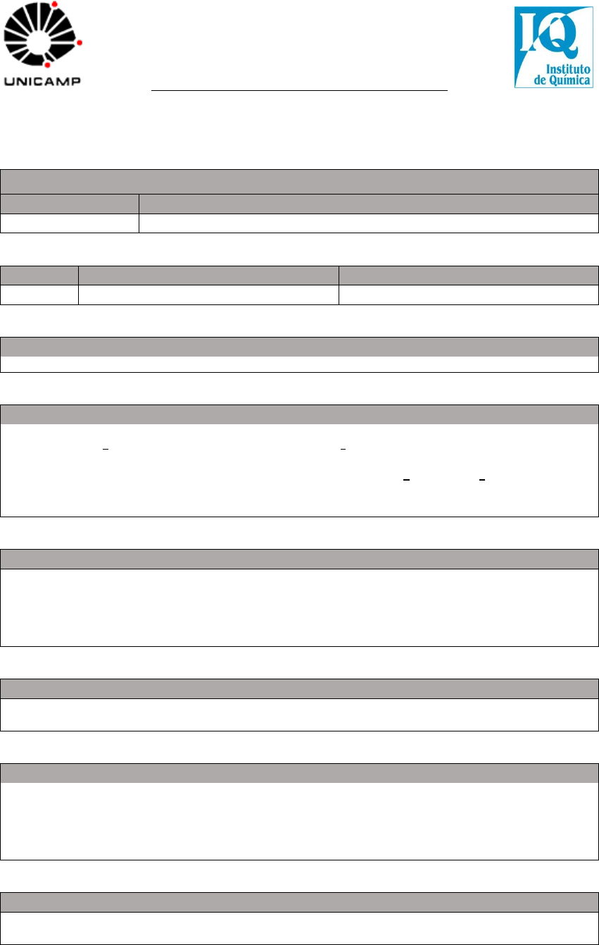 UNIVERSIDADE ESTADUAL DE CAMPINAS INSTITUTO DE QUÍMICA PLANO DE DESENVOLVIMENTO DE DISCIPLINA 1 º Semestre 2022 Disciplina Código Nome QA481 Métodos de Separação Turmas Horário Local A Seg: 19/21 IQ05 Docentes José Alberto Fracassi da Silva, fracassi@unicamp.br, sala E-211. Disciplinas do 1S/2022 A condução das disciplinas do 1S/2022 está normatizada pela GR 74/2021 que estabelece em seu Art. 1o - As aulas teóricas e práticas do 1o semestre de 2022 serão presenciais, sendo que as aulas teóricas deverão ser realizadas com até 100% da lotação estabelecida da sala de aula, caso não haja restrições sanitárias e no §1o do Art. 1o. - As condições sanitárias serão orientadas pelo Comitê Científico de Contingência do Coronavírus da Unicamp previamente ao começo do semestre. Forma de Condução/Organização da Disciplina e das Avaliações As aulas expositivas serão conduzidas presencialmente utilizando os recursos audiovisuais disponíveis na sala, como computador com projetor. Material adicional para leitura será fornecido aos alunos, como, por exemplo, artigos publicados em periódicos. Os tópicos serão abordados de acordo com o calendário da disciplina. A avaliação será feita através da aplicação de duas provas presenciais (P1 e P2). Prazos de Entrega das Atividades e dos Resultados das Avaliações A prova P1 será aplicada no dia 25/04 e a prova P2 no dia 20/06. O conteúdo das provas não será acumulativo. Critérios de Avaliação e Aprovação A nota parcial da disciplina (Np) será a média aritmética das notas de prova: Np = (P1+P2)/2. Se Np for igual ou superior a 5,0 o aluno estará aprovado na disciplina. Caso o aluno obtenha Np inferior a 5,0 e superior a 2,5, será aplicado exame escrito (E) e a nota final (Nf) será calculada como: Nf = (E+Np)/2. Se o aluno obtiver Np inferior a 2,5 estará automaticamente reprovado na disciplina. A frequência mínima na disciplina é 75%. Forma de Atendimento Extra-Classe Atendimento extra-classe para elucidação de dúvidas e auxílio na elaboração dos trabalhos poderão ser feitos mediante demanda e pré-agendamento diretamente com o docente. Calendário Data Atividade 14/03 Apresentação. Conceitos básicos 21/03 Conceitos básicos, cromatografia em camada delgada e coluna 28/03 Cromatografia líquida de alta eficiência 04/04 Cromatografia líquida de alta eficiência 11/04 Cromatografia líquida de alta eficiência 18/04 Revisão, Exercícios 25/04 PROVA 1 02/05 Cromatografia gasosa 09/05 Cromatografia gasosa 16/05 Cromatografia gasosa 23/05 Eletroforese Capilar 30/05 Eletroforese Capilar 06/06 Eletroforese Capilar 13/06 Revisão, Exercícios 20/06 PROVA 2 18/07 Semana de estudos 25/07 Exames finais do 1º período letivo de 2022. Outras informações relevantes (1) Art. 56 do Regimento Geral de Graduação: São condições para aprovação: II - nas disciplinas em que nota e frequência são adotadas como forma de avaliação – obter nota final igual ou superior a 5,0 (cinco vírgula zero) e a frequência mínima estabelecida para a disciplina no Catálogo dos Cursos de Graduação; a frequência mínima de 75%. (2) Sobre o Abono de Faltas: os critérios do Abono de Faltas são definidos pelo artigo 72, do Regimento Geral de Graduação. (3) Quaisquer alterações no PDE, propostas pelo(a) Docente ou Discentes, no transcorrer do semestre, só poderão ser realizadas mediante a concordância do(a) Docente e Discentes, e autorização da Comissão de Graduação. SEGUEM A EMENTA, PROGRAMA E BIBLIOGRAFIA