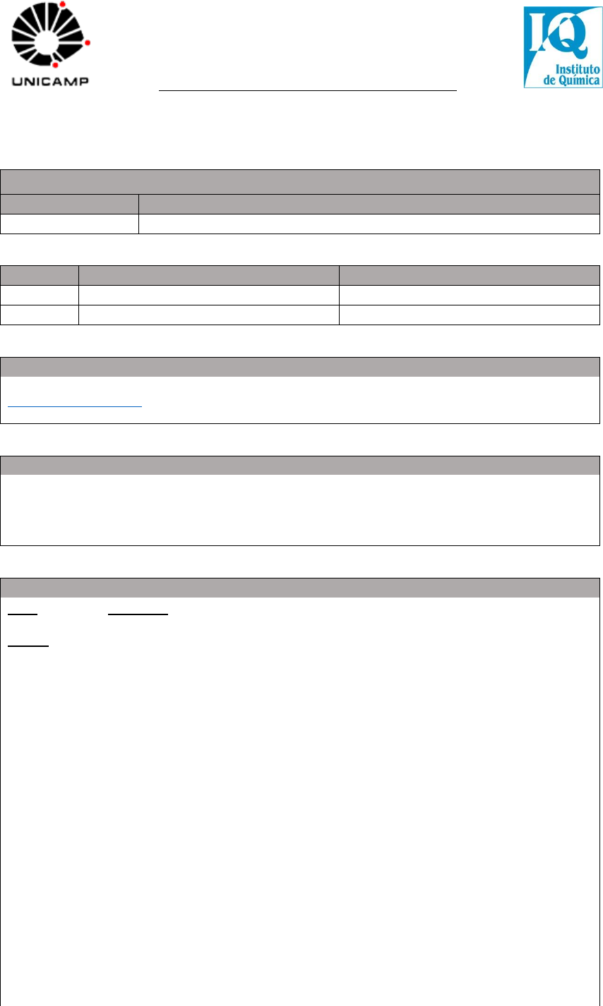 UNIVERSIDADE ESTADUAL DE CAMPINAS INSTITUTO DE QUÍMICA PLANO DE DESENVOLVIMENTO DE DISCIPLINA 1º Semestre - 2020 Disciplina Código Nome QF 431 Físico-Química I Turmas Horário Local A QUI 16-18 e SEX 14-16 IQ 04 Docentes Maria Isabel Felisberti misabel@unicamp.br Instituto de Química - Lab. I-144, sala I-116, Bloco I Critérios de Avaliação e Aprovação 3 Provas Média de Provas 5 e Notas nas 3 provas ≥ 4 Aprovado Média de Prova < 5 ou nota em pelo menos uma prova < 4 Exame Média Final = (Média de Provas + Nota de Exame)/2 5 Aprovado Calendário Data Atividade Março 5 Apresentação da disciplina (ementa, programa e bibliografia); critério de avaliação e calendário. Gases. Leis Empíricas. Lei Zero da Termodinâmica. Modelo de Gases Perfeitos. 6 Equação de Estado. Misturas de Gases. Gases Reais. Fator de Compressibilidade. Coeficientes Viriais. Condensação. Equação de van der Waals. 12 Princípio dos Estados Correspondentes. 1ª Lei da Termodinâmica. Trabalho, Calor e Energia Interna. Capacidade calorífica Cv. 13 Função de Estado. Trabalho: reversível e irreversível. Entalpia e capacidade calorífica - Cp. Transformações adiabáticas. 10 Expansão adiabática vs. Expansão Isotérmica. Resolução de Exercícios. 20 Pressão Interna. Experiência de Joule. Variações da Energia Interna. 26 Variações da Entalpia. Coeficientes de Joule-Thomson e de Joule Thomson isotérmico mailto:misabel@unicamp.br 27 Relação entre Cp e Cv. Termoquímica. Lei de Hess. Abril 2 Cálculo de Entalpia de formação, transição e reação. Dependência de H com a temperatura. 3 Resolução de Exercícios 9 Não haverá atividades. 10 Não haverá atividades. 16 1ª Prova 17 2ª lei da Termodinâmica. Ciclo de Carnot. Entropia como função de estado. Desigualdade de Clausius. Enunciado da 2ª Lei 23 Cálculo da Variação de Entropia de processos: transições de fases, expansão/compressão, aquecimento/resfriamento, transferência irreversível de calor, transições irreversíveis e de misturas. 24 Terceira Lei da Termodinâmica. Entropia Padrão de Reação. Energia Livre de Helmholtz. Energia Livre de Gibbs. 30 Energia Livre e Trabalho. Energia Livre de Gibbs padrão molar de formação e de reação. Formalismo da 2ª Lei da Termodinâmica: equações de Maxwell. MAIO 7 Aplicação das equações de Maxwell. Dependência da Energia Livre com a Temperatura e com a Pressão. 8 Fugacidade e Coeficiente de Fugacidade. Potencial Químico. 14 Resolução de Exercícios. 15 2ª Prova 21 Transformações de Fases de Substâncias Puras: Fases e Diagramas de Fases. Curvas de Coexistência, Ponto Triplo e Ponto Crítico. 22 Equação de Clausius-Clapeyron: Curvas de Coexistência S-L, S-V e L-V. Transições de Fases: Classificação de Ehrenfast. 28 Misturas Simples. Grandezas Parciais Molares. Equação de Gibbs-Duhem. Energia Livre de Mistura para Gases Perfeitos. 29 Potencial Químico: Líquidos Puros e em Solução. Lei de Raoult. Lei de Henry. Soluções Ideais. Soluções regulares. Soluções Reais. Grandezas de Excesso. JUNHO 4 Propriedades Coligativas. Atividade. Coeficiente de Atividade. 5 Energia Livre de Mistura de Soluções Reais. Diagrama de Fases: Regra de Fases. 11 Não haverá atividades. 12 Não haverá atividades. 18 Diagramas de 2 Componentes. Diagrama Pressão de Vapor vs. Composição das Fases Líquida e Vapor. Regra da Alavanca. 19 Diagramas Temperatura x Composição: Diagramas Líquido-Vapor. Azeótropos. Destilação. Diagrama Líquido-Líquido. 25 Critérios de Miscibilidade. Comportamento UCST e LCST. Diagramas de Fase Sólido- Líquido. Eutético. 26 Resolução de Exercícios. JULHO 2 3ª Prova 16 EXAME Outras informações relevantes Não haverá provas substitutivas. SEGUEM A EMENTA, PROGRAMA E BIBLIOGRAFIA