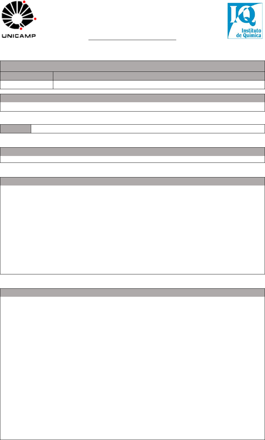UNIVERSIDADE ESTADUAL DE CAMPINAS INSTITUTO DE QUÍMICA PROGRAMAS E BIBLIOGRAFIAS Disciplina Código Nome QA583 Preparo de Amostras Ementa Fundamentos das técnicas de preparo de amostras para analitos inorgânicos e orgânicos. Programa A sequência analítica. Fonte de erros no preparo de amostra. Fundamentos das técnicas de preparo de amostras para determinação de analitos inorgânicos. Técnicas de decomposição: via seca, frasco de Shöniger, fusão, tubo de combustão, Fenton, Kjeldahl e Carius. Decomposição empregando altas pressões: bombas de decomposição, incineradores a alta pressão, emprego da radiação micro-onda na decomposição/extração. Emprego e discussão das fontes auxiliares na conservação e no preparo de amostras: liofilização, ultrassom e laser. Fundamentos das técnicas de preparo de amostras para analitos orgânicos. Processos de transferência de fases: partição, adsorção e volatilização. Classificação das técnicas de preparo de amostra para analitos orgânicos. Extração líquido- líquido. Extração em fase sólida. Extração sólido-líquido (soxhlet; extração por fluidos pressurizados, por água superaquecida e por fluidos supercríticos; extração assistida por ultrassom e por micro-ondas; QuEChERS). Microextração e técnicas correlatas. Técnicas de headspace. Bibliografia 1. Arruda, M.A.Z. (Ed) Trends in sample Preparation, 1st ed., Nova Science Co, 2007. 2. Bock, R. A handbook of decomposition methods in analytical chemistry, 1st ed., International Textbook Co., 1979. 3. Flores, E.M.M. (Ed.) Microwave-assisted sample preparation for trace element analysis, 1st ed., Elsevier, 2014. 4. Kingston, H.M. and Haswell, S.J. Microwave-Enhanced Chemistry – Fundamentls, Sample Preparation and Applications, 1st ed., ACS, 1997. 5. Sulcek, Z. and Povondra, P., Methods of Decomposition in Inorganic Analysis, 1st ed., CRC Press, 1989. 6. Pawliszyn, J. and Lord, H. (Ed.). Handbook of Sample Preparation. Wiley, New York, 2010. 7. Mitra, S. (Ed.). Sample Preparation Techniques in Analytical Chemistry. Wiley.; Hoboken, 2002. 8. Krug, F.J.; Rocha, F.R.P. (Ed.). Métodos de Preparo de Amostras para Análise Elementar, Ed. SBQ, São Paulo, 2016. 9. Skoog, D.A.; West, D.M.; Holler F.J.; Crouch, S.R., Fundamentos de Química Analítica, Tradução da 9a edição Norte-Americana, CENGAGE Learning, São Paulo, 2015. 10. Figueiredo, E. C.; Borges, K.B.; Queiroz, M.E.C. Preparo de Amostras para Análise de Compostos Orgânicos , LTC-GEN, Rio de Janeiro, 2015. Vetor OF:S-5 T:002 P:000 L:000 O:000 D:000 HS:002 SL:002 C:002 AV:N EX:S FM:75% Pré-Req QA381 QA383 QA481 QA483 2 Critérios de Avaliação Critérios de avaliação definidos pelo Professor, com base no disposto na Seção I – Normas Gerais, Capítulo V – Da Avaliação do Aluno na Disciplina, do Regimento Geral de Graduação. Frequência: 75 % (* O abono de faltas será considerado dentro do previsto no capítulo VI, seção X, artigo 72 do Regimento Geral de Graduação)